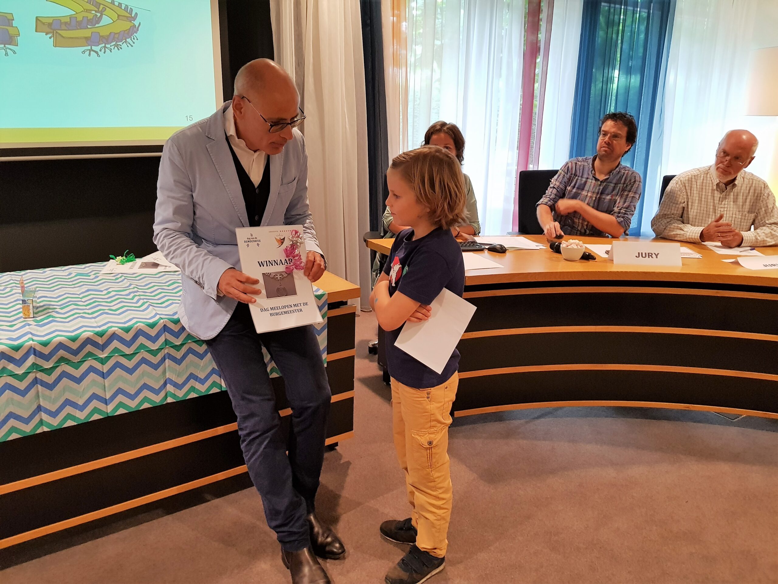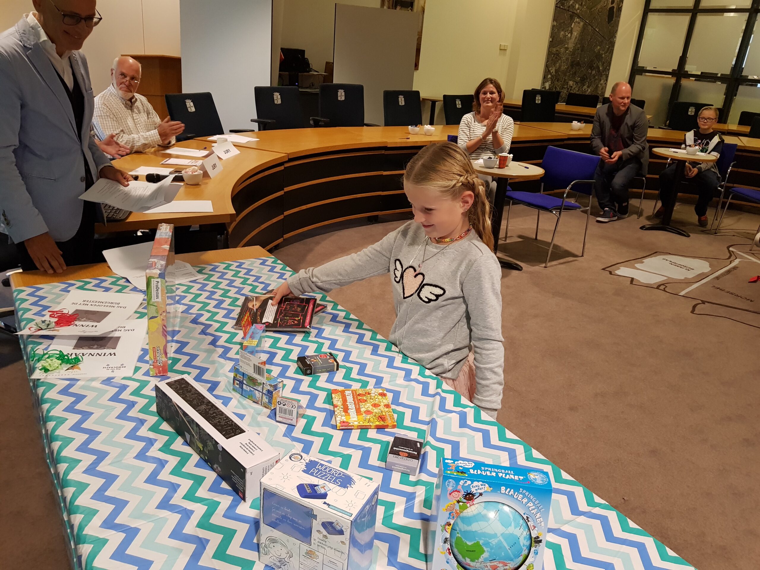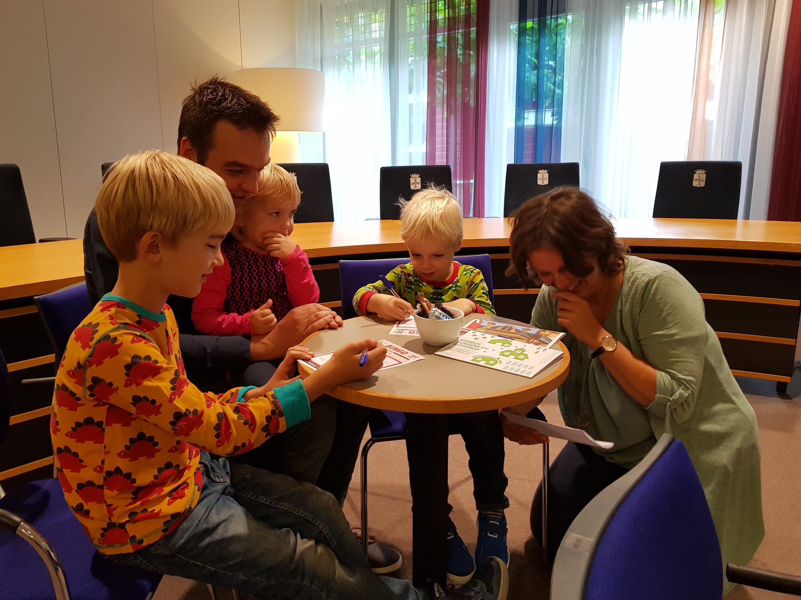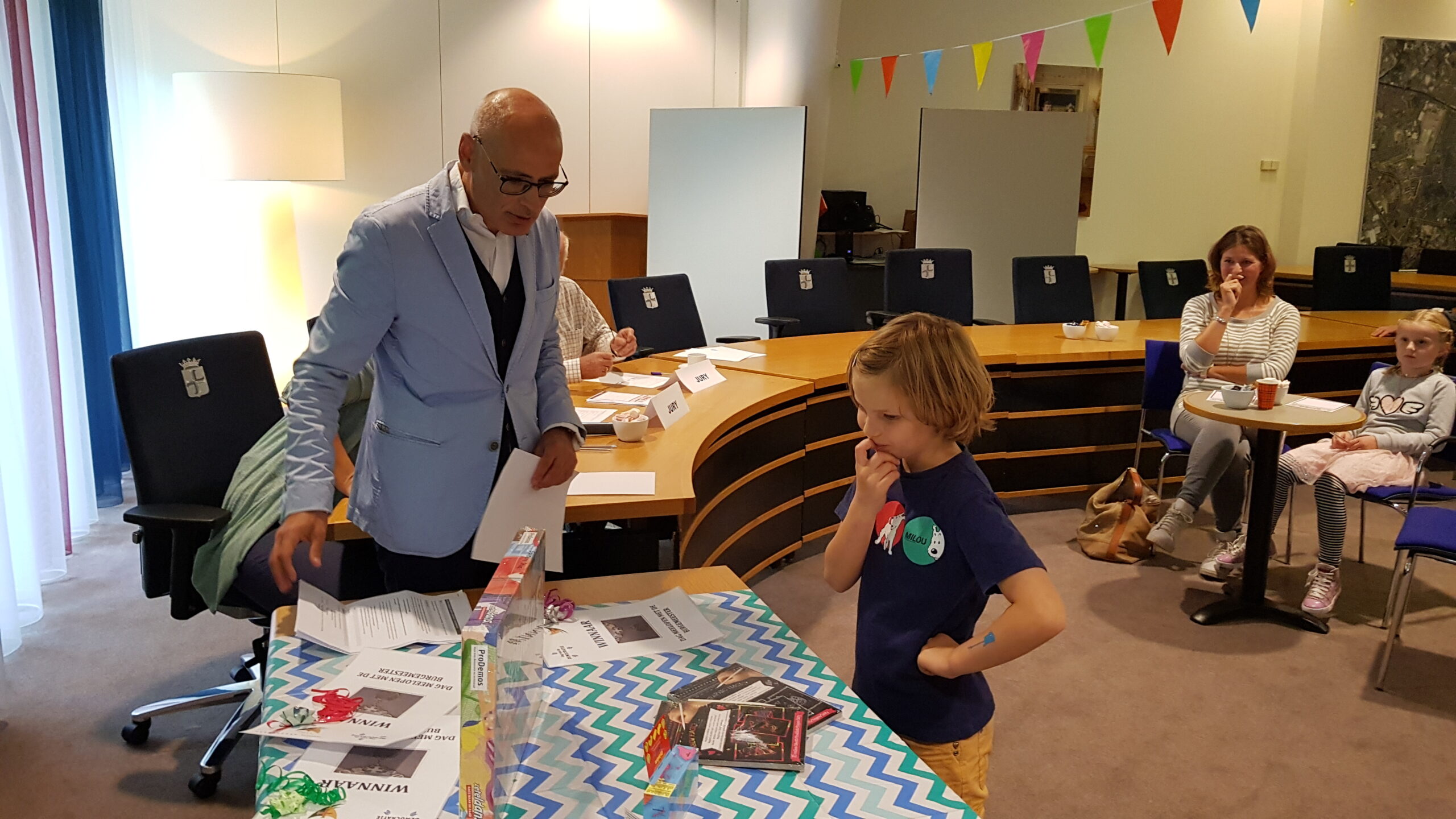 Burgemeester Jaensch van Oegstgeest stelde de vragen bij de bingo en de hoofdprijs, een dagje meelopen met de burgemeester, eindigt als het aan de zesjarige winnares Elize ligt in zwembad Poelmeer. “Maar misschien durft ‘ie wel helemaal niet te zwemmen omdat hij geen diploma heeft,” opperde de winnares. “Ik heb een beetje watervrees,” gaf Jaensch wel toe. Maar een leuke dag gaan ze er zeker van maken.