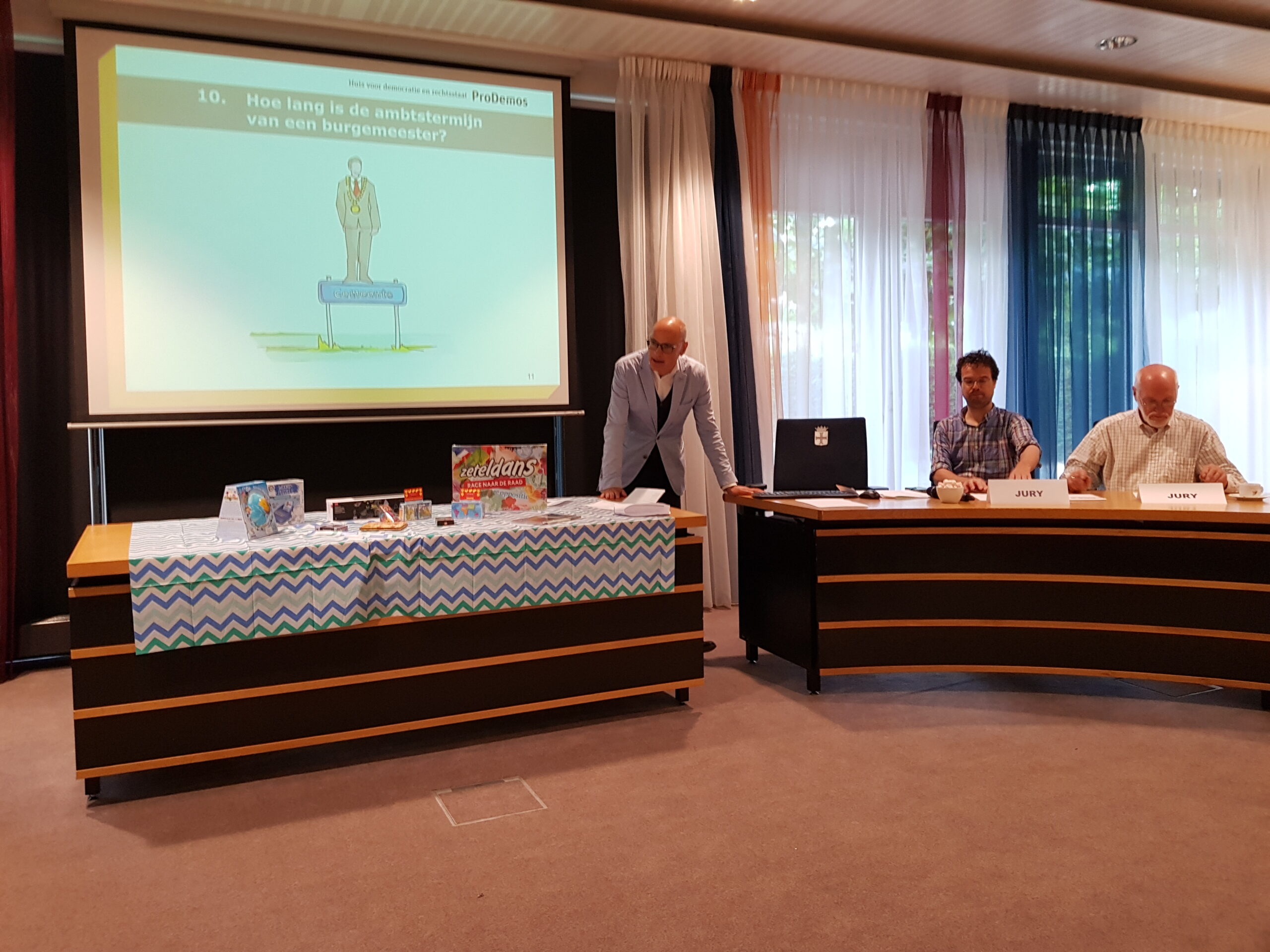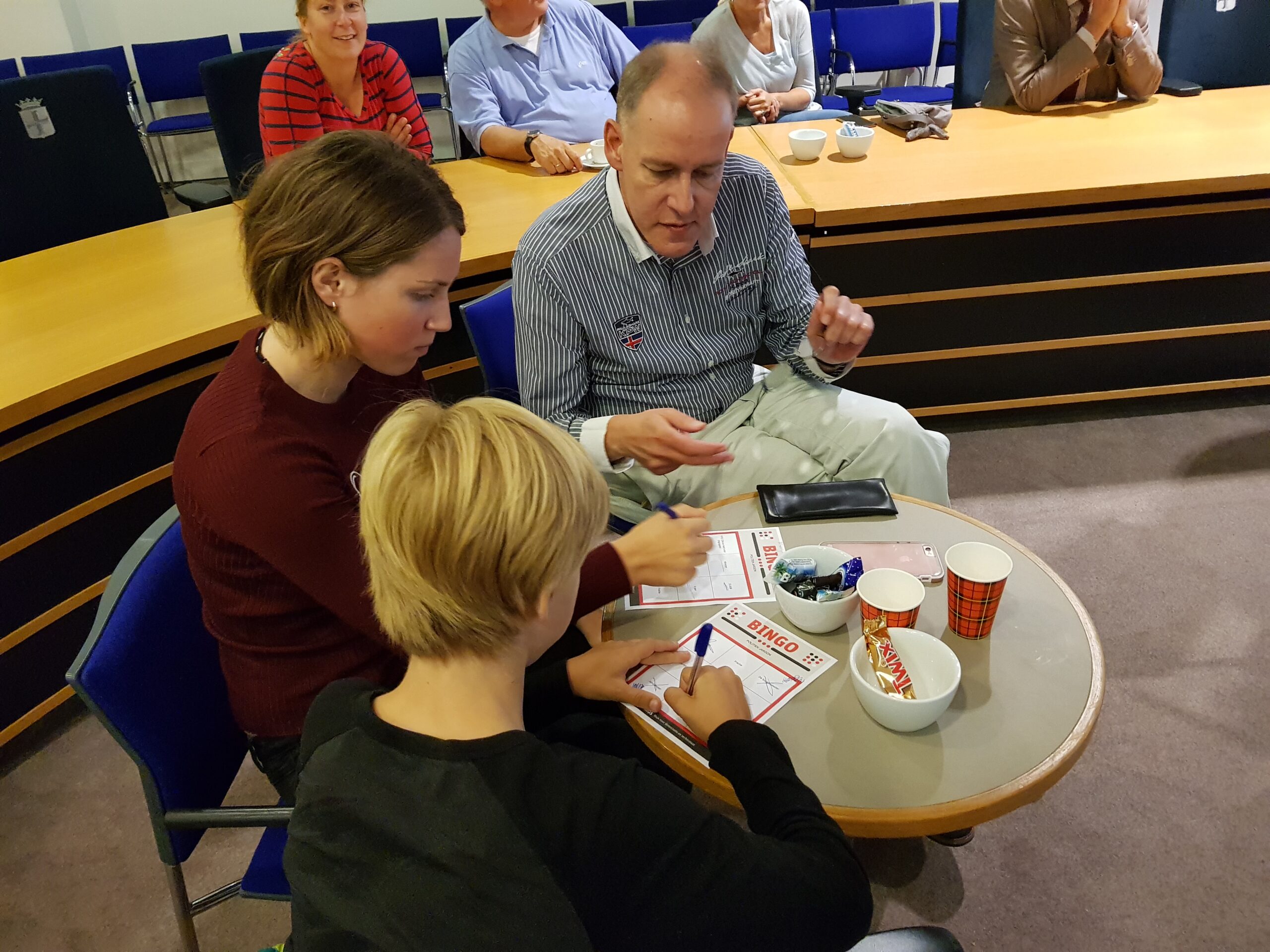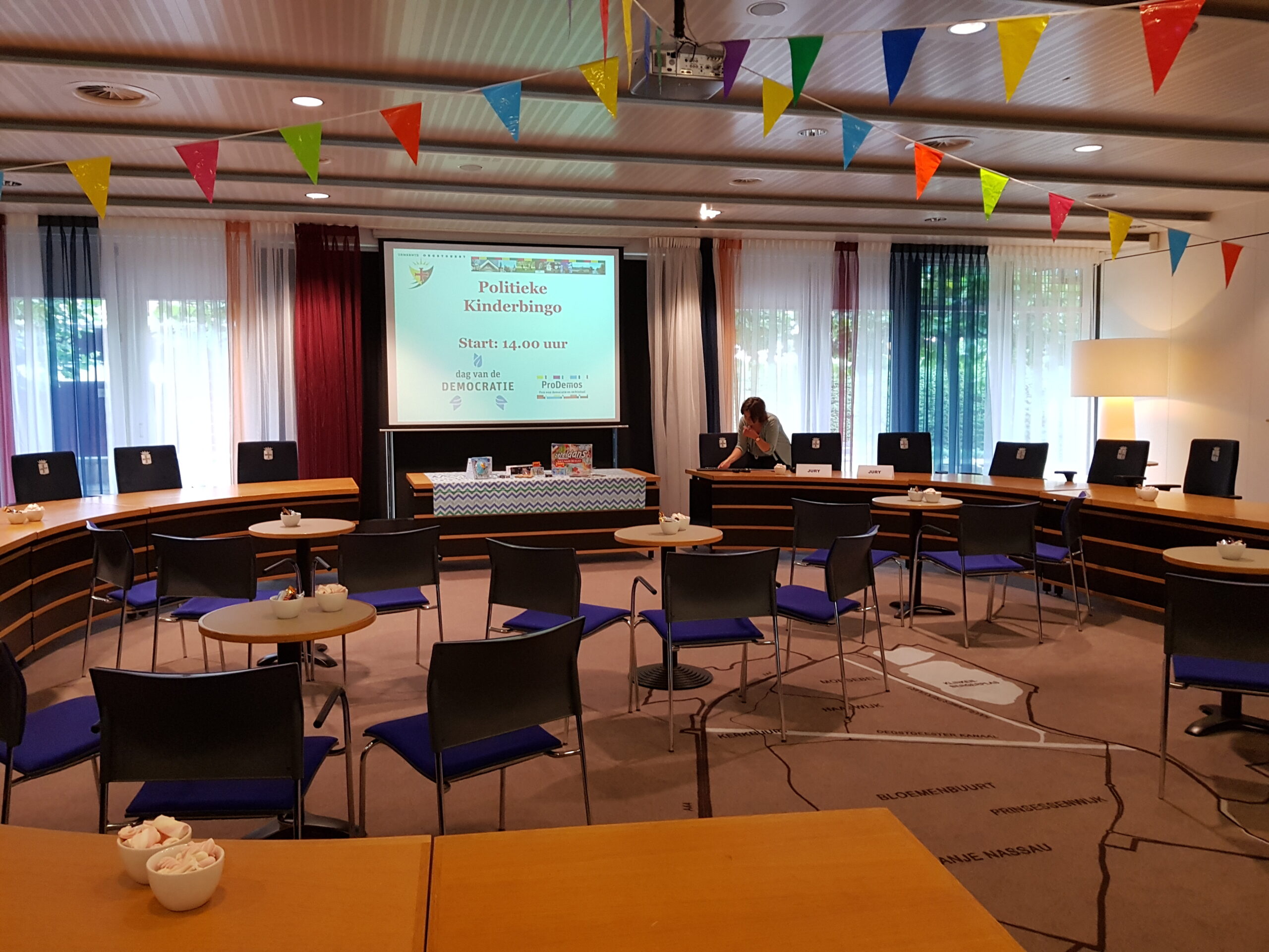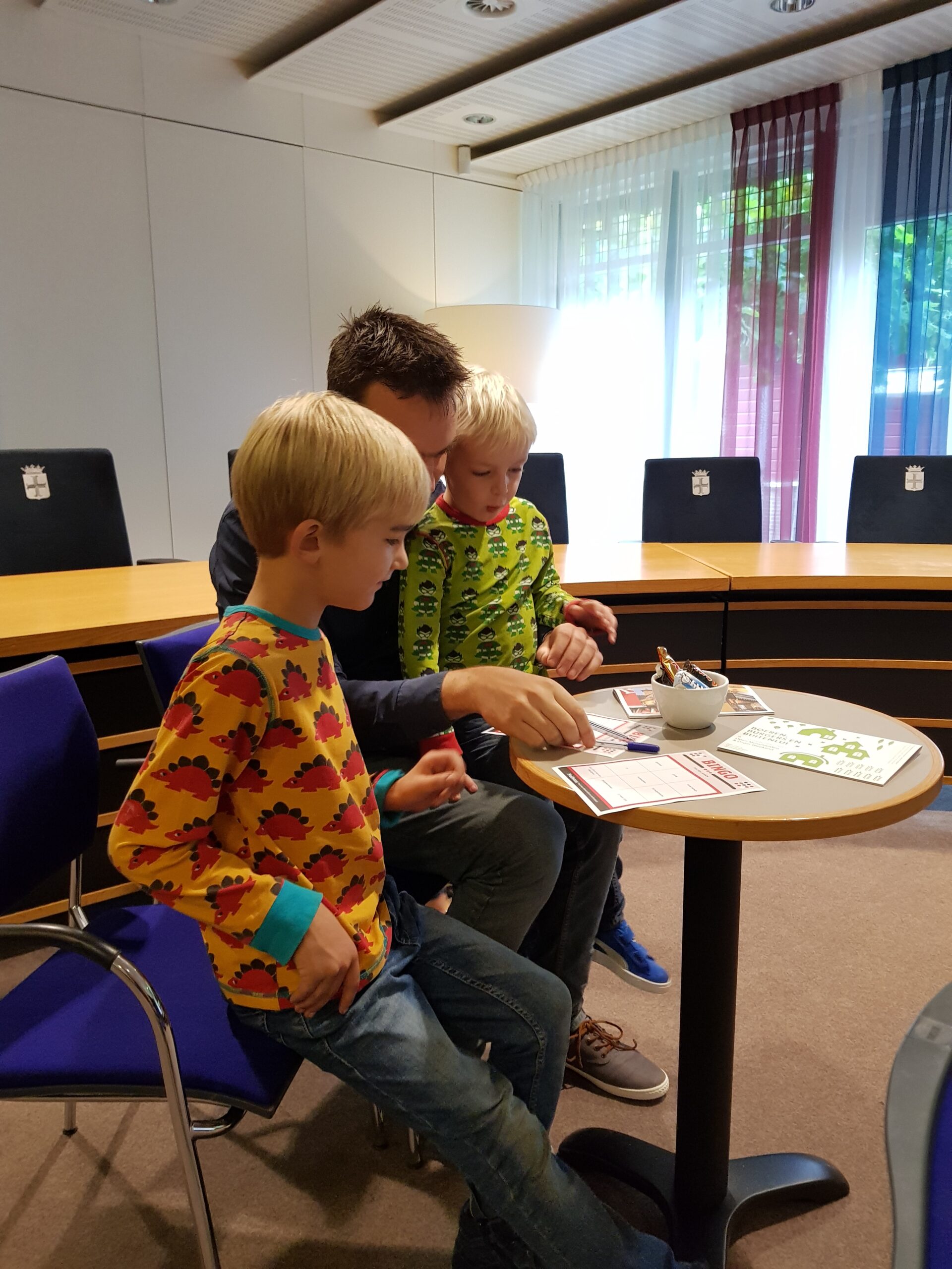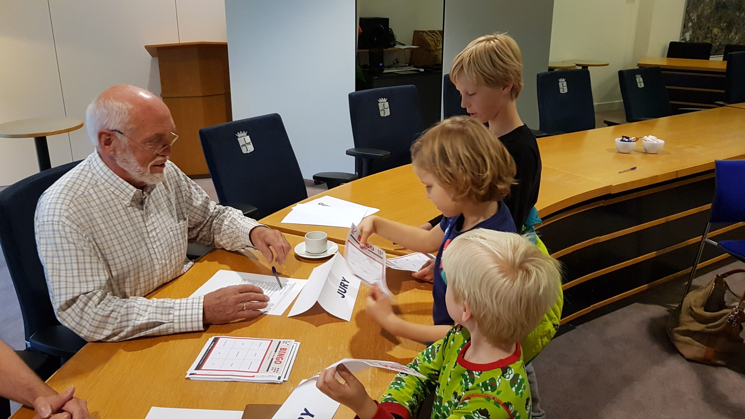 Burgemeester Jaensch van Oegstgeest stelde de vragen bij de bingo en de hoofdprijs, een dagje meelopen met de burgemeester, eindigt als het aan de zesjarige winnares Elize ligt in zwembad Poelmeer. “Maar misschien durft ‘ie wel helemaal niet te zwemmen omdat hij geen diploma heeft,” opperde de winnares. “Ik heb een beetje watervrees,” gaf Jaensch wel toe. Maar een leuke dag gaan ze er zeker van maken.