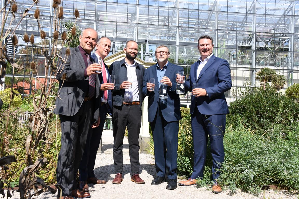De Leidse estafette ging van start in de Hortus Botanicus. Daar overhandigden burgemeester Lenferink en directeur Wim Drossaert van Dunea de de eerste twaalf karaffen aan directeur Paul Keβler van de Hortus en aan de cateraar van de Hortus, Robin van der Schuyt van Van der Linde Catering. Van der Schuyt gaf het stokje op zijn beurt door aan Sander Lares, eigenaar van Restaurant De Engelenbak.