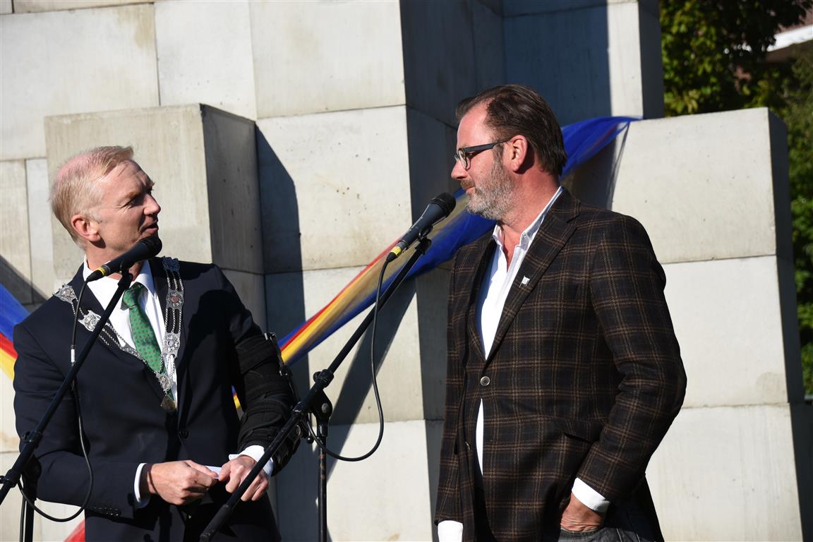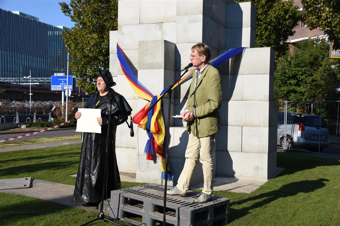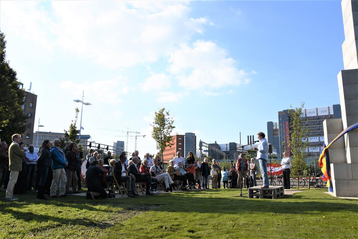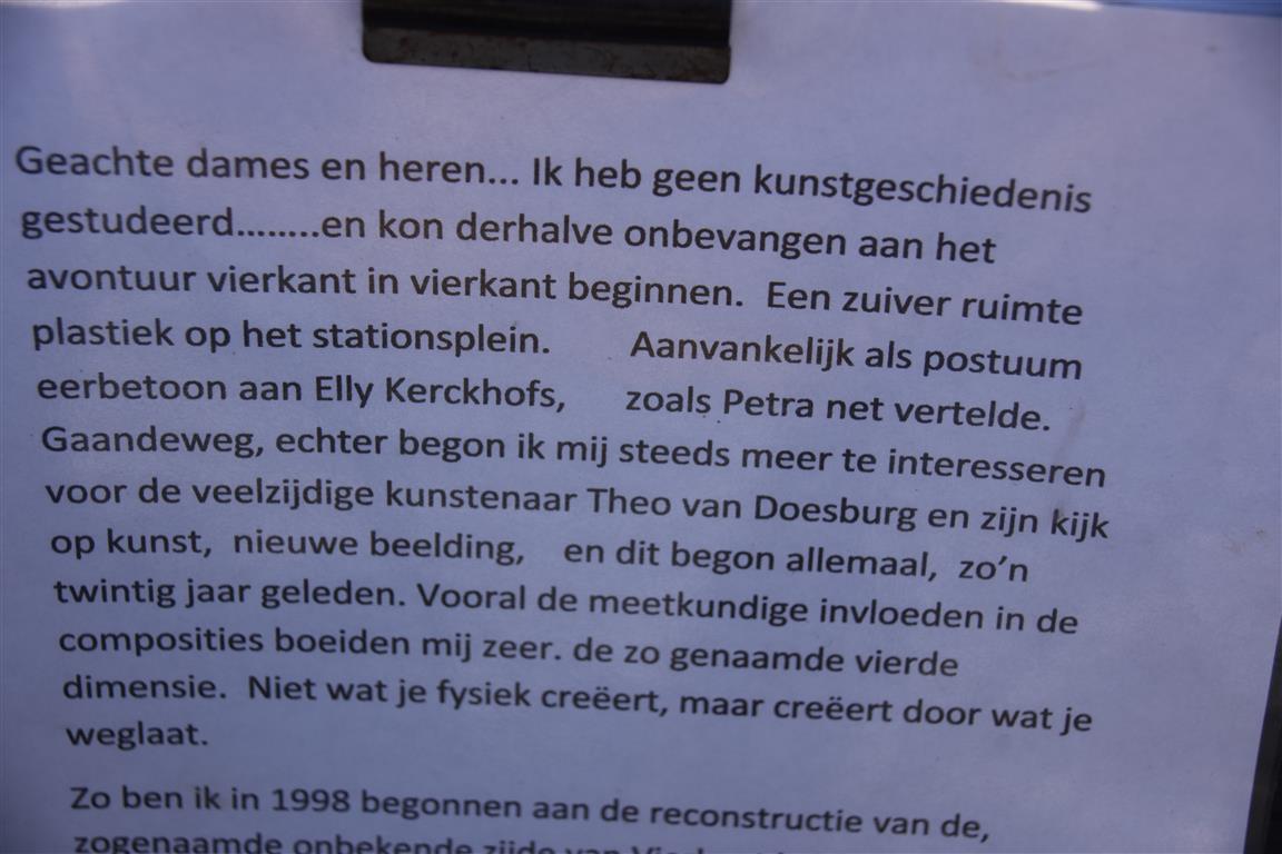 In zijn toespraak dankte wethouder Robert Strijk de vele vrijwilligers voor hun tomeloze inzet die ertoe heeft geleid dat dit monument voor Theo van Doesburg nu is gerealiseerd. Walter van Peijpe onderstreepte het belang van Vierkant in Vierkant voor Leiden omdat het laat zien dat Leiden, naast cultuurstad van de 17e eeuw met Rembrandt, Gerrit Dou en Jan van Goyen, ook de stad is van de vernieuwing en de dynamiek belichaamd in De Stijl. Vierkant in Vierkant als inspiratie voor de stad van de toekomst.