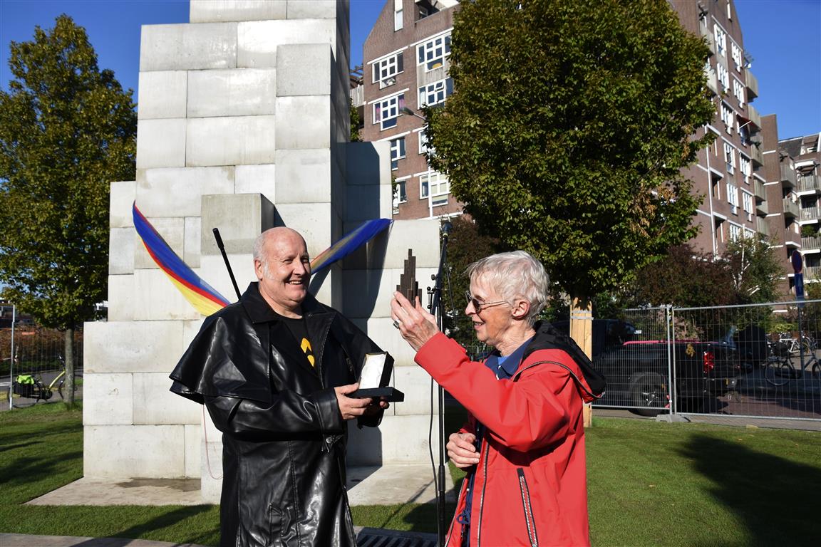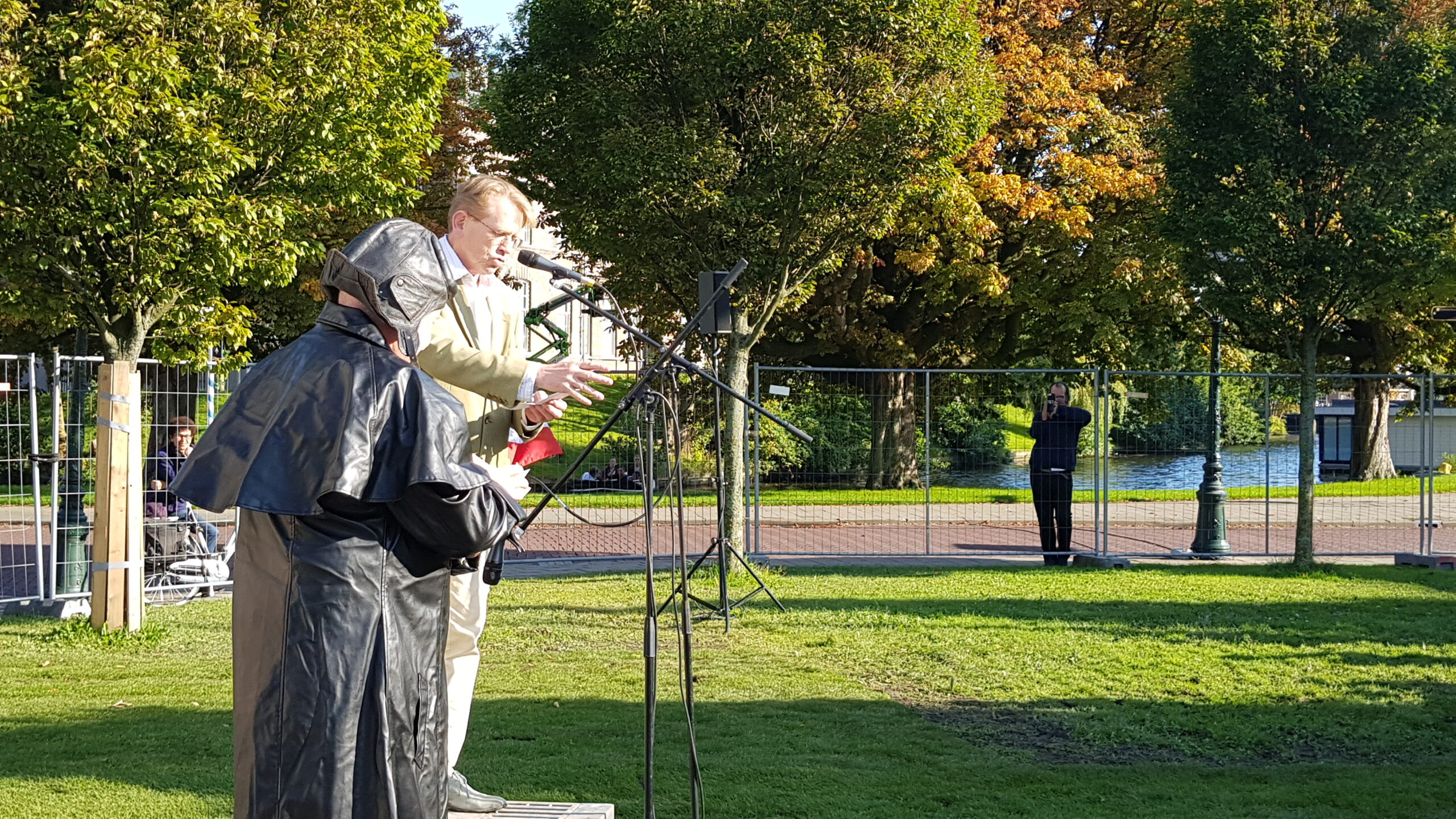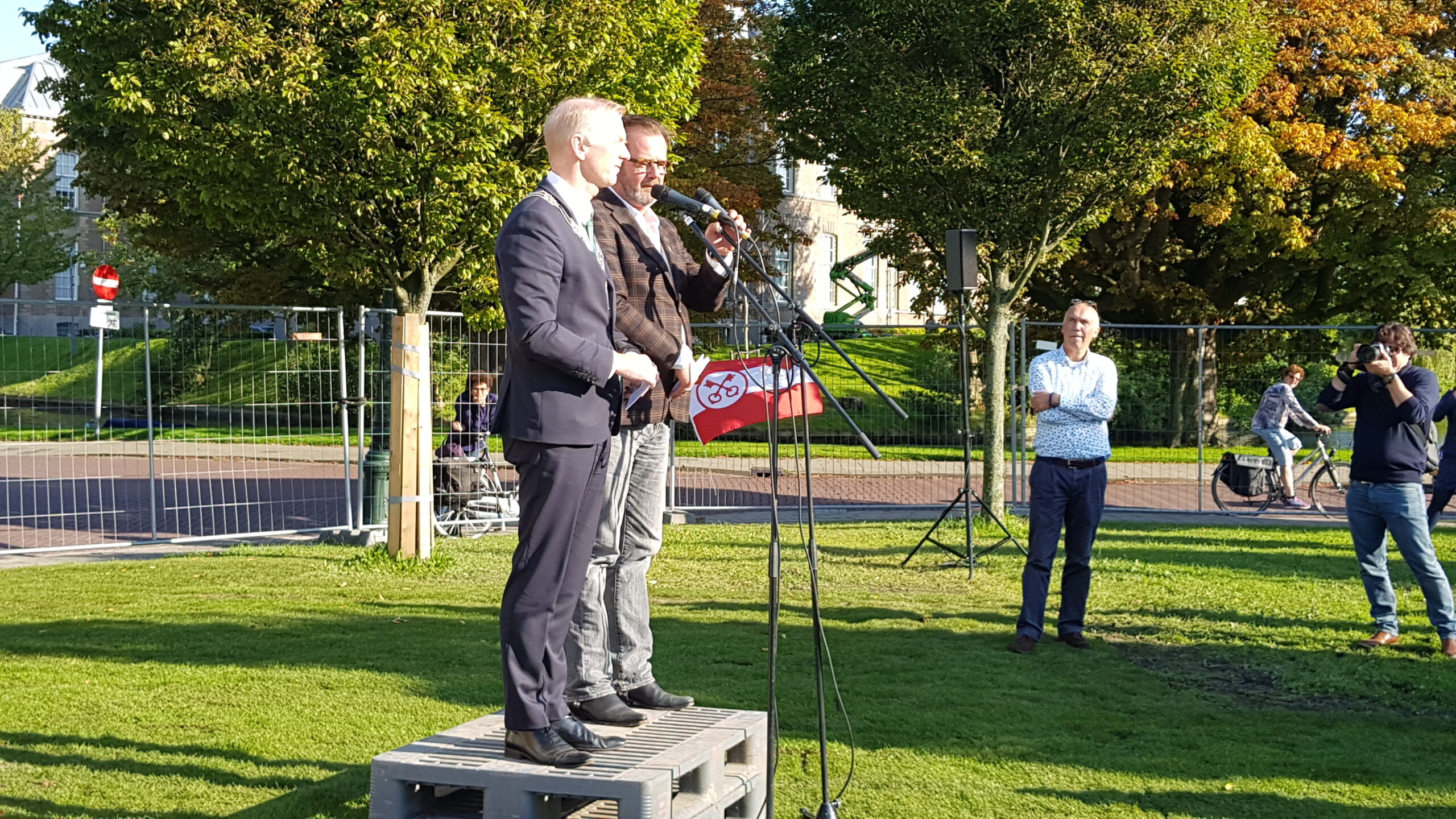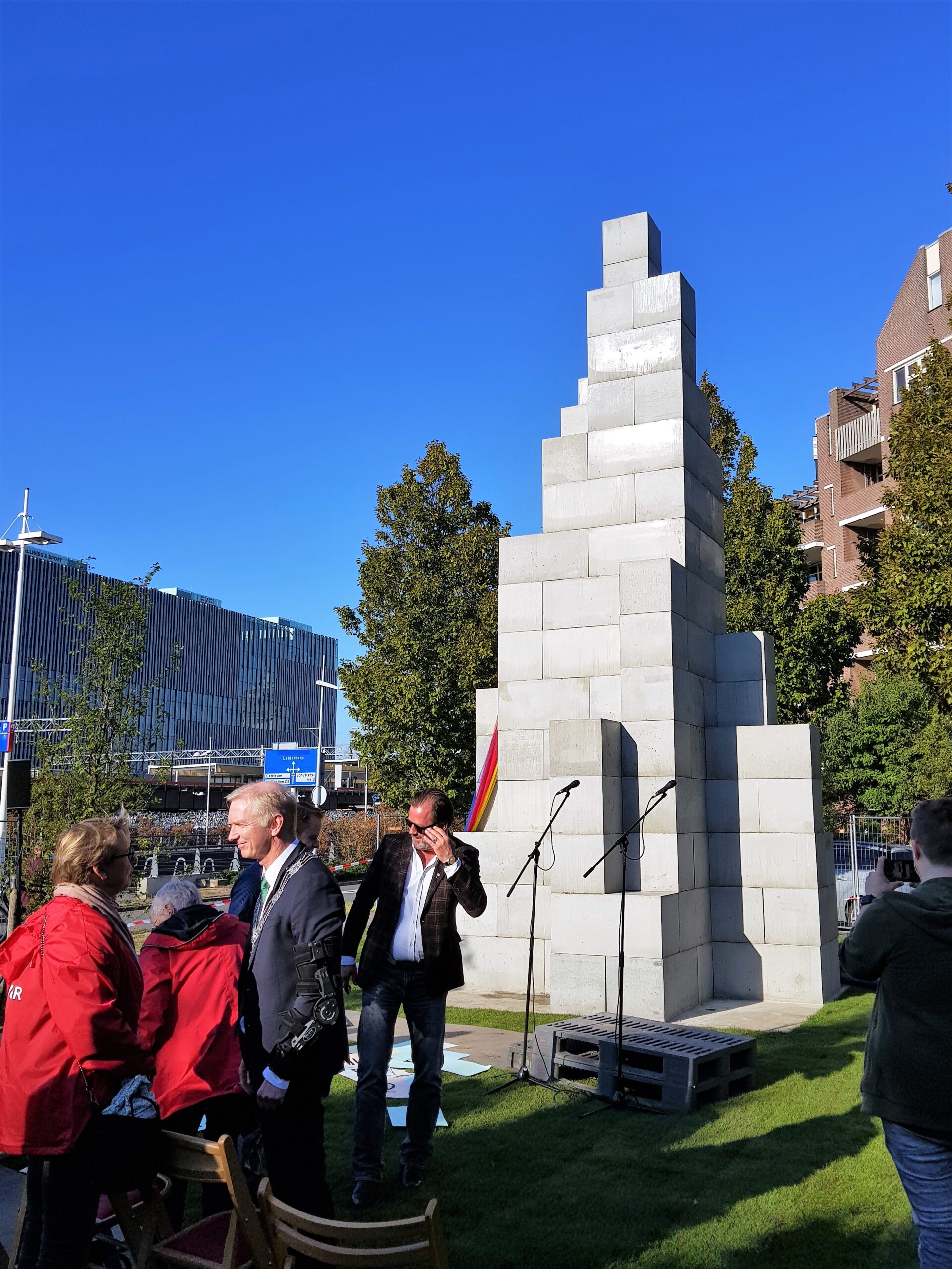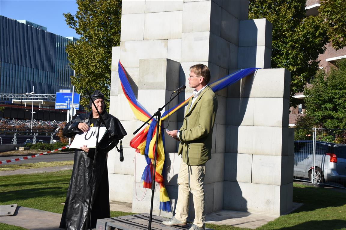 Afgelopen zaterdagmiddag heeft de stichting Vierkant in Vierkant het gelijknamige kunstwerk van de De Stijlgrondlegger Theo van Doesburg overgedragen aan de stad Leiden. Locoburgemeester en wethouder van cultuur Robert Strijk aanvaardde het samen met fractievoorzitter Walter van Peijpe van GroenLinks. Hij diende eerder dit jaar in de Leidse gemeenteraad een motie in om de nog ontbrekende 30.000 euro die nodig waren voor de realisatie van het werk beschikbaar te stellen. Dat werd raadsbreed gesteund.