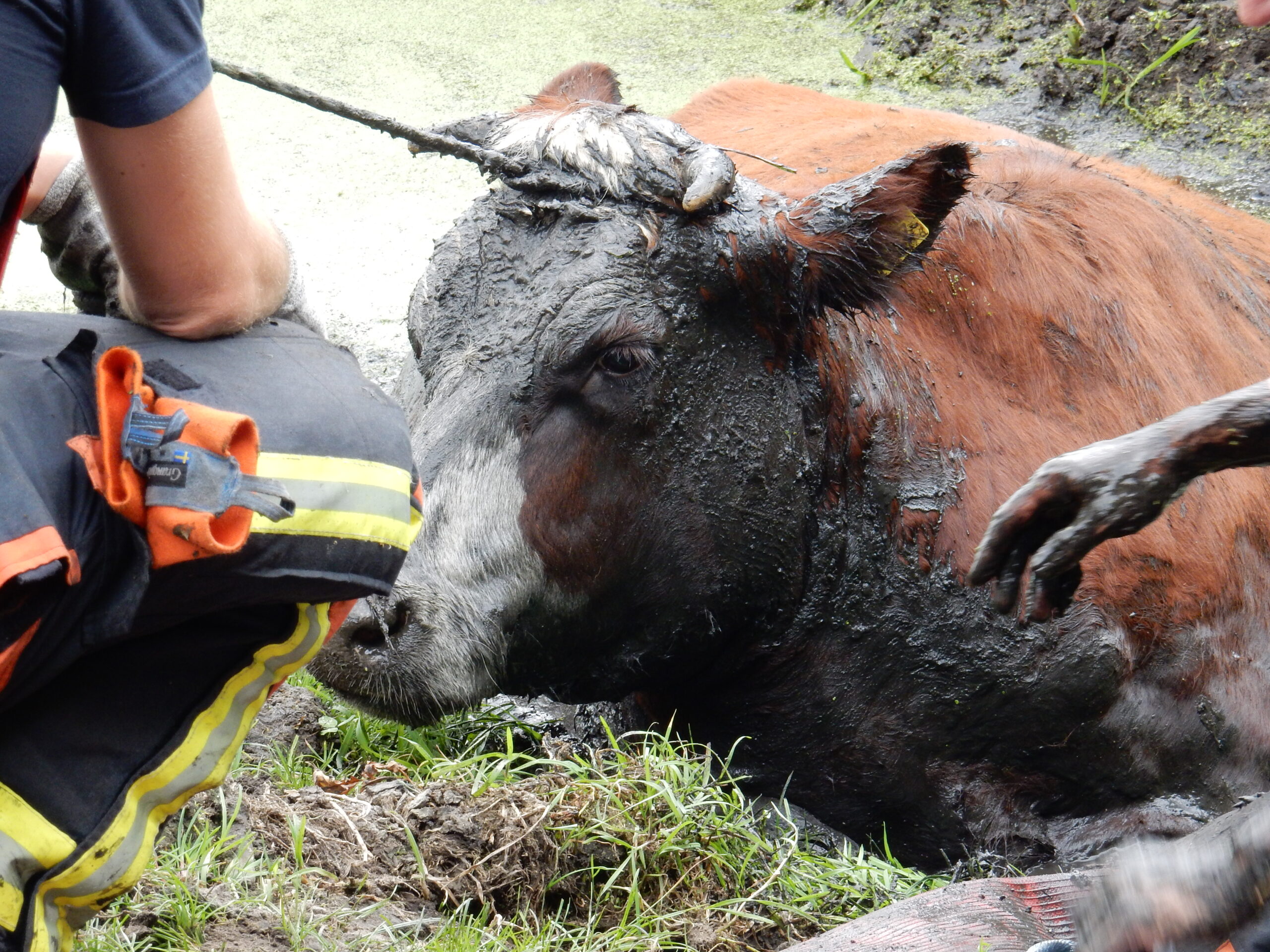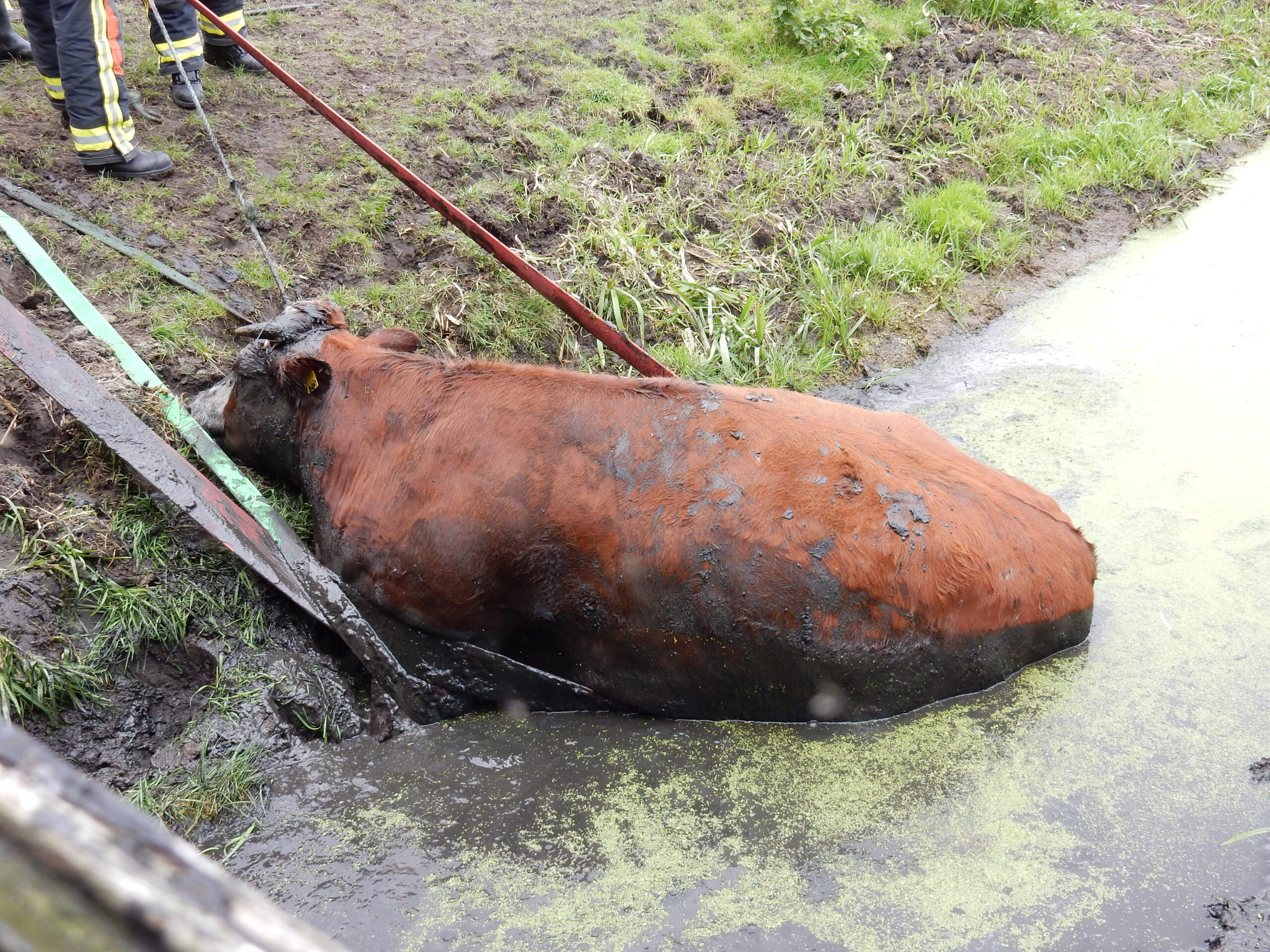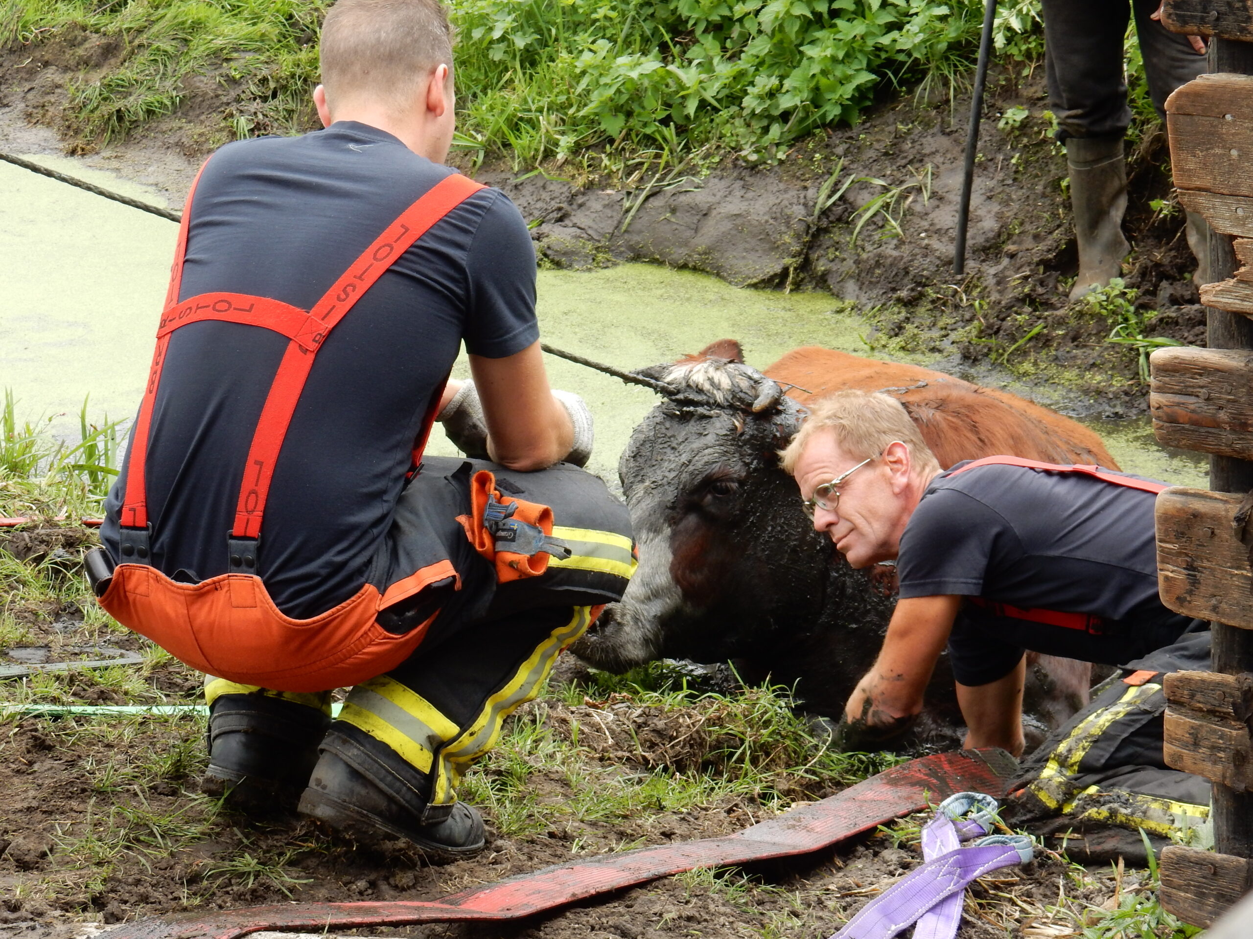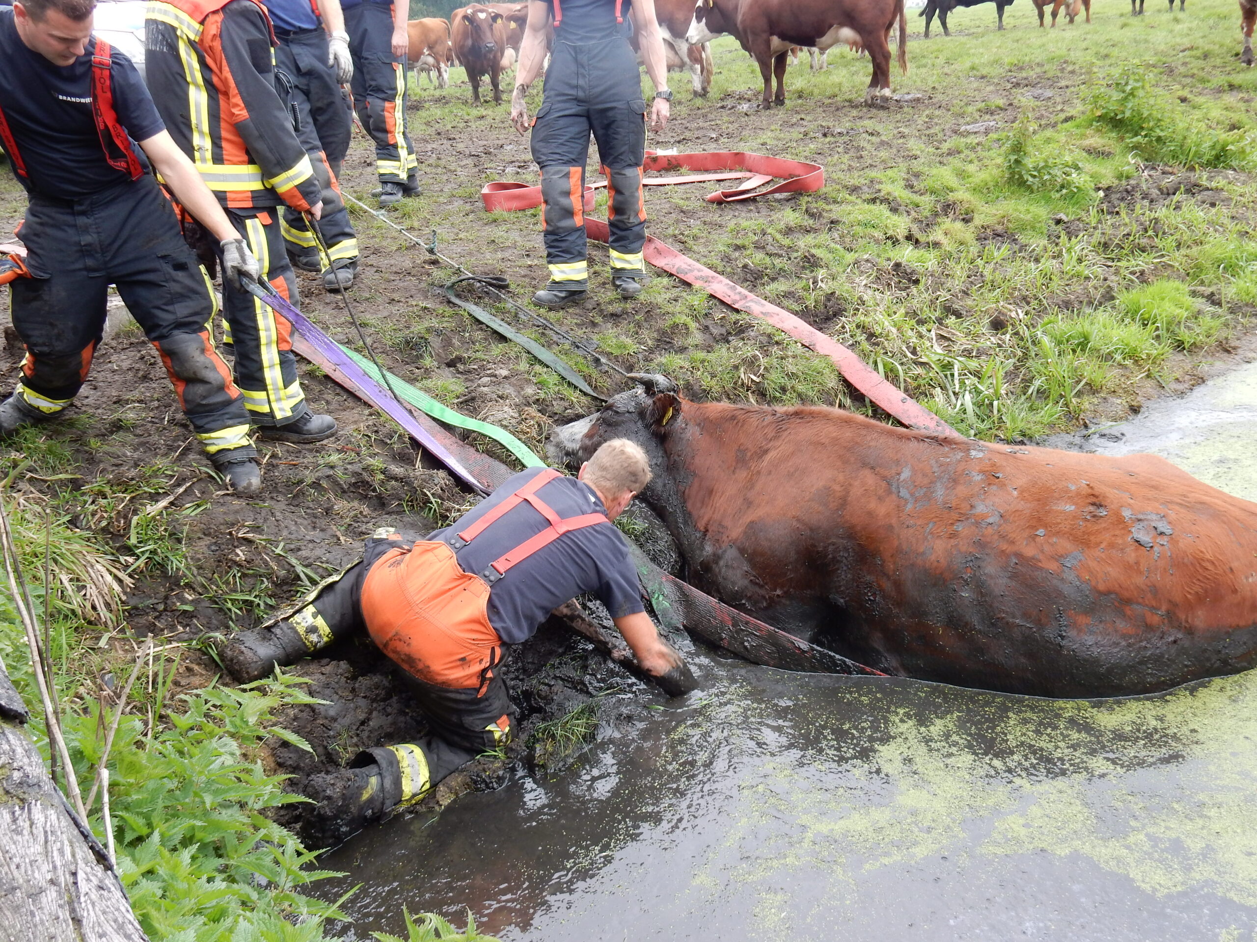 De brandweer kwam met meerdere manschappen ter plaatse en zelfs toen lukte het pas na geruime tijd om de drachtige koe met vereende krachten weer op het droge te krijgen. Daarvoor moesten de brandweerlieden wel tot hun middel in de drek staan.