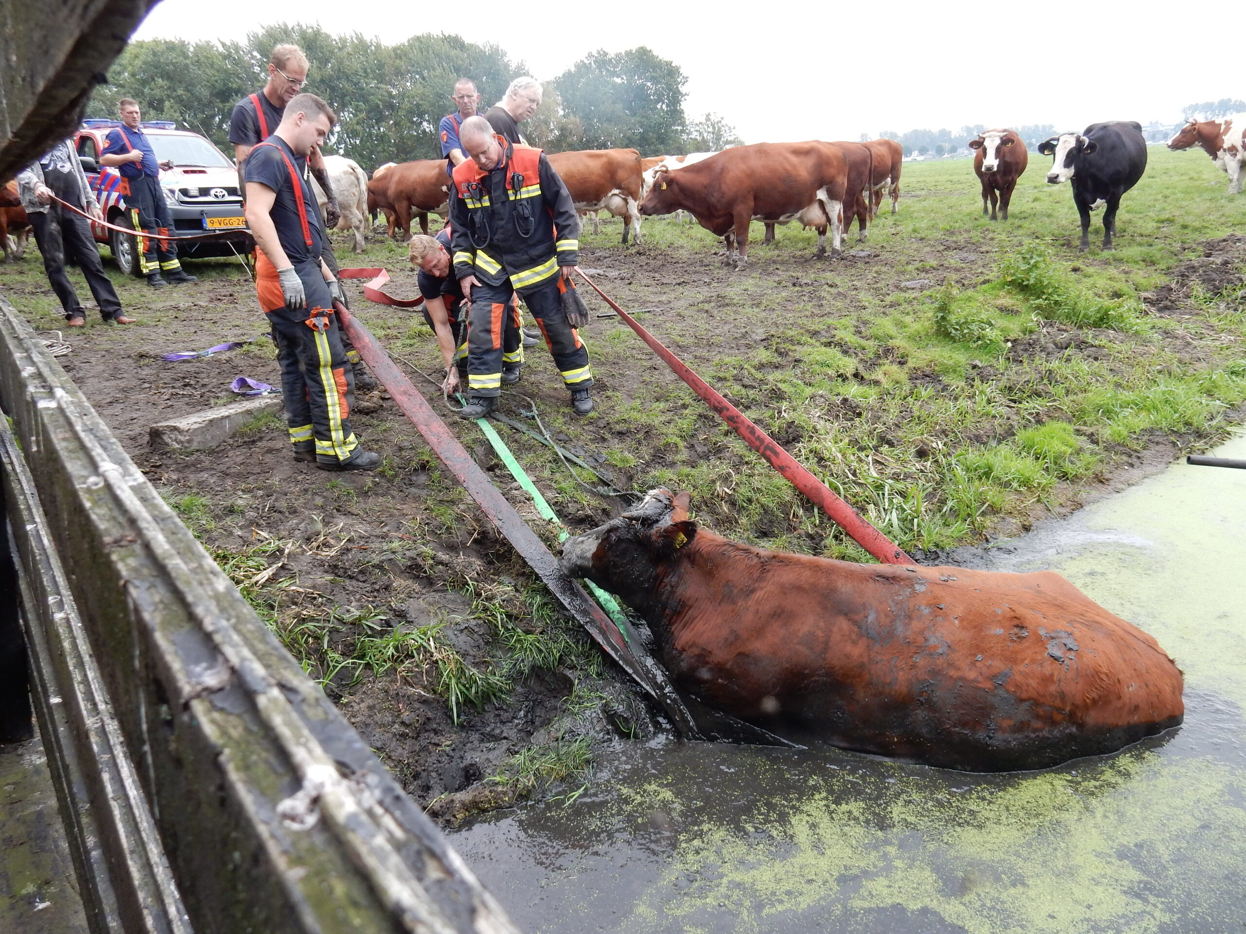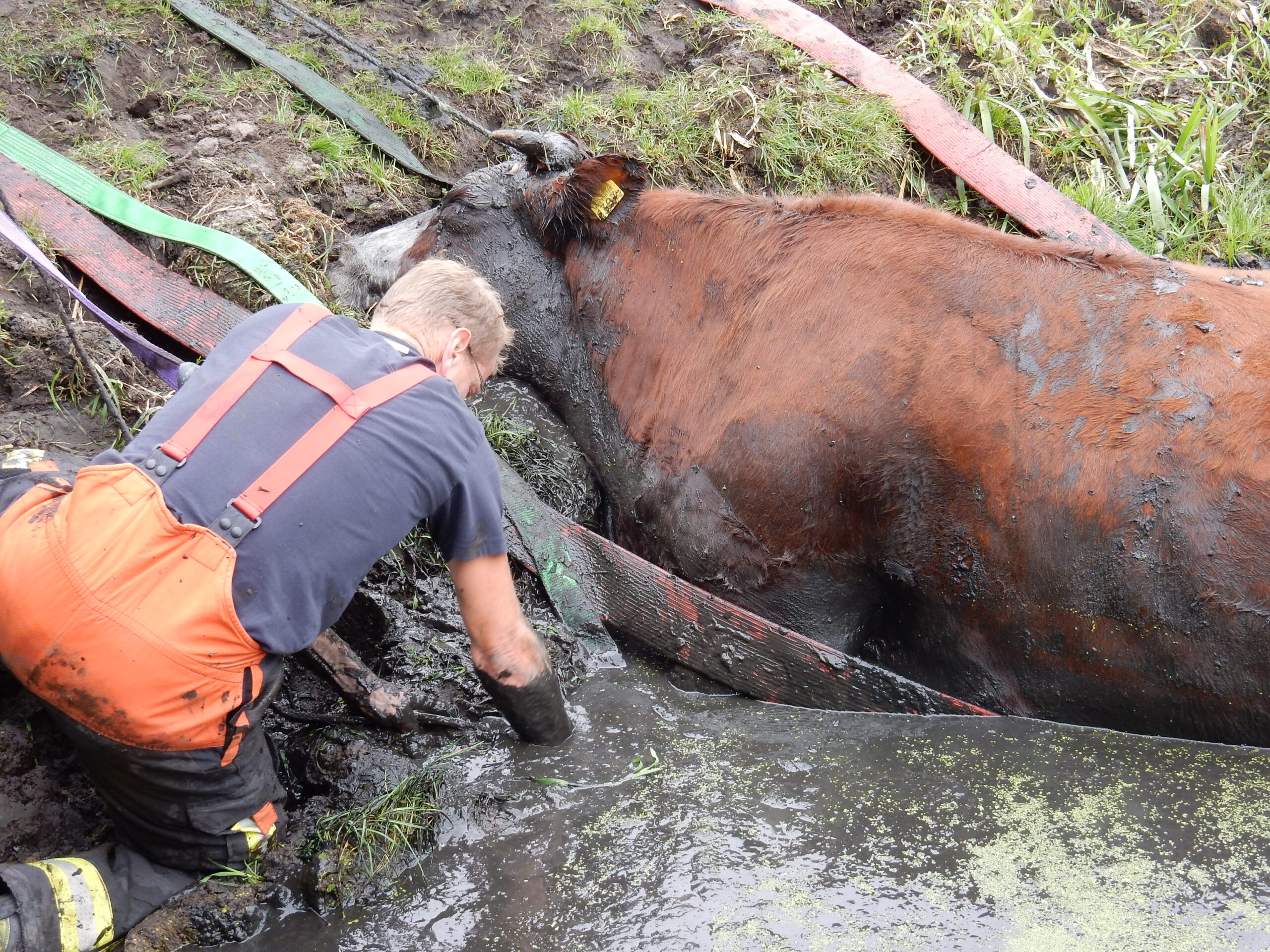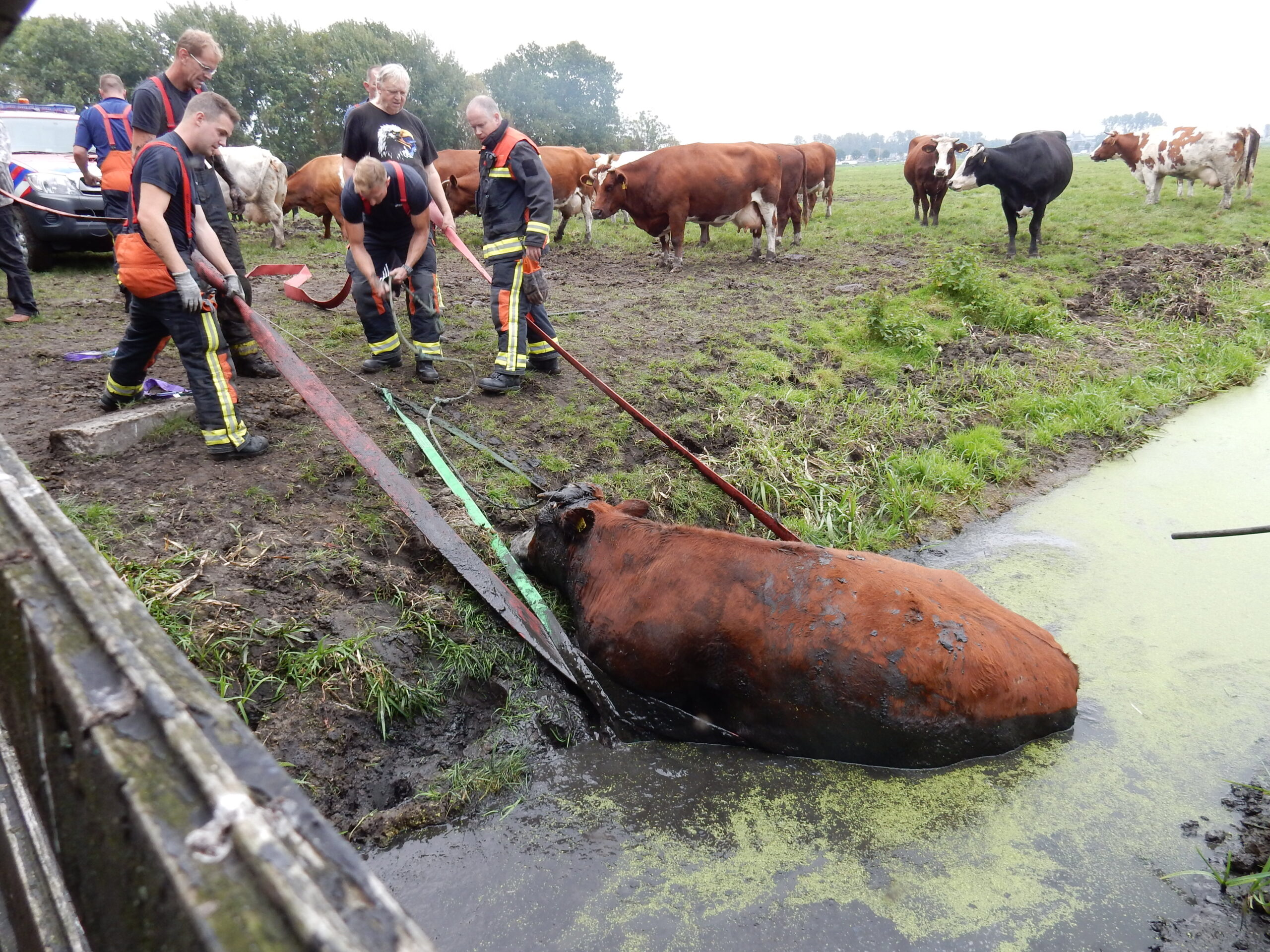 De brandweer kwam met meerdere manschappen ter plaatse en zelfs toen lukte het pas na geruime tijd om de drachtige koe met vereende krachten weer op het droge te krijgen. Daarvoor moesten de brandweerlieden wel tot hun middel in de drek staan.