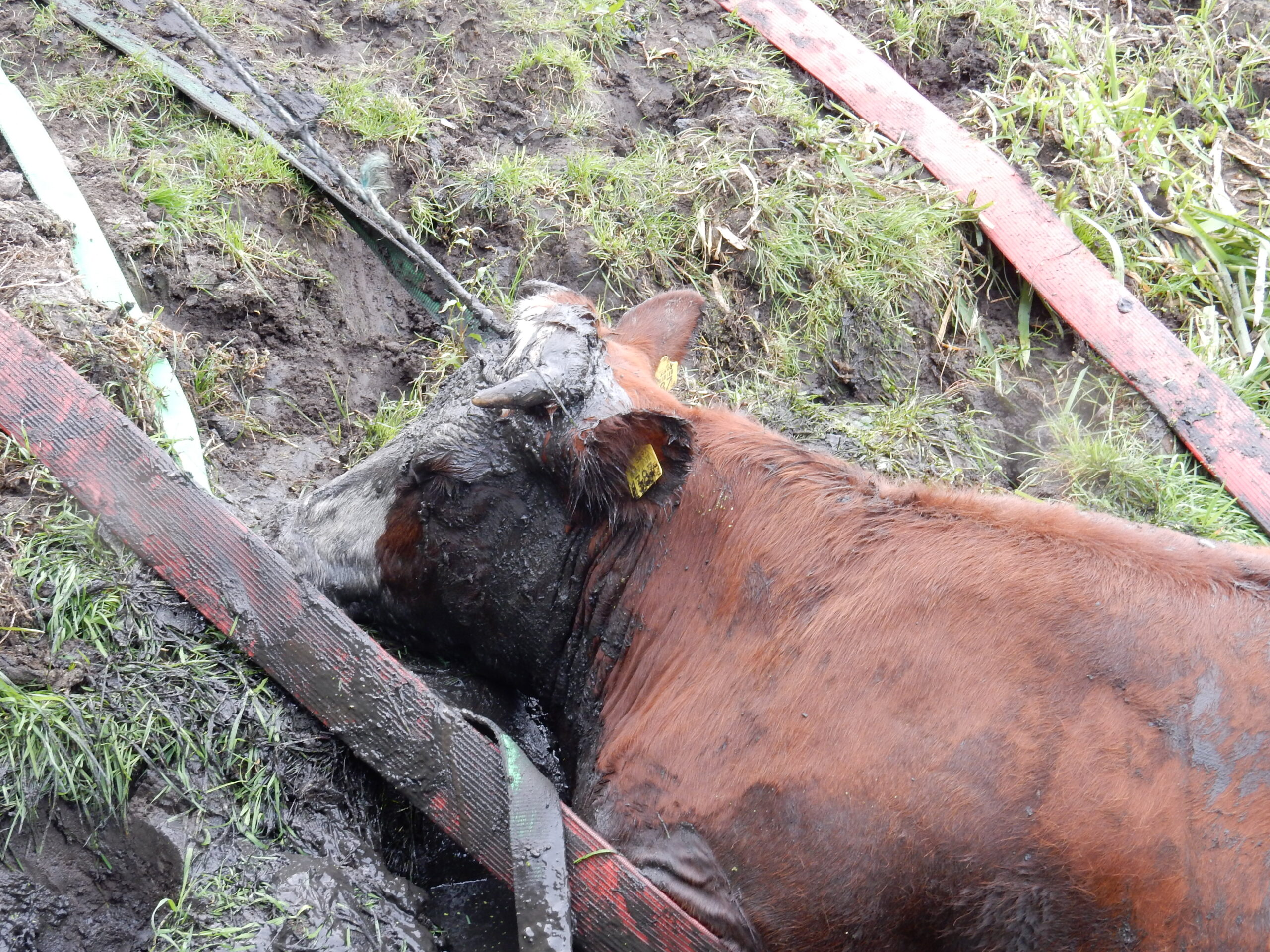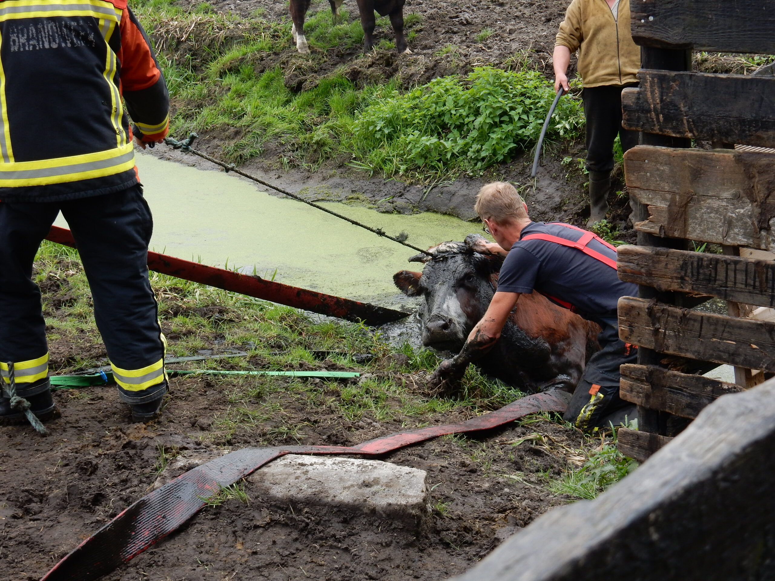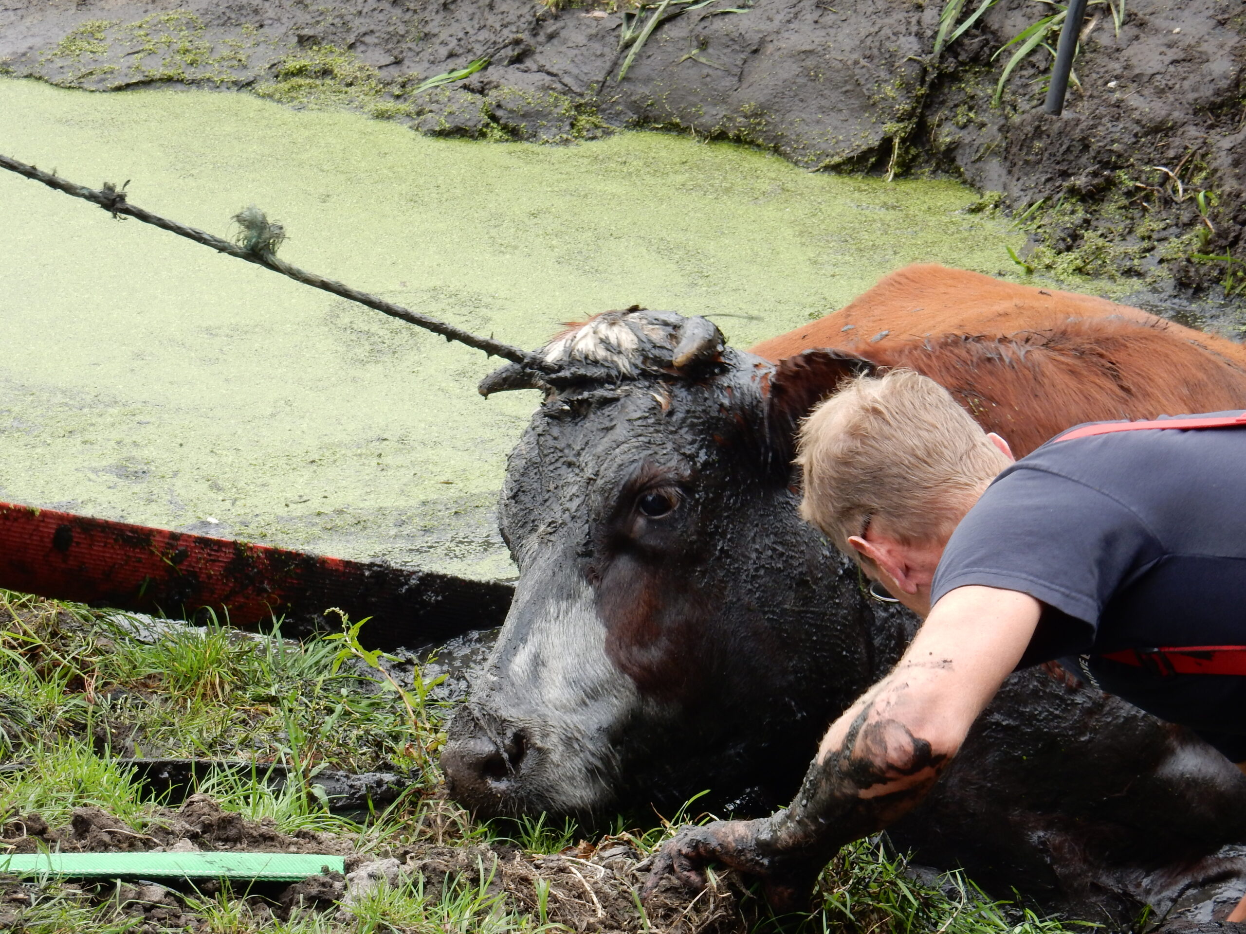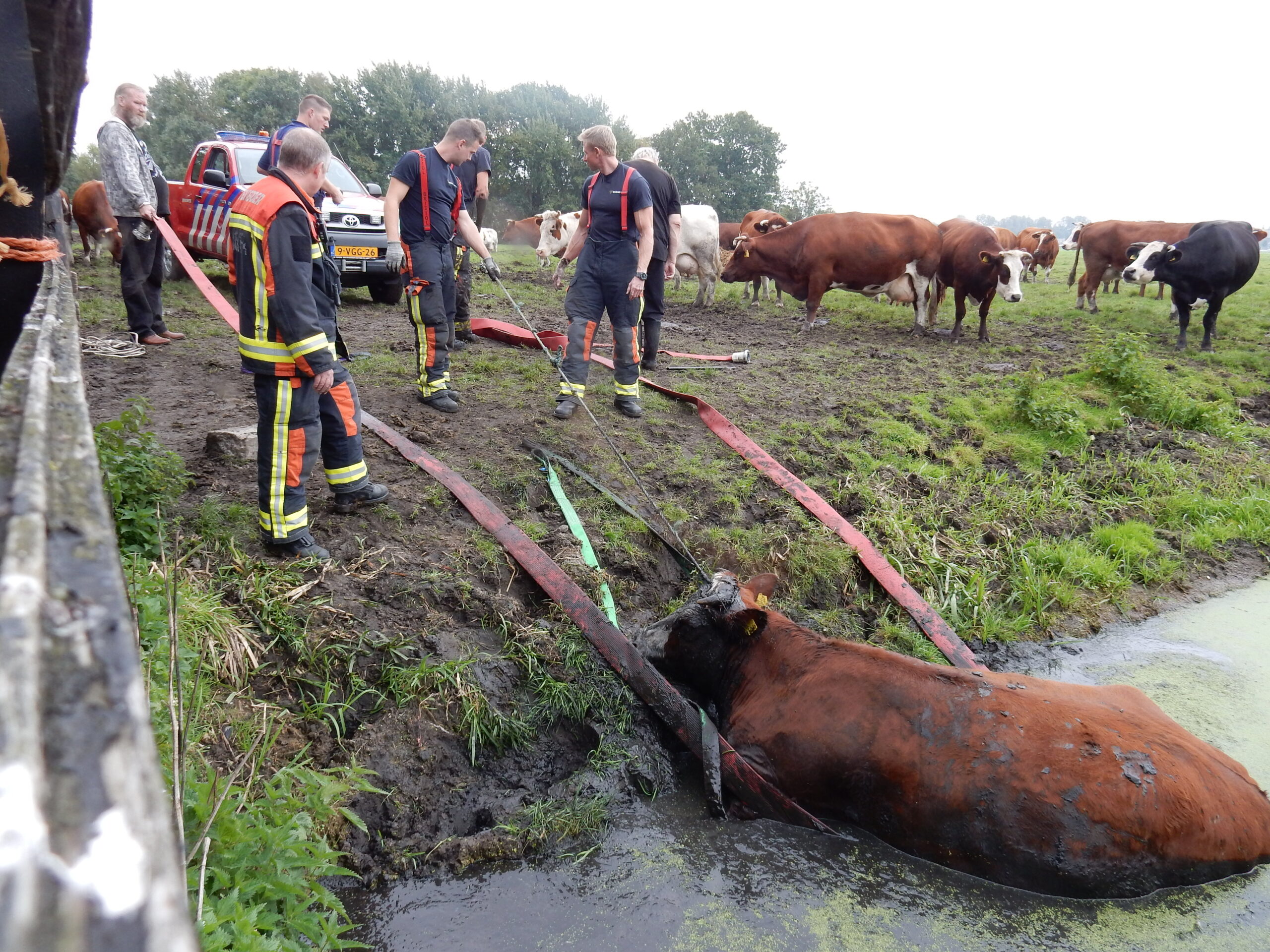 De brandweer kwam met meerdere manschappen ter plaatse en zelfs toen lukte het pas na geruime tijd om de drachtige koe met vereende krachten weer op het droge te krijgen. Daarvoor moesten de brandweerlieden wel tot hun middel in de drek staan.