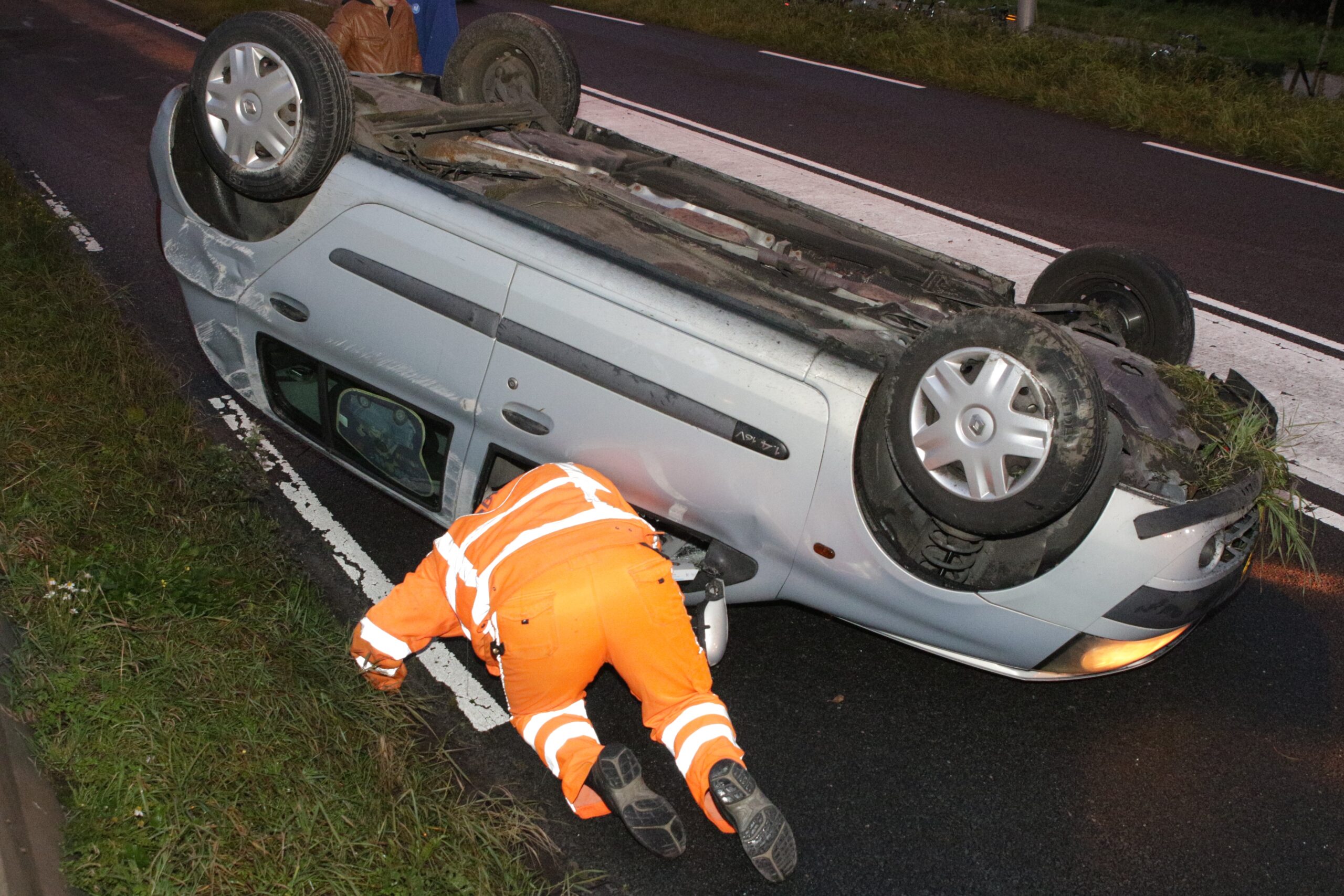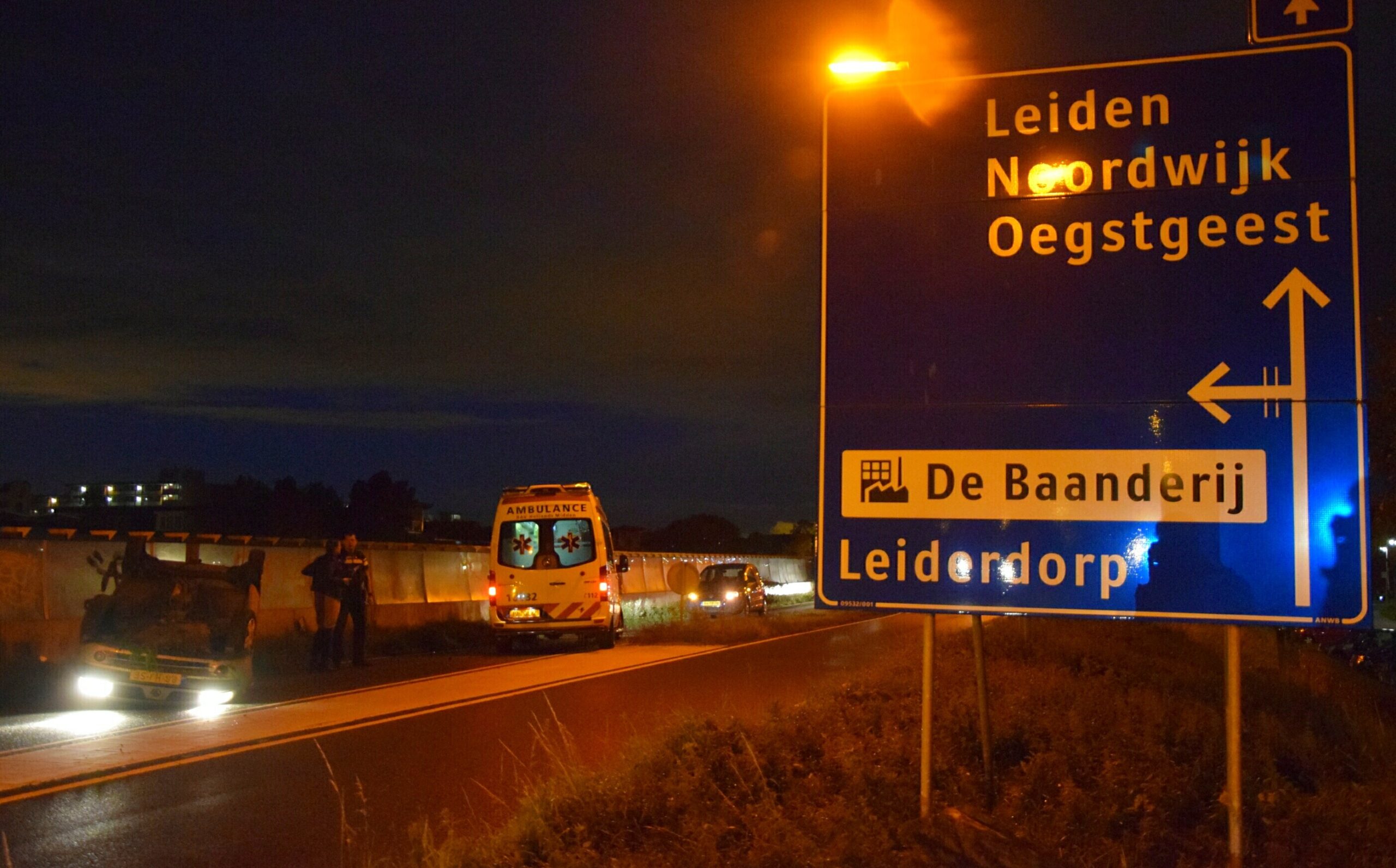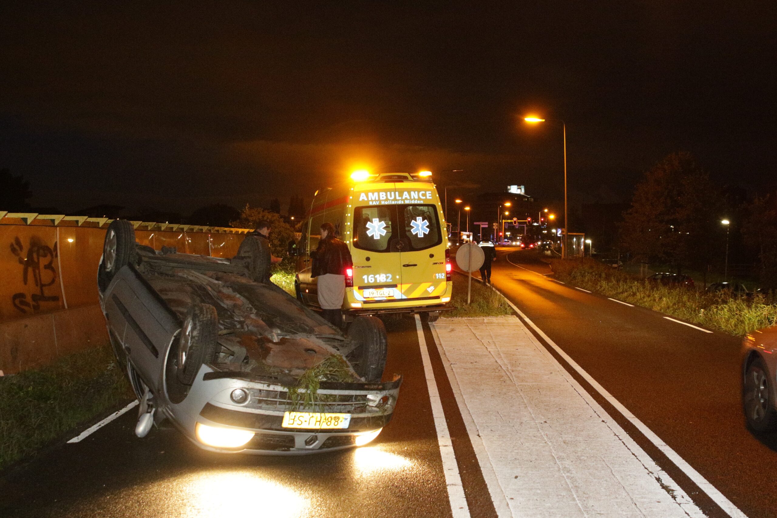 Vanmorgen vroeg is een automobiliste op de Oude Spoorbaan in Leiderdorp met haar auto over de kop geslagen. Ze raakte met haar auto de verhoogde bermrand, raakte de macht over het stuur kwijt en eindigde ondersteboven op de rijbaan richting Oud Ade.