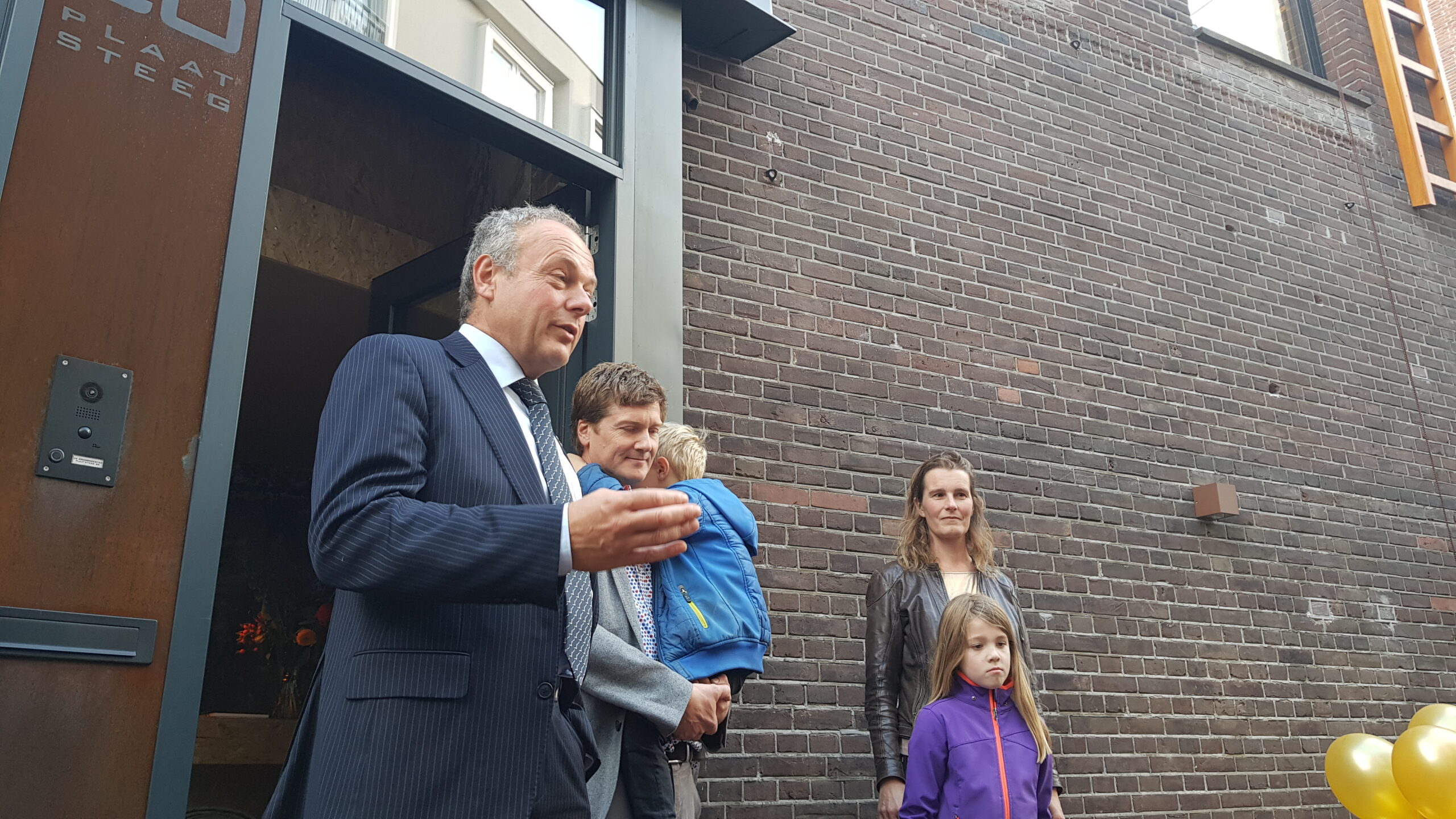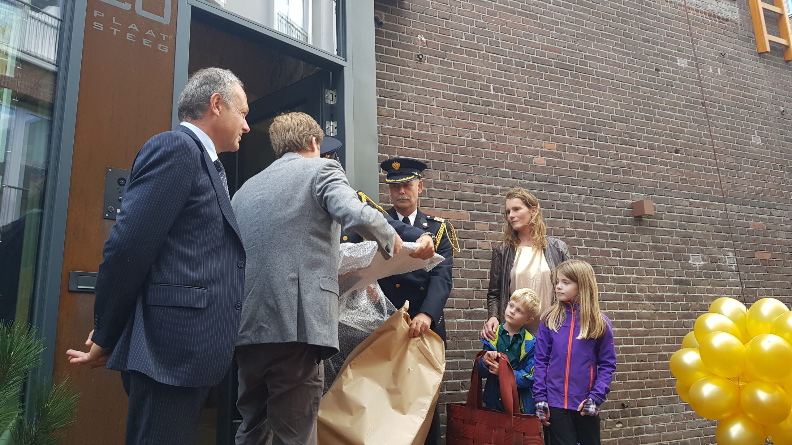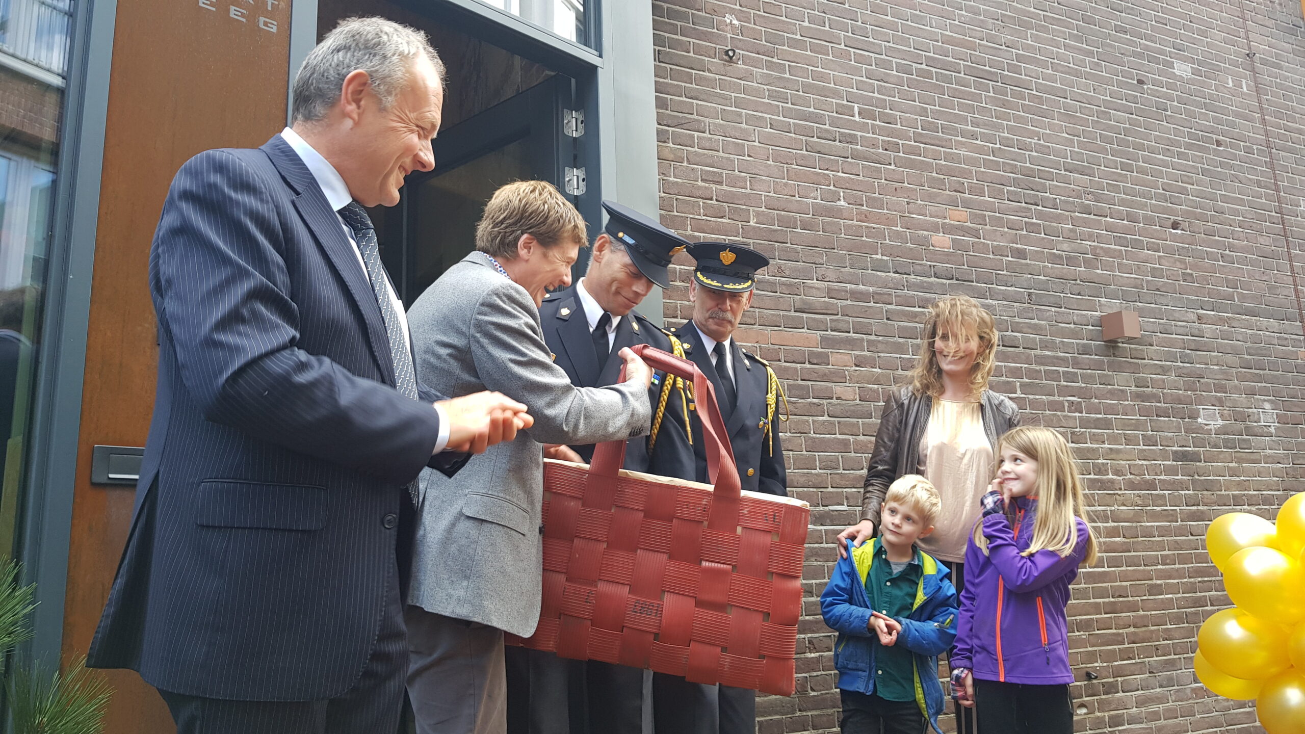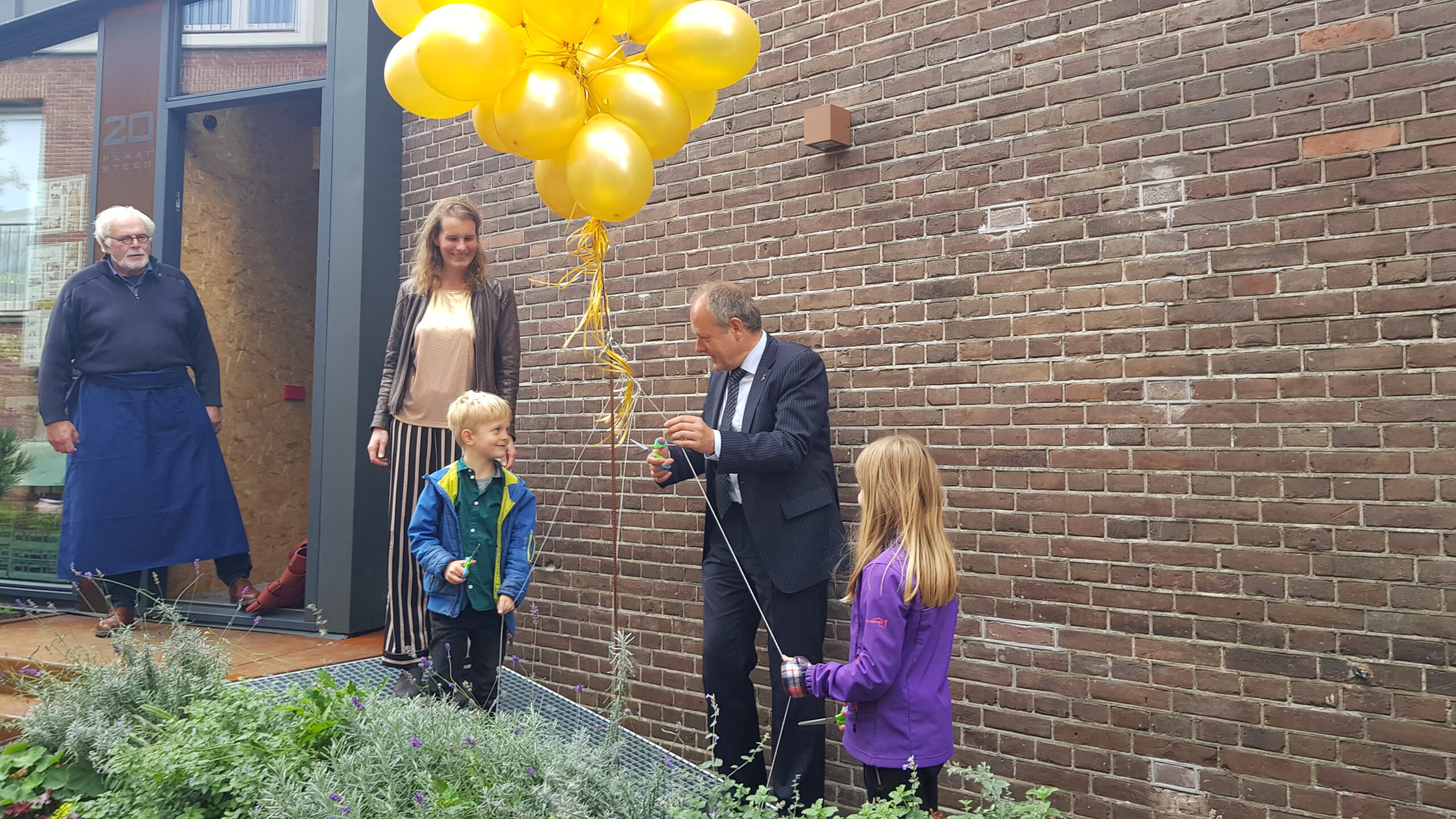 Burgemeester Lenferink kwam een toespraak houden en ballonnen oplaten. samen met Yara en Merlijn, de kinderen van Verheijen en Clijncke. Niet zomaar de lucht in, want de met helium gevulde ballonnen moesten langs een koord omhoog schieten en dan aan de toren blijven hangen. Beter voor het milieu.