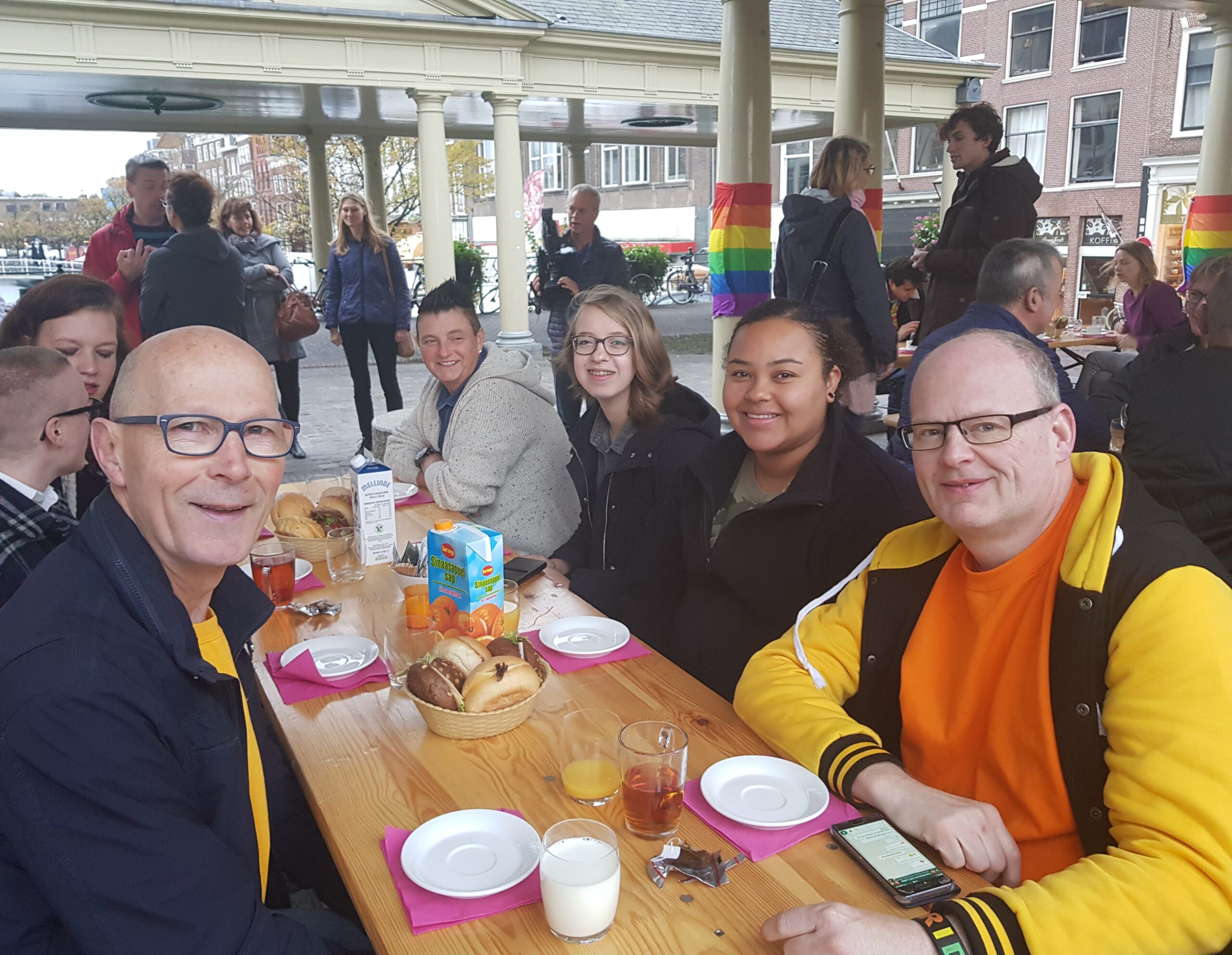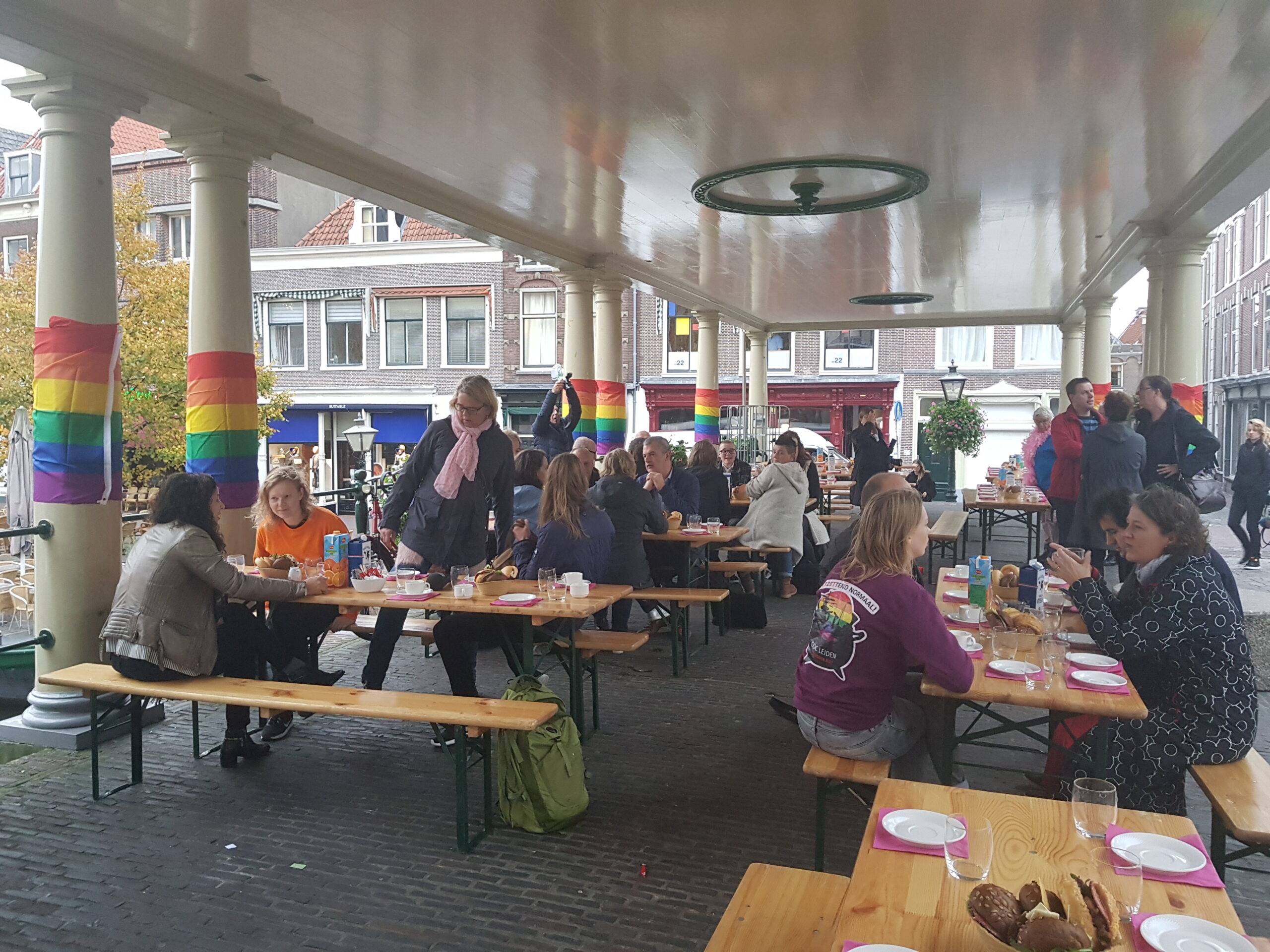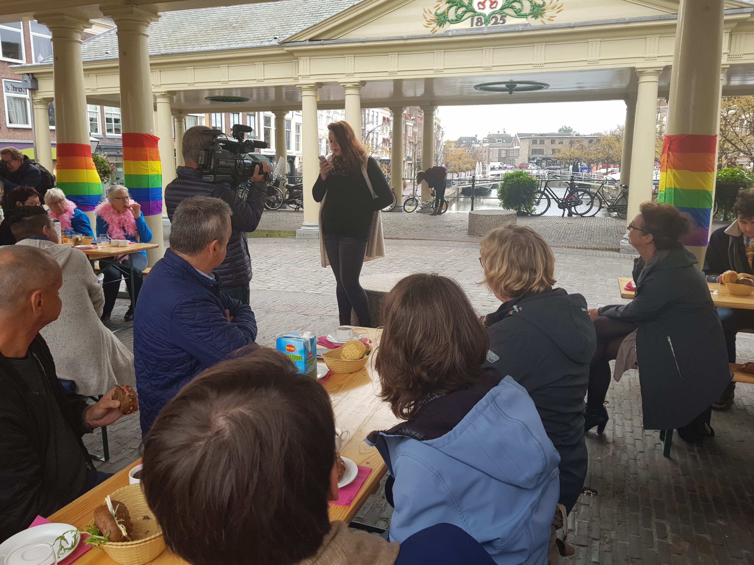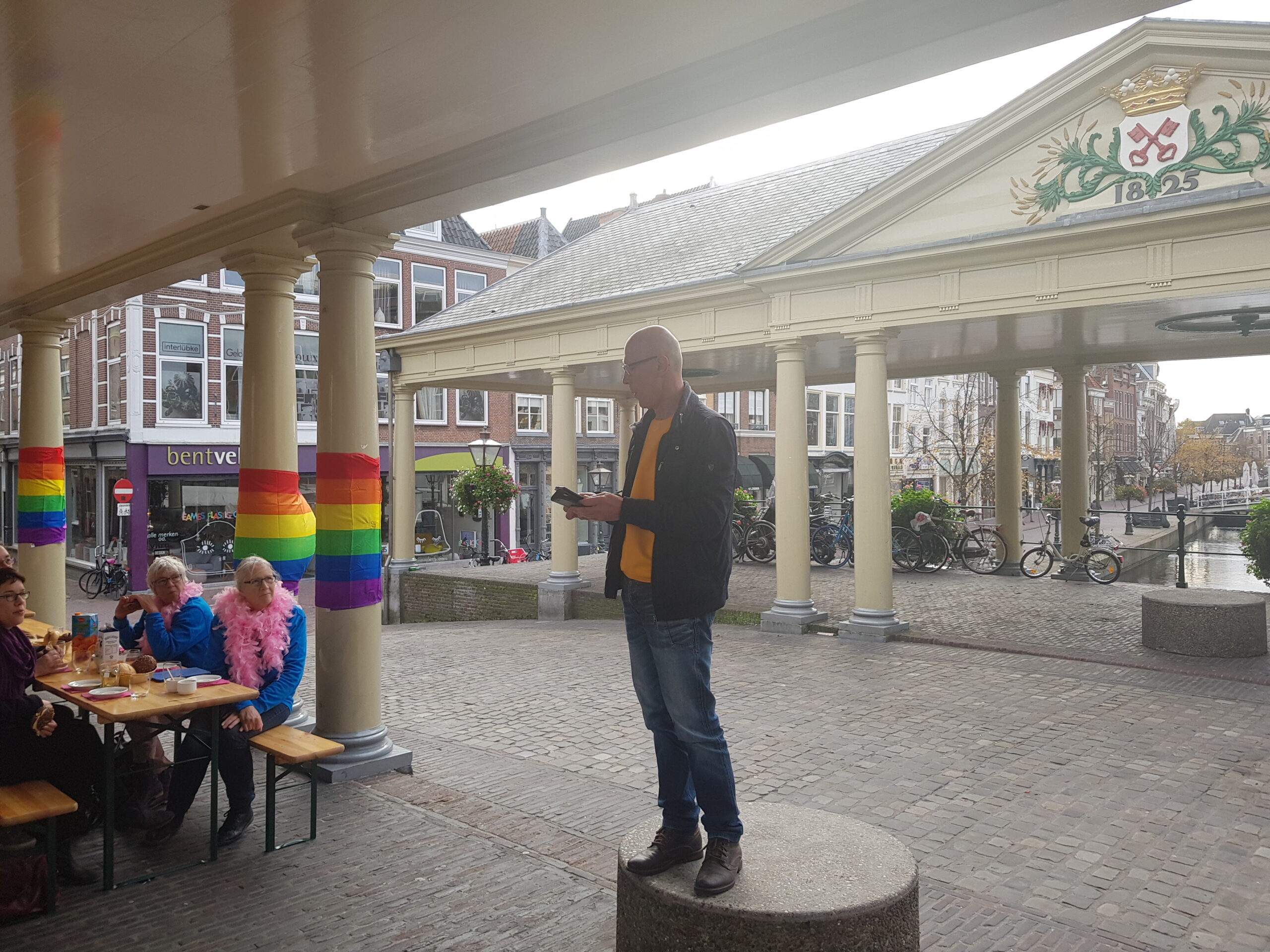 Gisteren was het internationale Coming Out Dag. in Leiden organiseerde het COC daarom verschillende activiteiten. Het begon in de ochtend met een Coming Out ontbijt in de buitenlucht. Op de Koornbeursbrug kwamen enkele tientallen vrijwilligers en leden van COC Leiden, de gemeente en andere maatschappelijke organisaties een broodje eten, terwijl ze luisterden naar de coming out-verhalen van een drietal sprekers. Aansluitend werd in de toren van het stadhuis een enorme regenboogvlag gehesen.