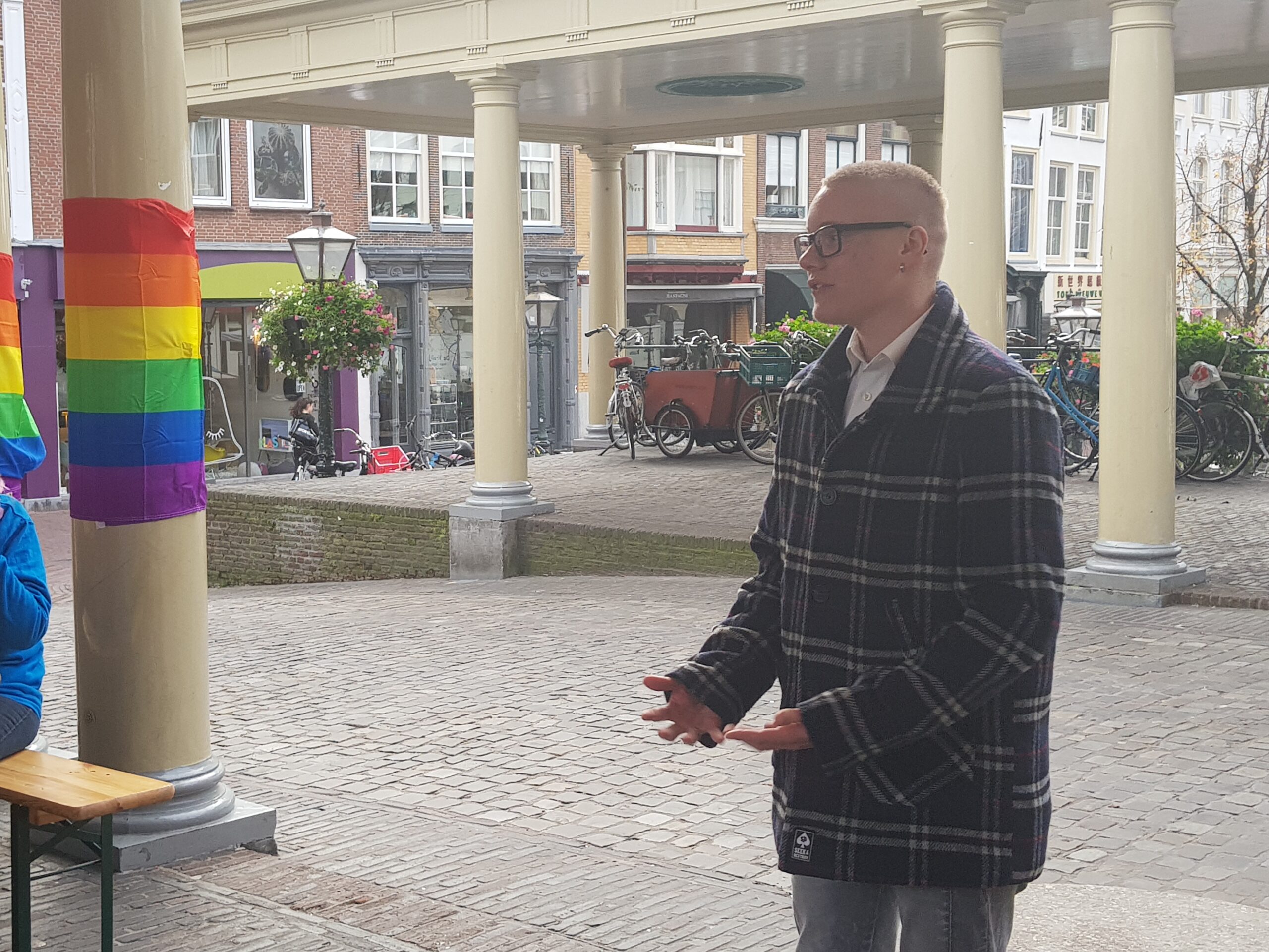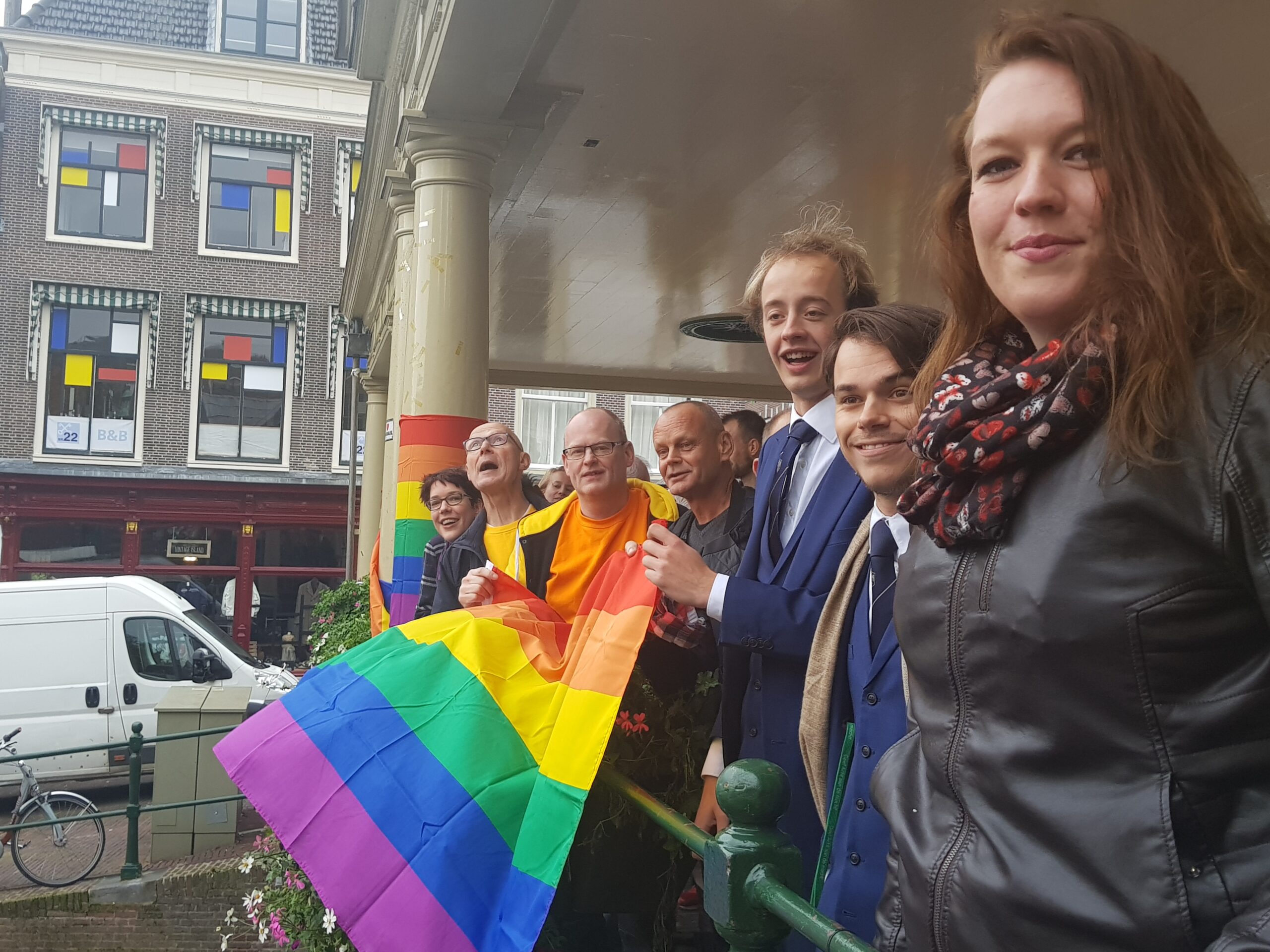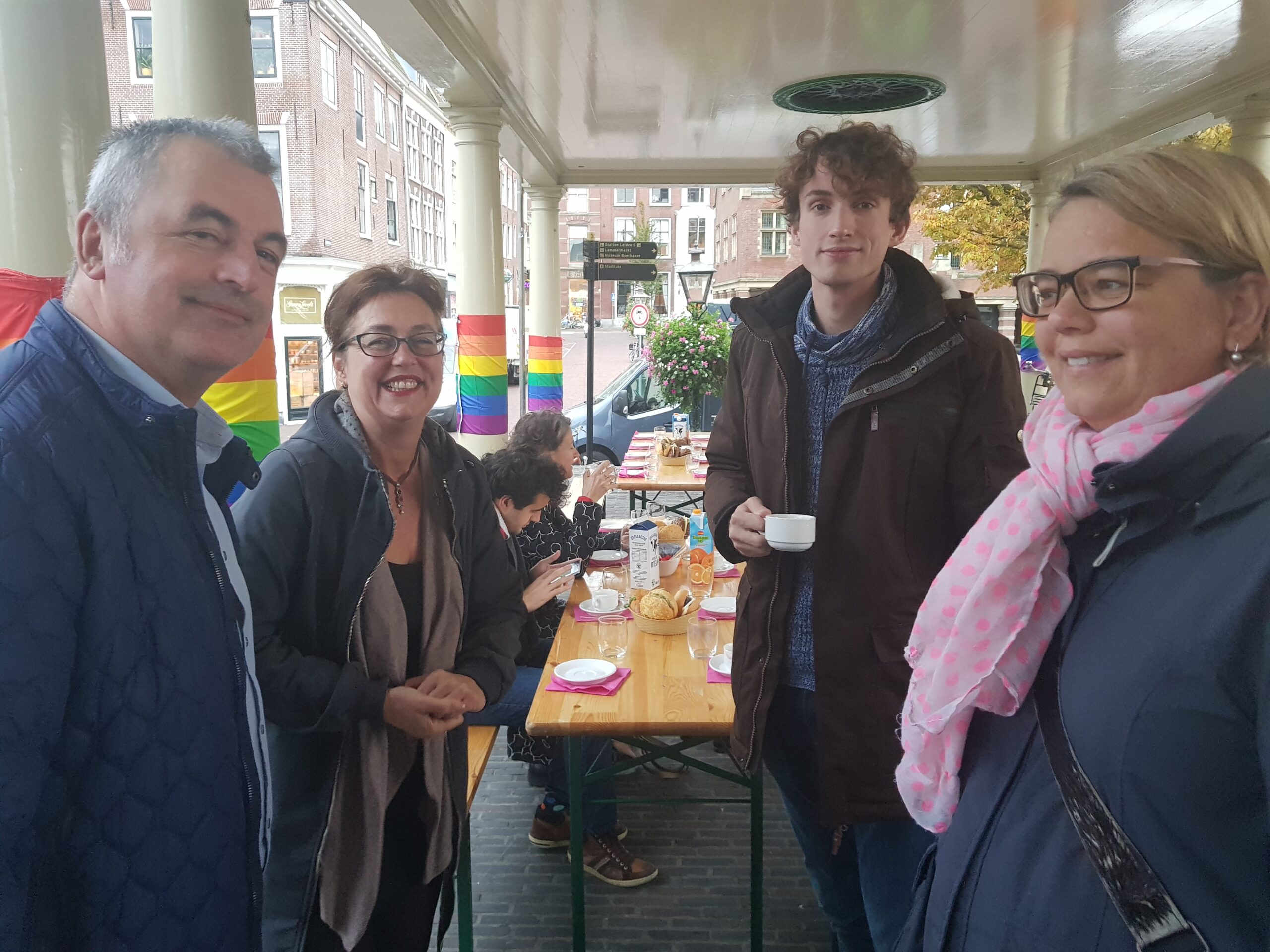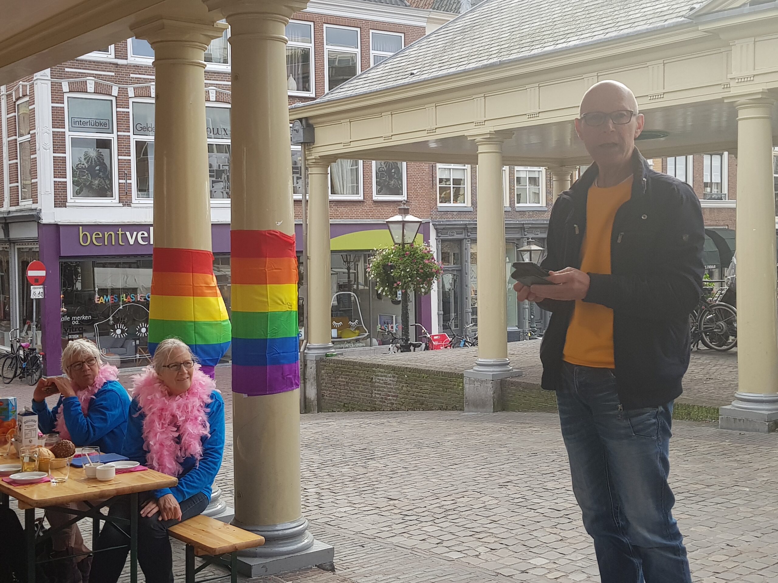 Gisteren was het internationale Coming Out Dag. in Leiden organiseerde het COC daarom verschillende activiteiten. Het begon in de ochtend met een Coming Out ontbijt in de buitenlucht. Op de Koornbeursbrug kwamen enkele tientallen vrijwilligers en leden van COC Leiden, de gemeente en andere maatschappelijke organisaties een broodje eten, terwijl ze luisterden naar de coming out-verhalen van een drietal sprekers. Aansluitend werd in de toren van het stadhuis een enorme regenboogvlag gehesen.