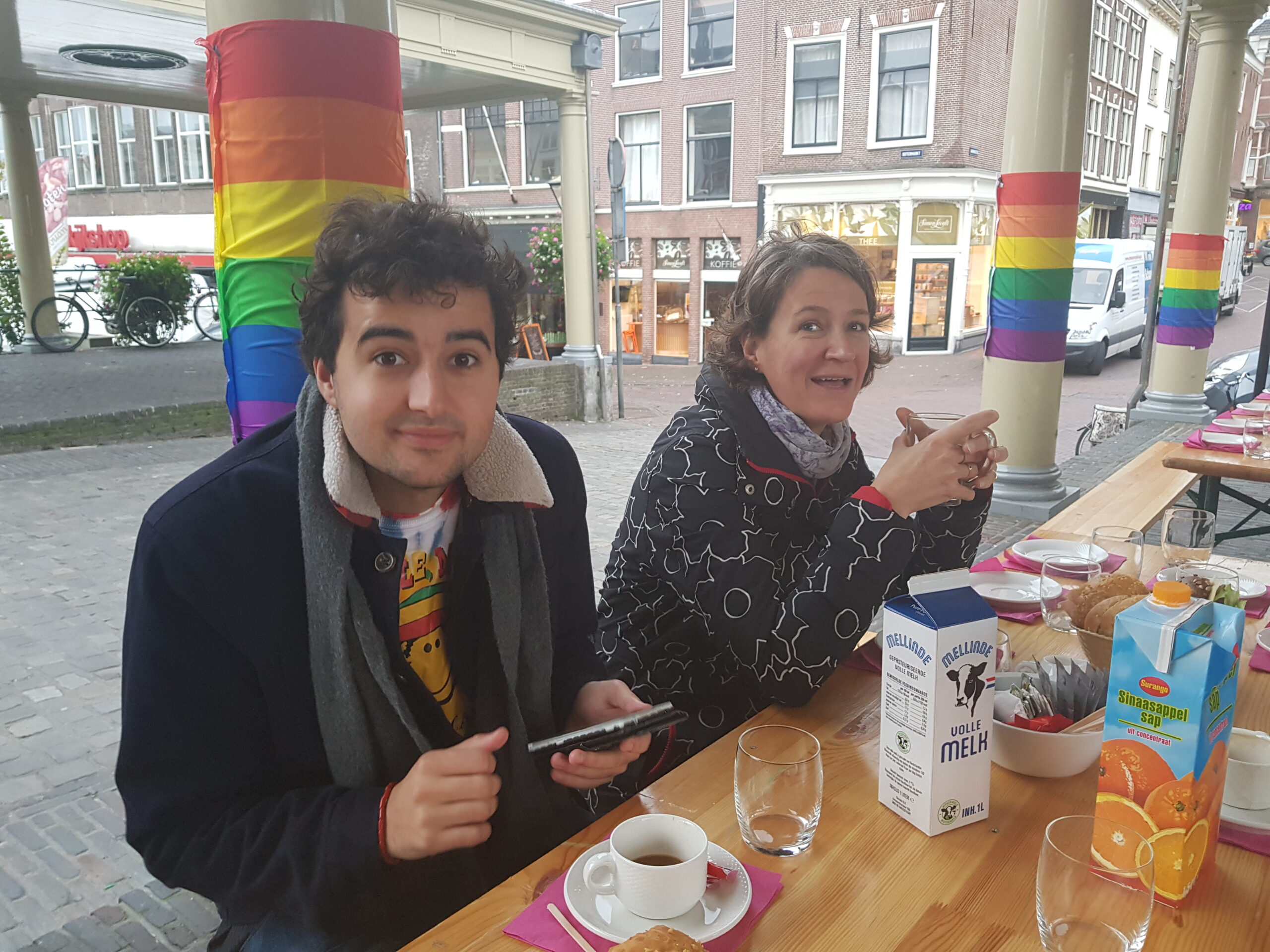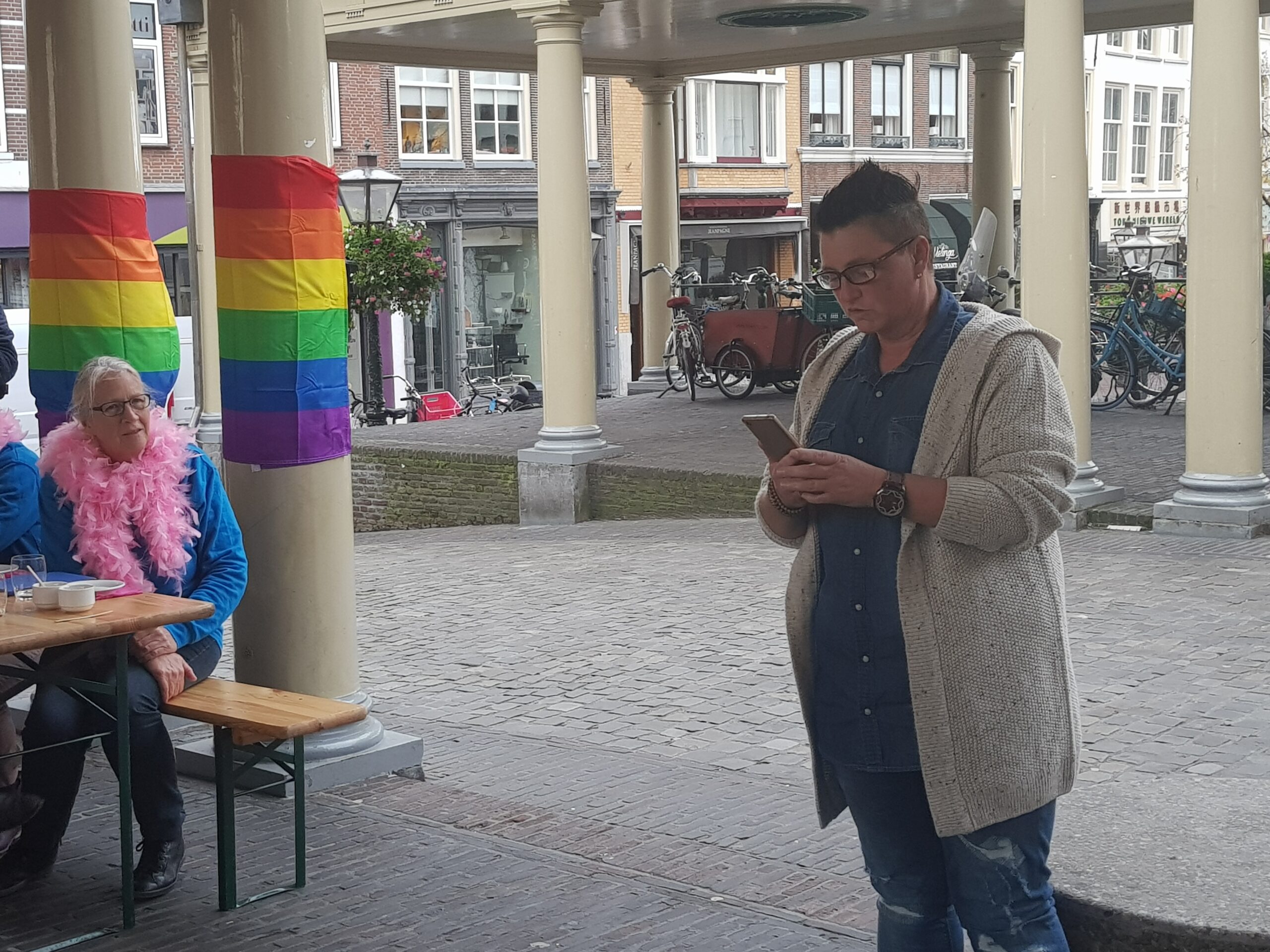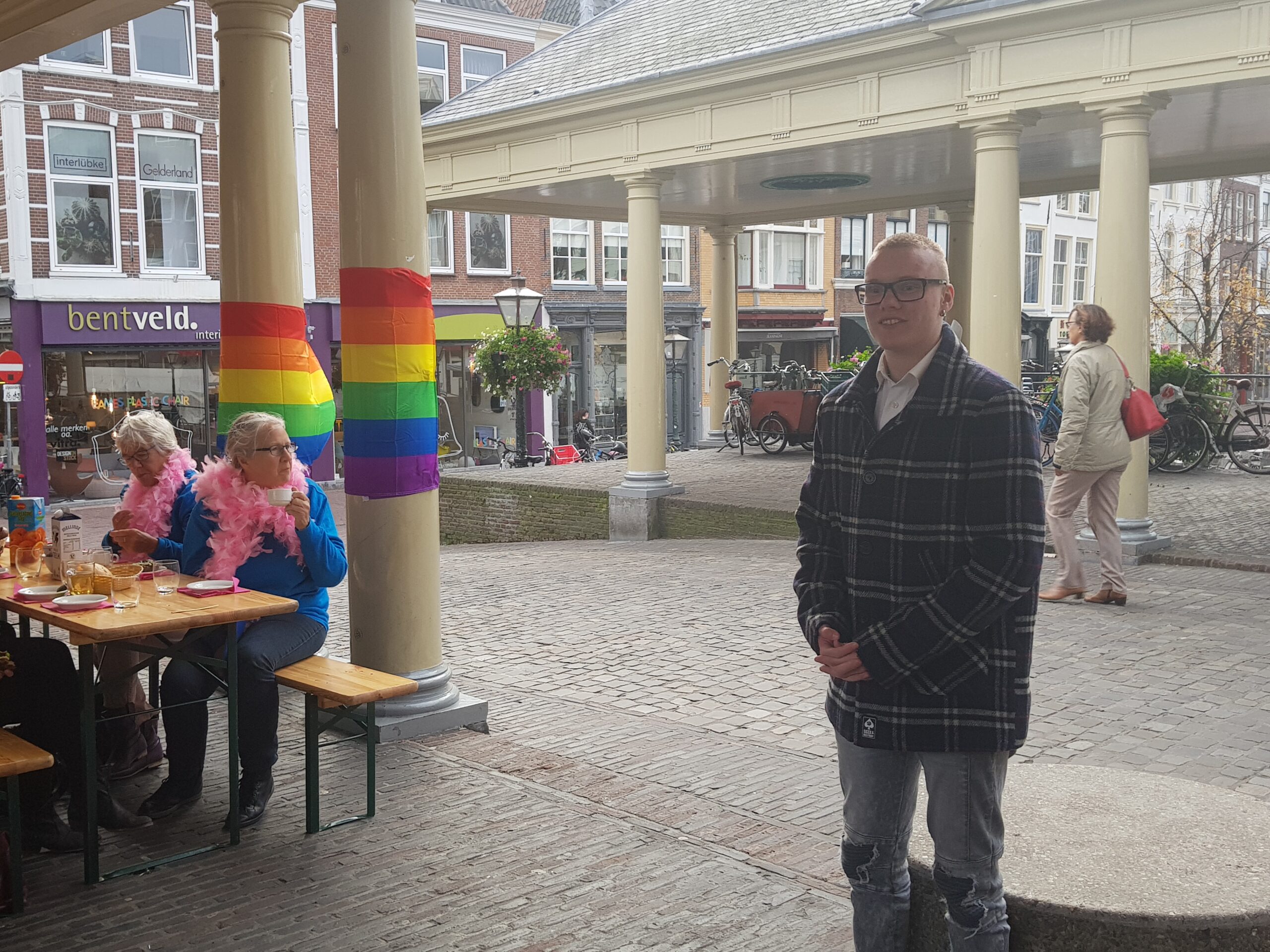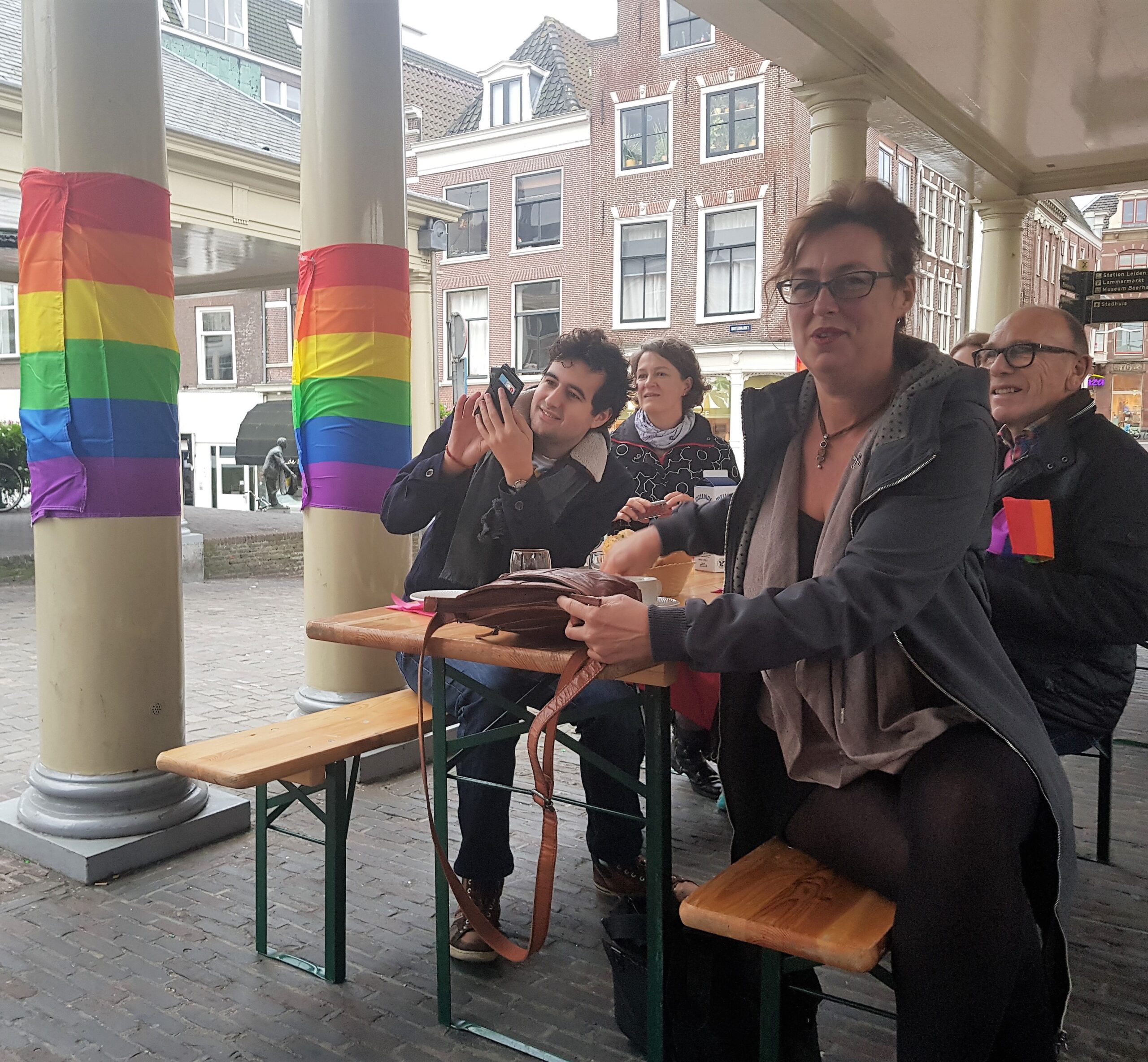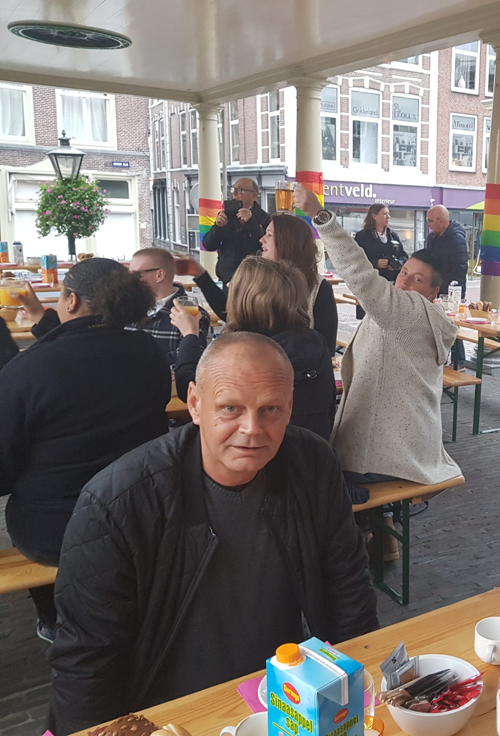 Gisteren was het internationale Coming Out Dag. in Leiden organiseerde het COC daarom verschillende activiteiten. Het begon in de ochtend met een Coming Out ontbijt in de buitenlucht. Op de Koornbeursbrug kwamen enkele tientallen vrijwilligers en leden van COC Leiden, de gemeente en andere maatschappelijke organisaties een broodje eten, terwijl ze luisterden naar de coming out-verhalen van een drietal sprekers. Aansluitend werd in de toren van het stadhuis een enorme regenboogvlag gehesen.