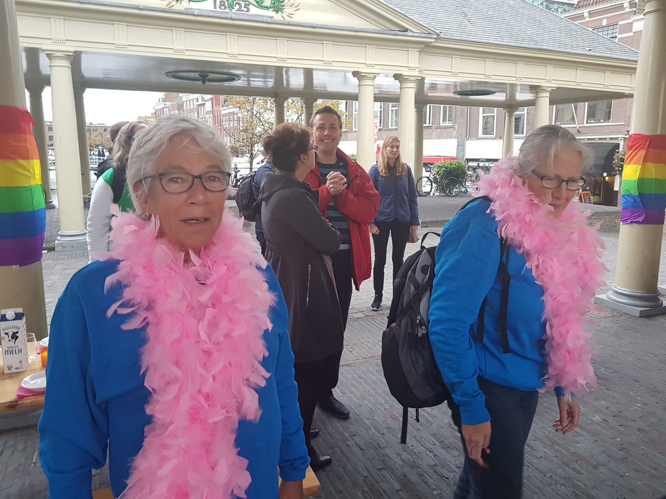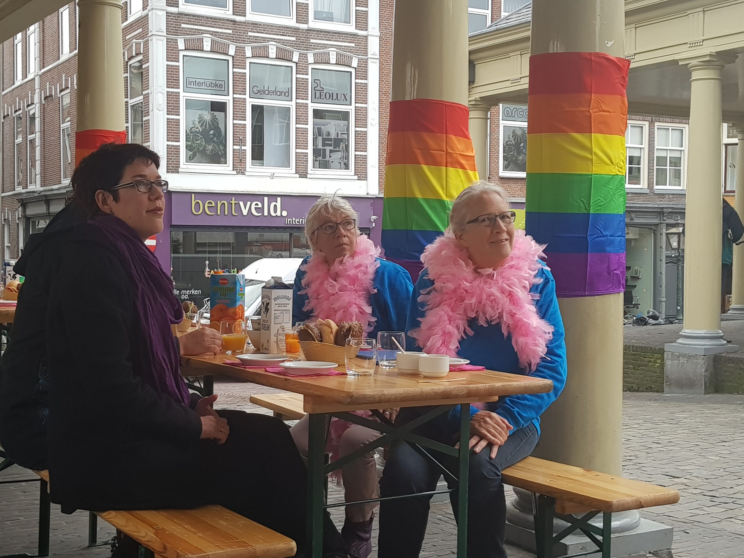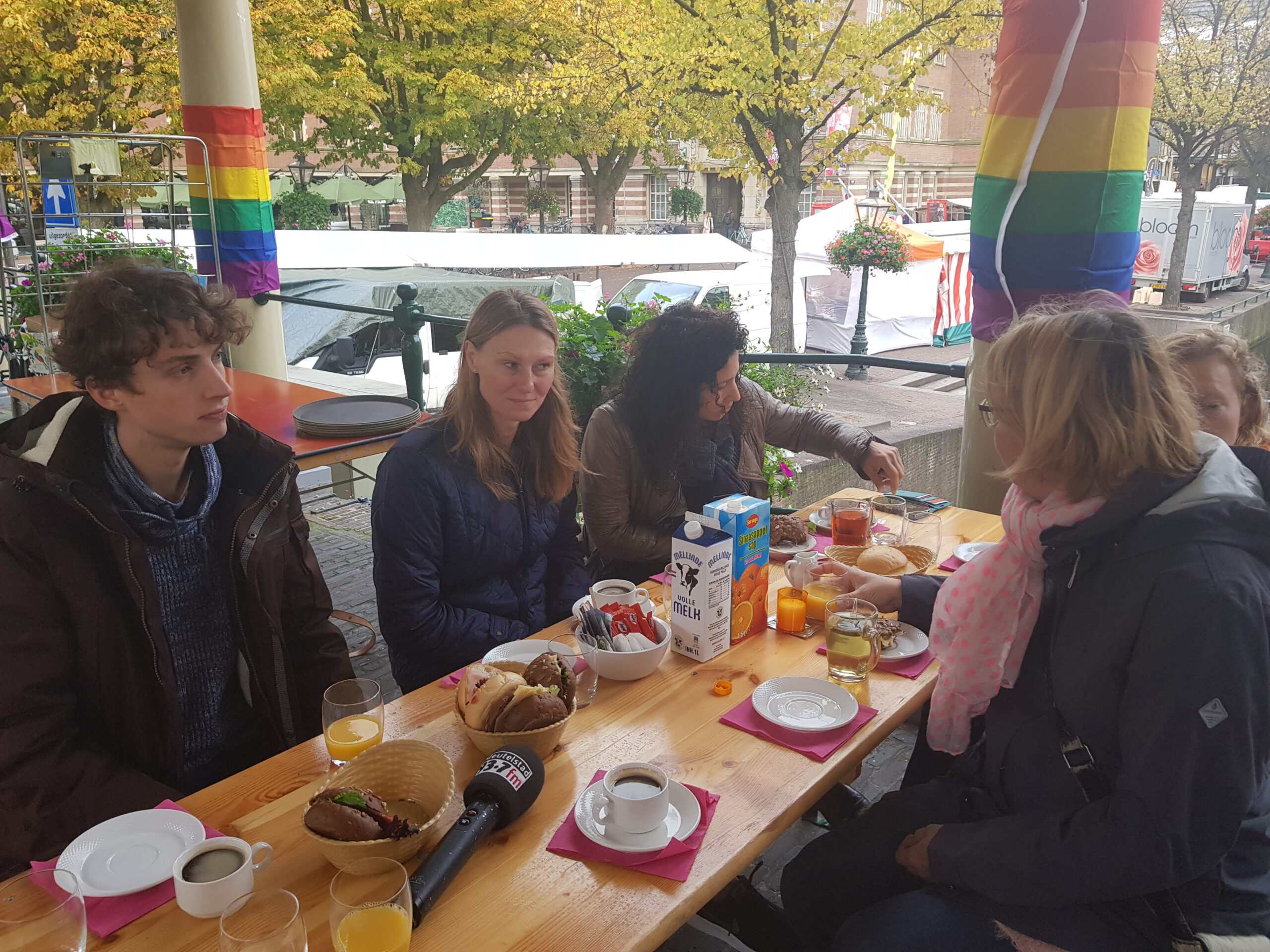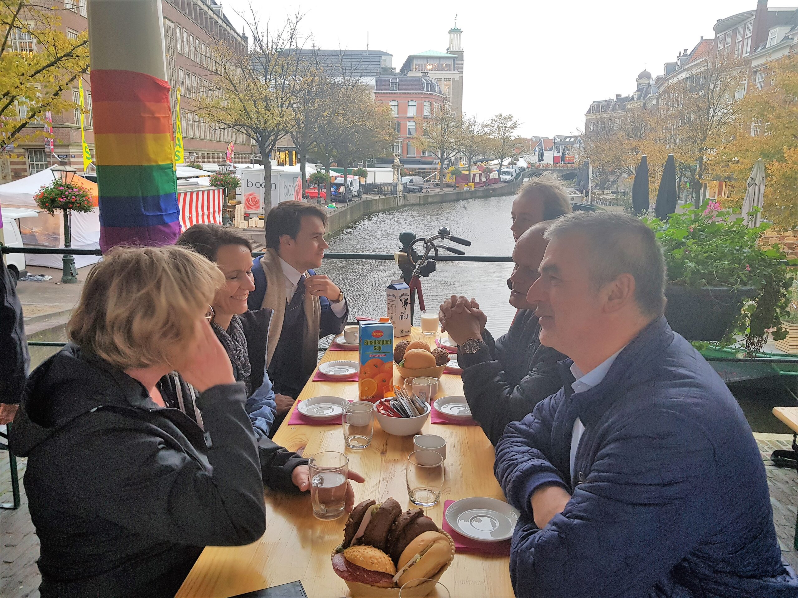 Gisteren was het internationale Coming Out Dag. in Leiden organiseerde het COC daarom verschillende activiteiten. Het begon in de ochtend met een Coming Out ontbijt in de buitenlucht. Op de Koornbeursbrug kwamen enkele tientallen vrijwilligers en leden van COC Leiden, de gemeente en andere maatschappelijke organisaties een broodje eten, terwijl ze luisterden naar de coming out-verhalen van een drietal sprekers. Aansluitend werd in de toren van het stadhuis een enorme regenboogvlag gehesen.