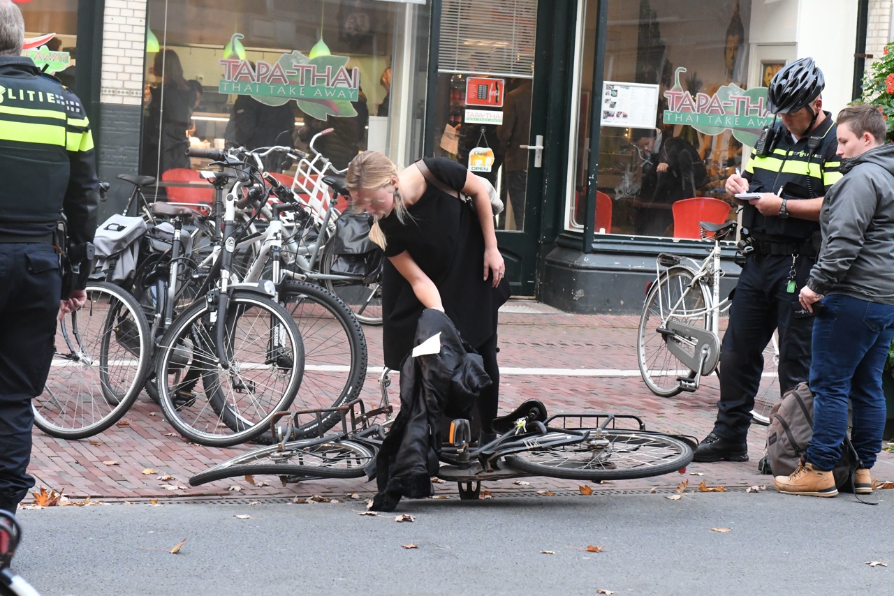 De vrouw fietste op de Stationsweg in Leiden richting het centrum toen ze met hoge snelheid werd ingehaald door een andere fietser. Daarvan schrok ze zo erg dat ze een slinger maakte naar de andere kant van de weg en daar op een haar tegemoetkomende fietser botste.