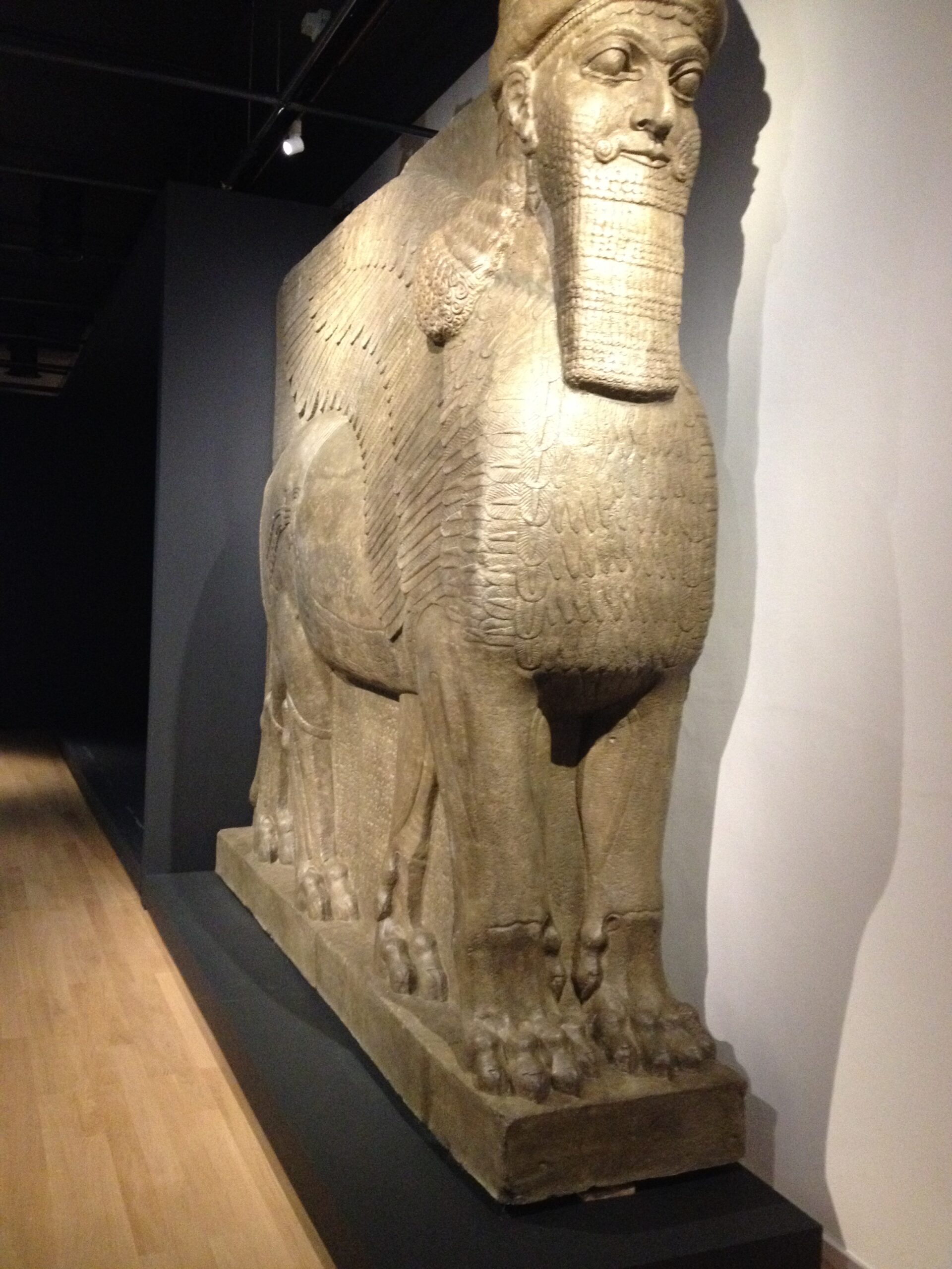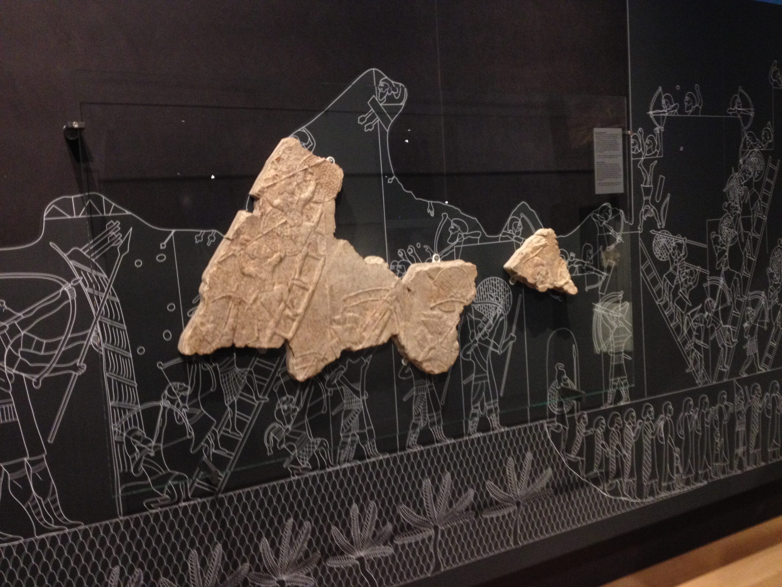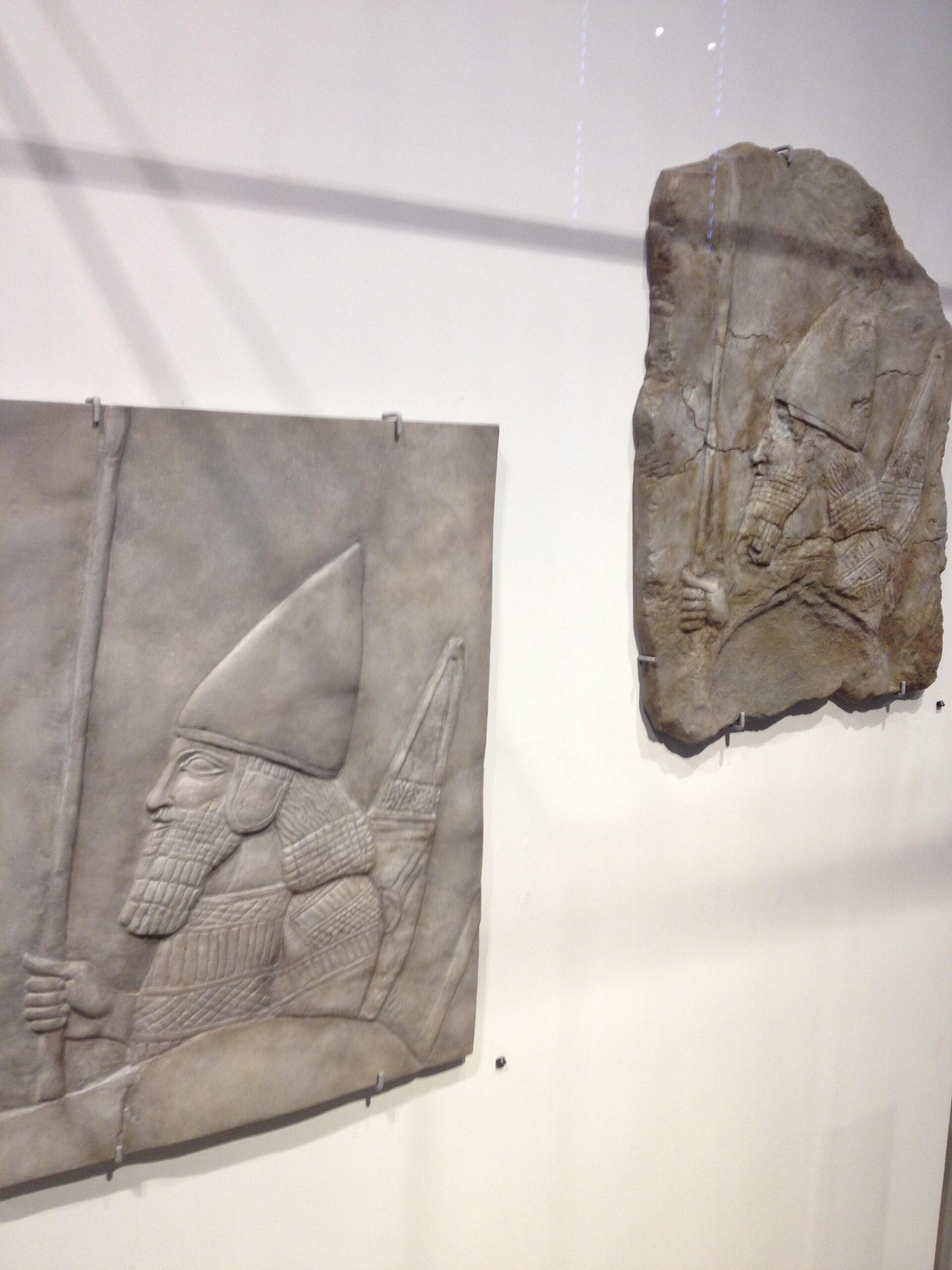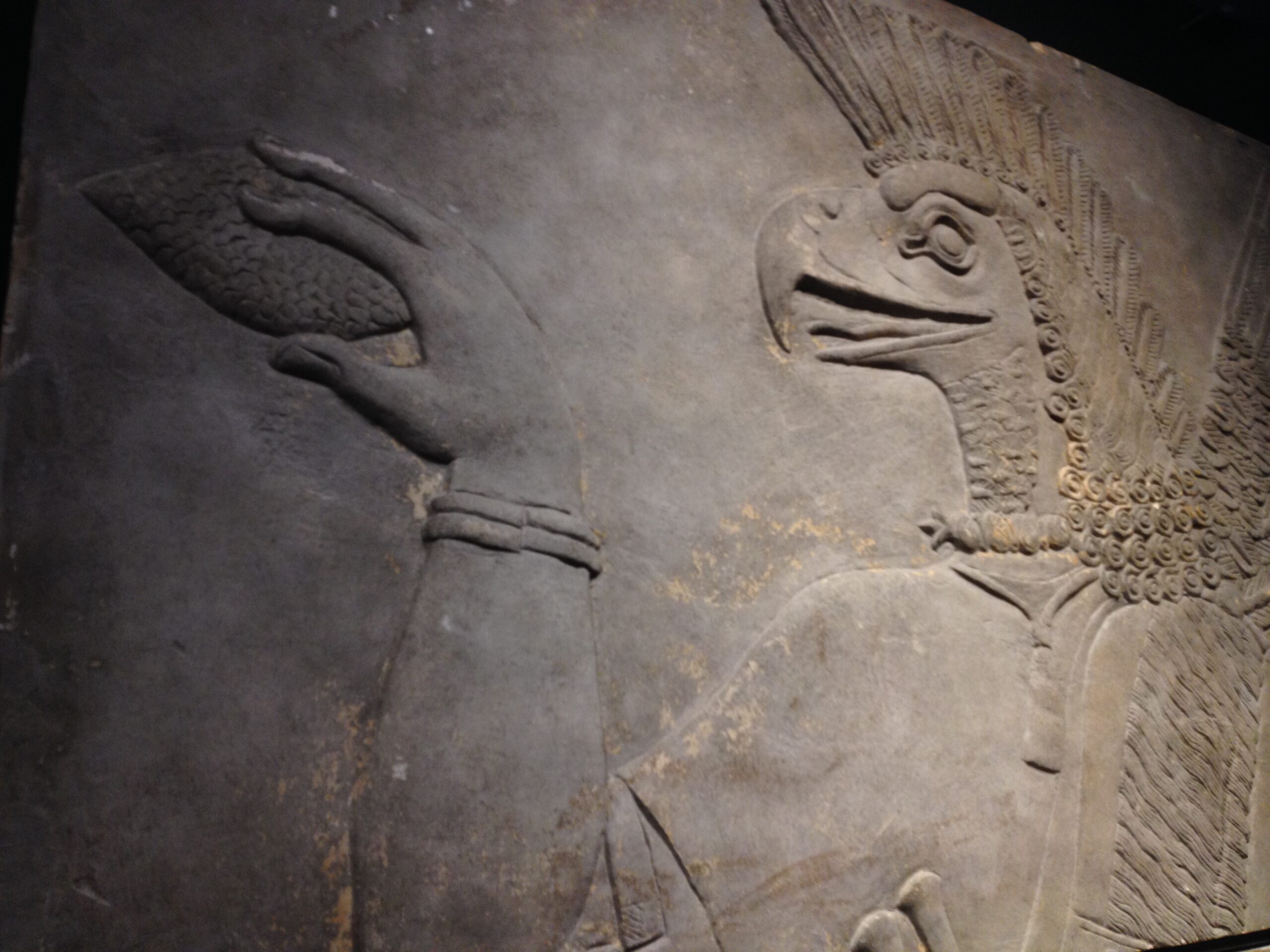 Details kunnen zo veelbetekenend zijn. Het bijschrift bij de lokale archeoloog Hormuzd Rassam, die veel opgroef maar daarvoor niet de roem ten deel viel omdat hij geen Brit was. Geen Brit. En dat terwijl in de vitrines eromheen ook is terug te vinden hoe cartografen en kunstenaars geheel gefantaseerde voorstellingen van (de lokatie van) Ninevé maakten. De beeldvorming rond Ninevé nodigde blijkbaar uit tot dergelijke fantasieën en sagen. Overigens konden de Assyriërs er zelf ook wat van. Eén van de levensgrote reliëfs toont een beschermgeest, die een dennenappel voor zich houdt; om kwade machten tegen te houden. Bijgeloof was Ninevé en zijn inwoners niet vreemd. Let vooral ook op de gedetailleerdheid van de voorstellingen.