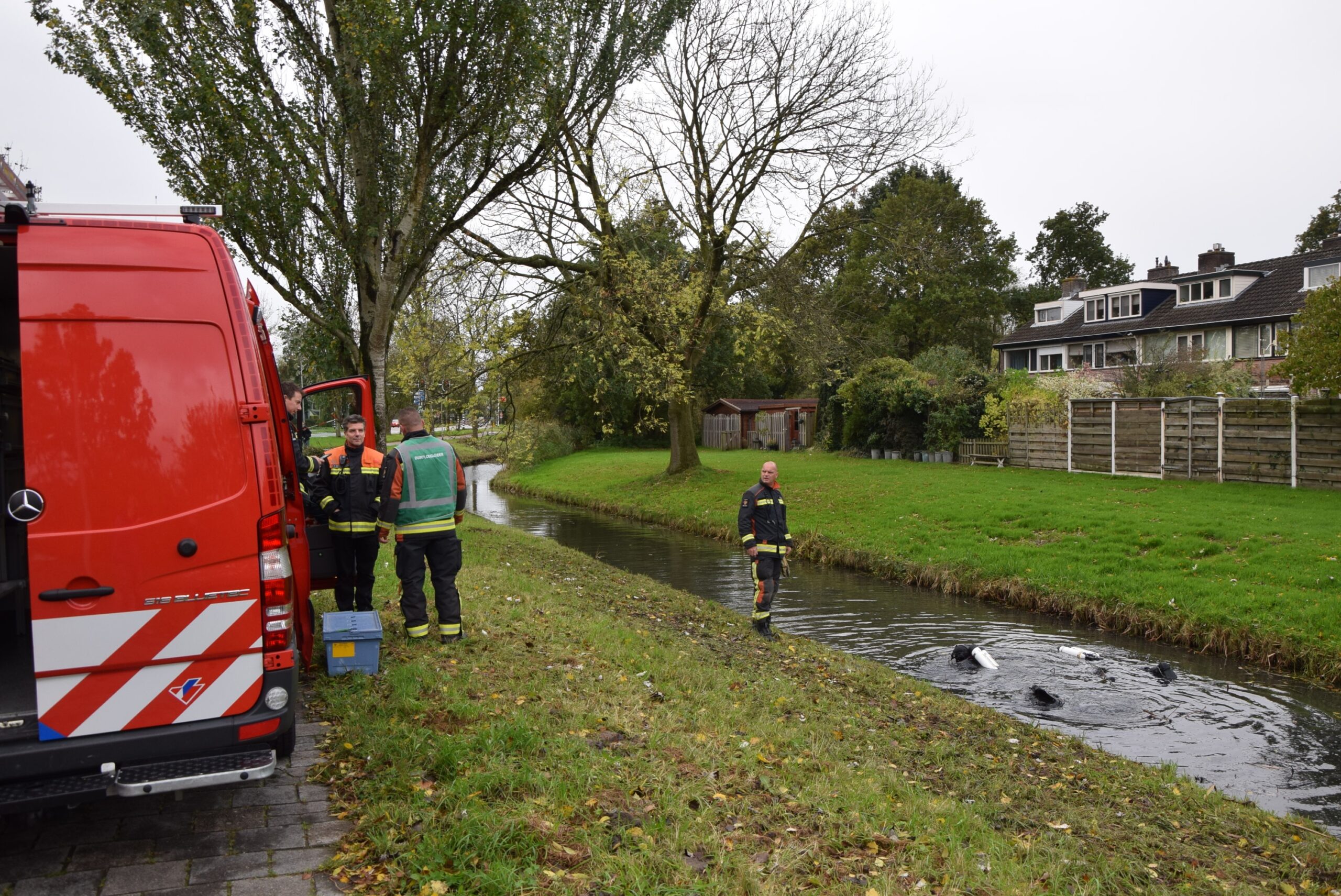 De brandweer heeft in de naastgelegen sloot gezocht naar een mes dat de dader weggegooid zou hebben.