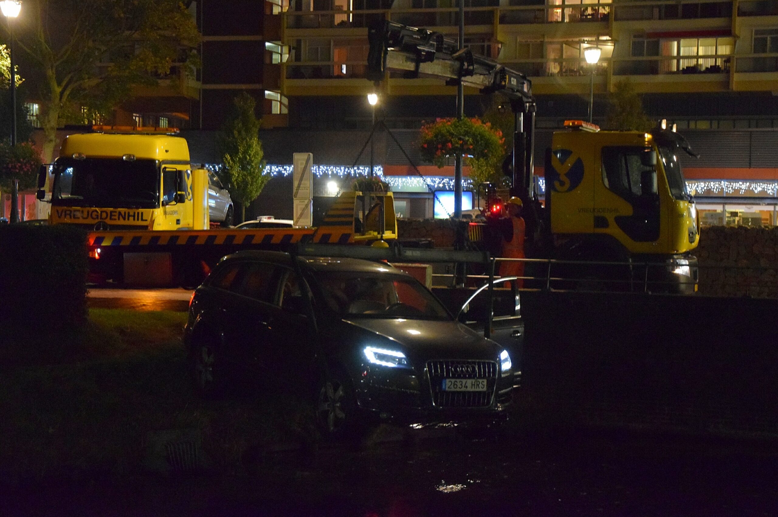 Twee bergingsvoertuigen moesten er aan te pas komen om de auto weer op het droge te zetten. Door die bergingsactie was de ingang van de parkeergarage enige tijd gestremd.