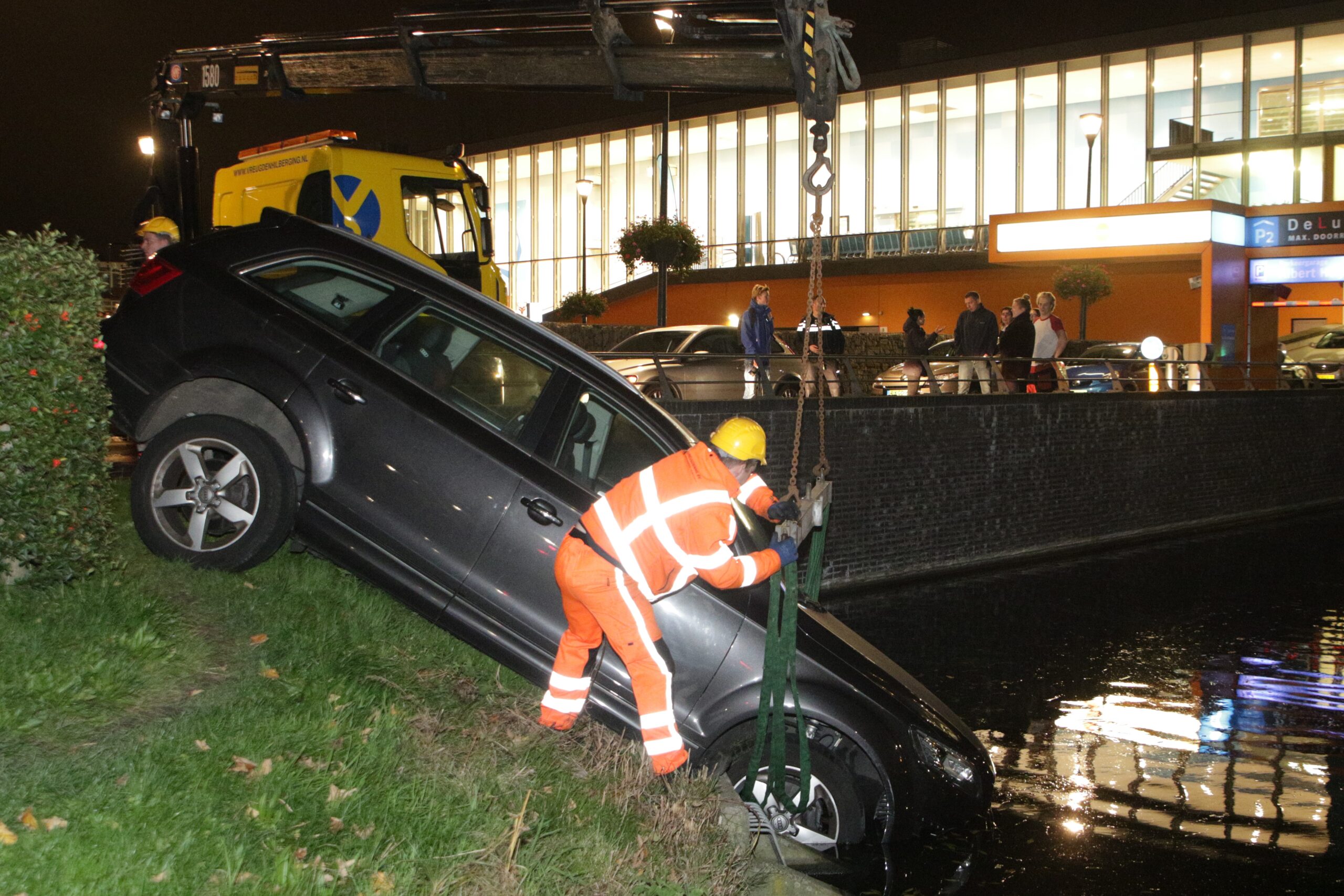 De auto schoot vooruit en kwam voor een deel in het water terecht. De bestuurder wist droog uit het voertuig te komen.