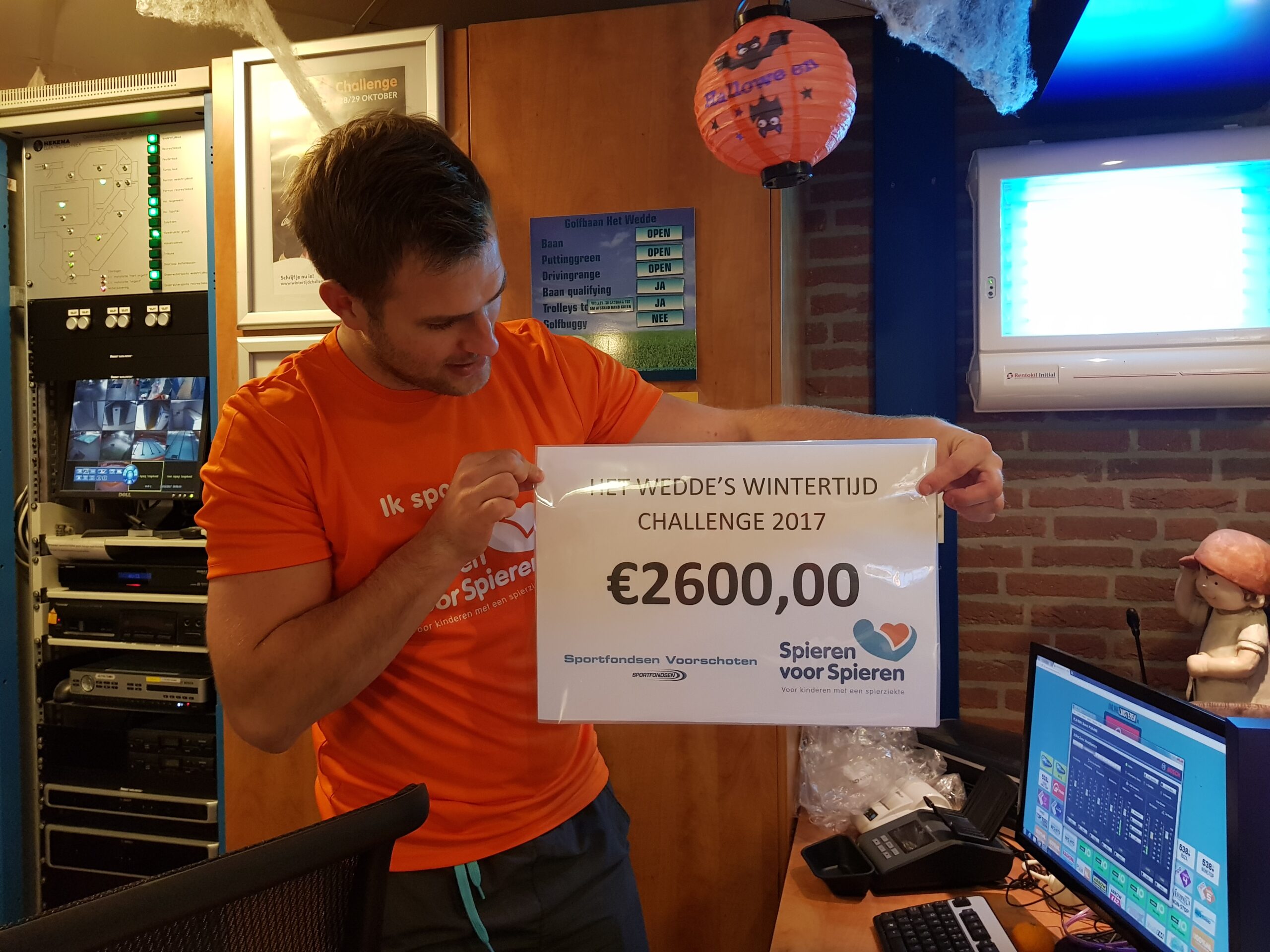 De deelnemers aan de Wintertijd Challenge die vannacht voor de vierde keer wordt gehouden in Zwembad het Wedde heeft sowieso 2.600 euro opgebracht voor Spieren voor Spieren. Rond 2.30 uur was dat het bedrag dat is totaal was gedoneerd aan de deelnemers. Update: Om 3.00 uur kon Pim van Hal van Sportfondsen Voorschoten melden dat zijn hoofdkantoor er nog 250 euro bij doet. De totale opbrengst kwam zodoende op 2.850 euro.