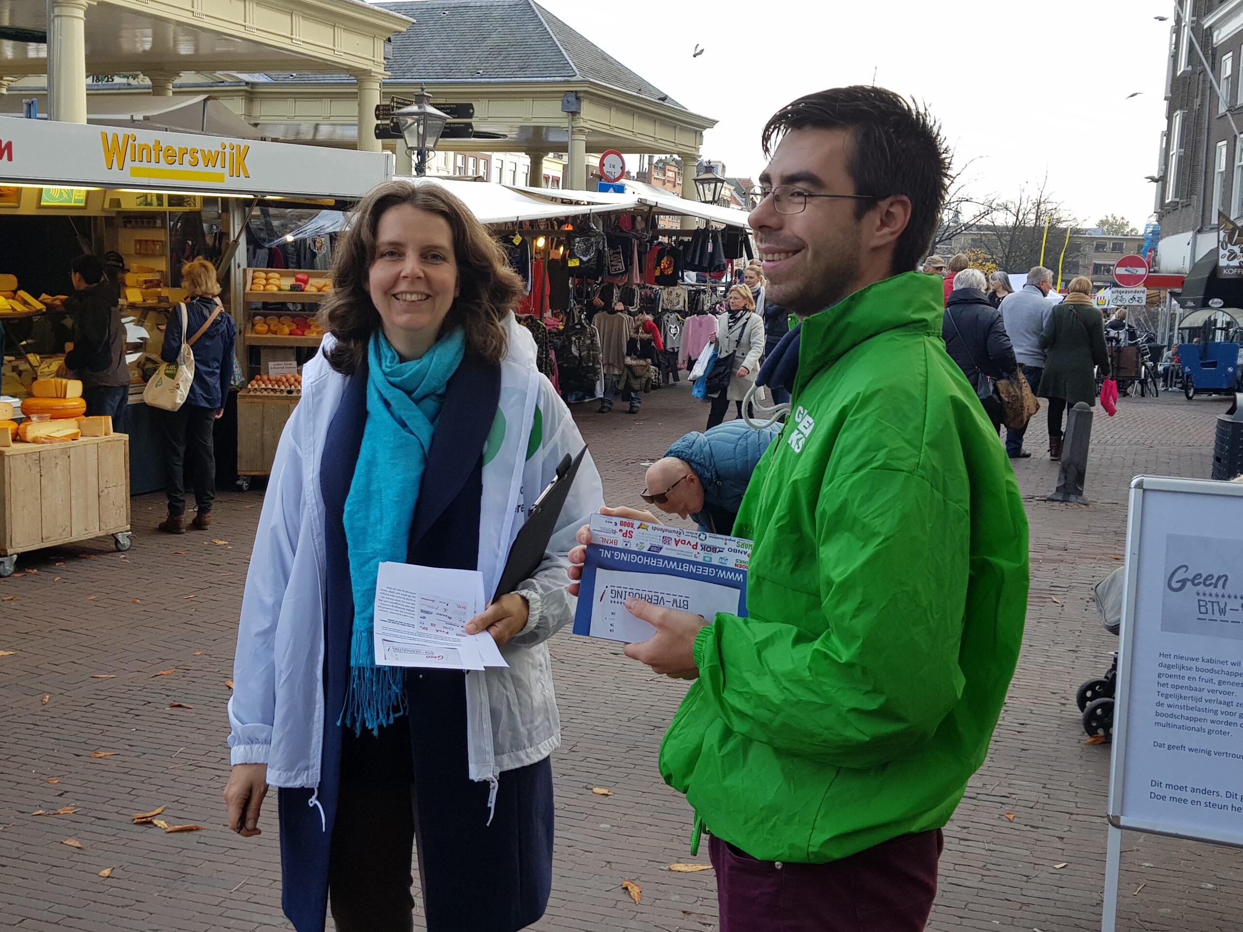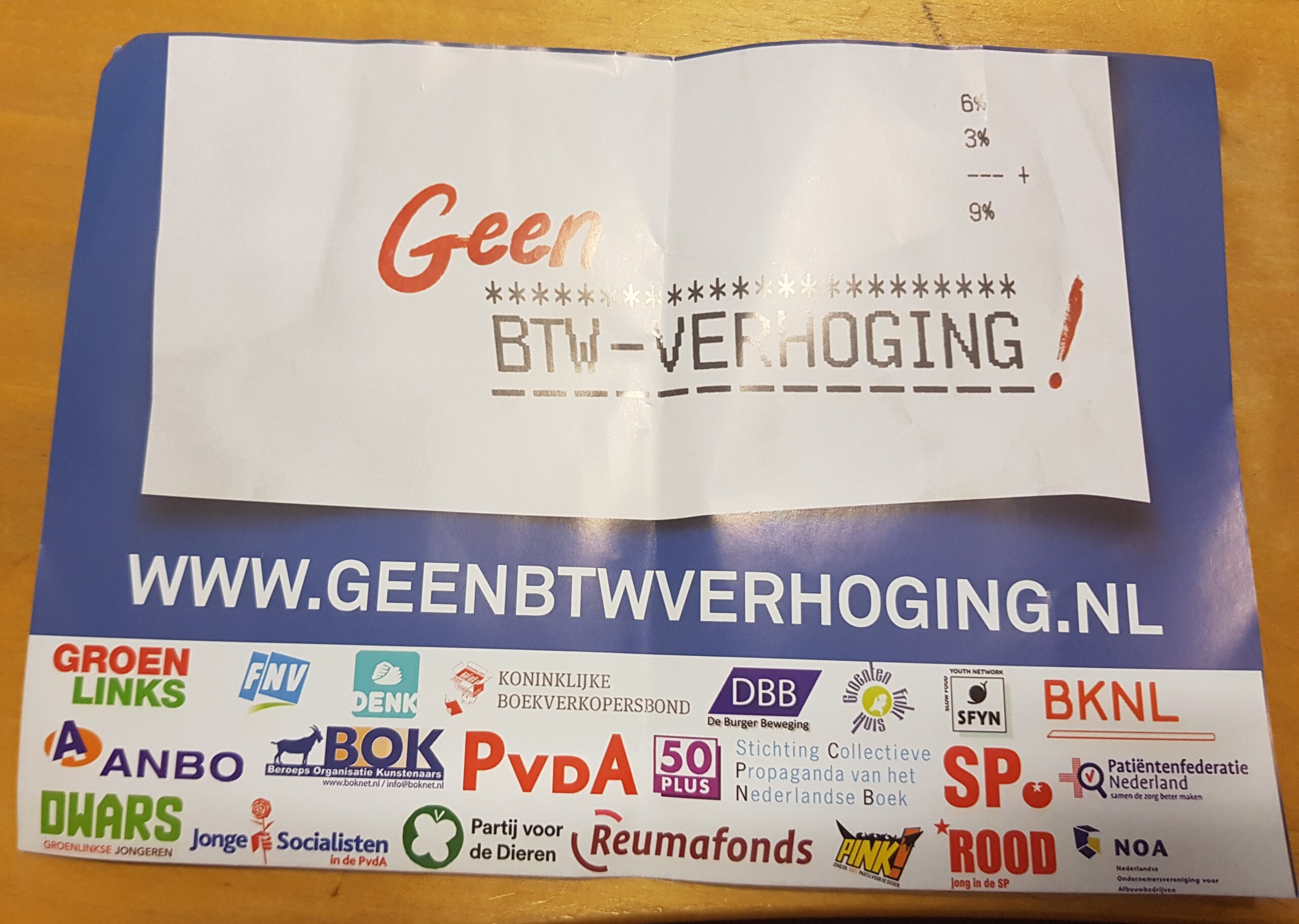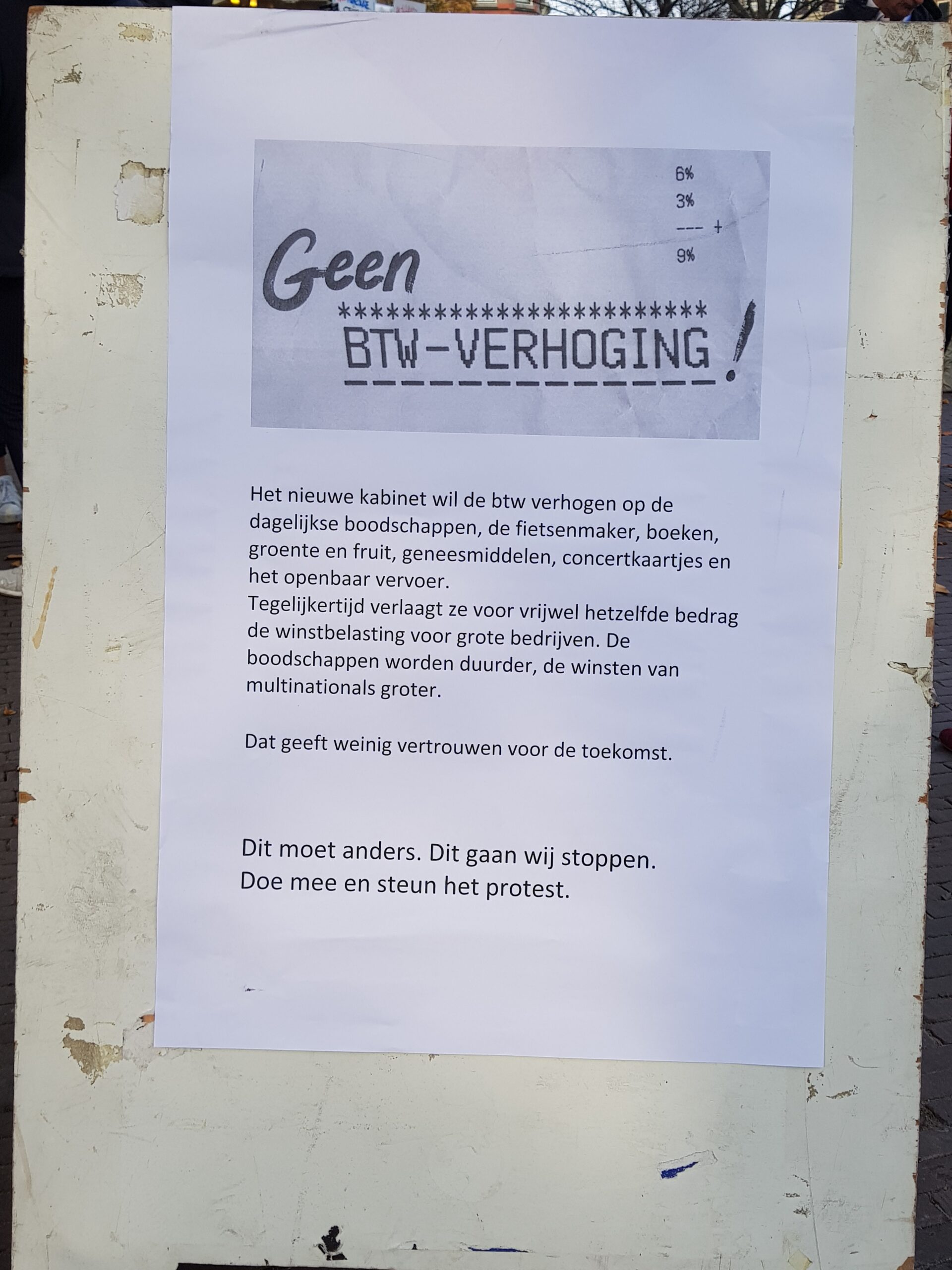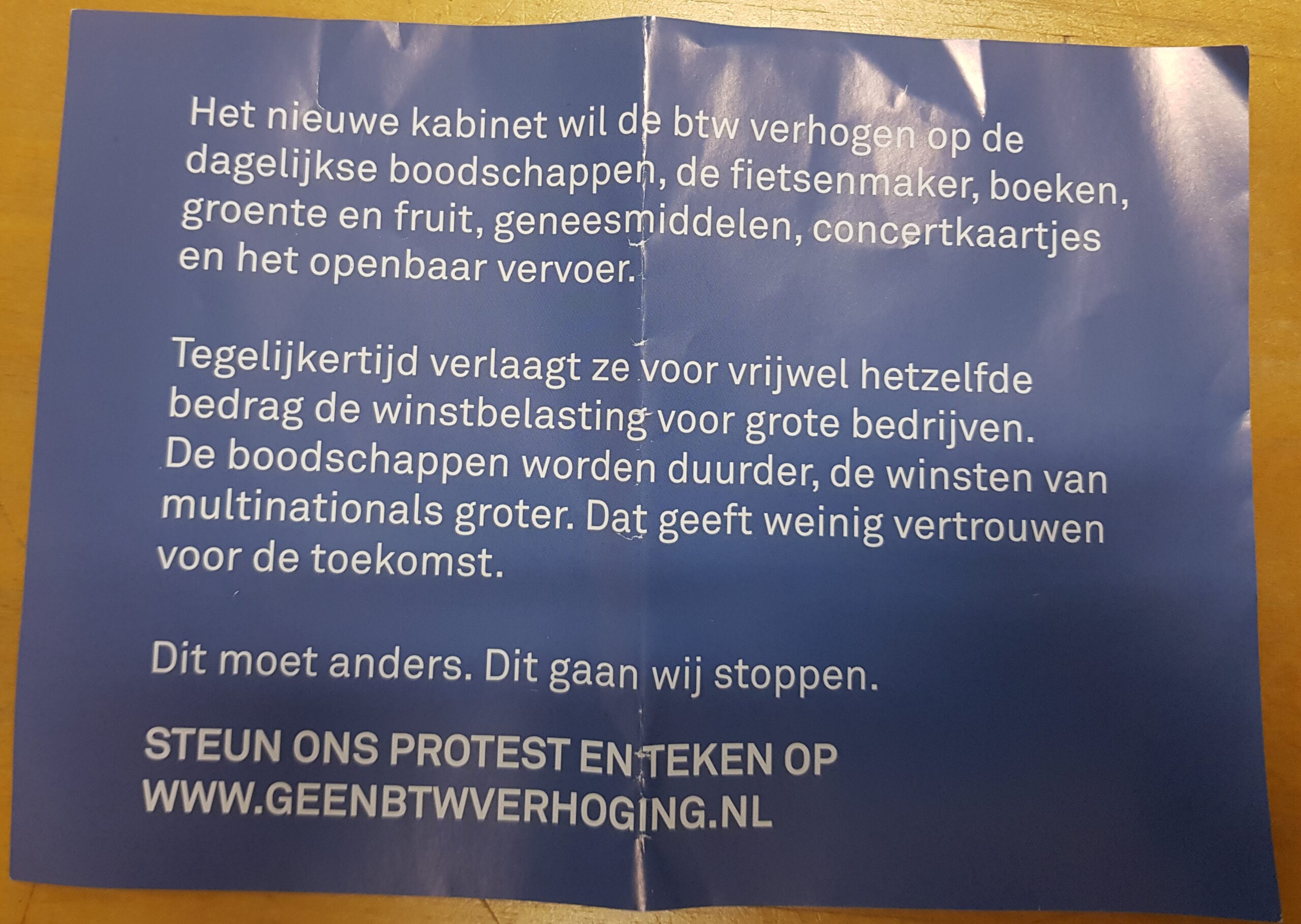 Aan het publiek werden flyers uitgedeeld en ook werden er handtekeningen ingezameld tegen de voorgenomen verhoging van het lage BTW-tarief van 6% naar 9% dat onder meer geldt voor levensmiddelen.