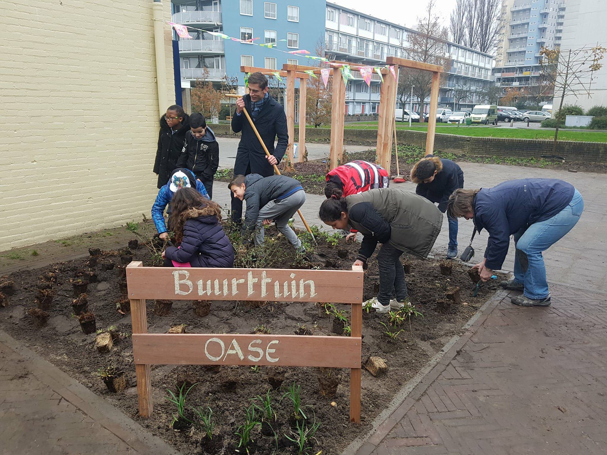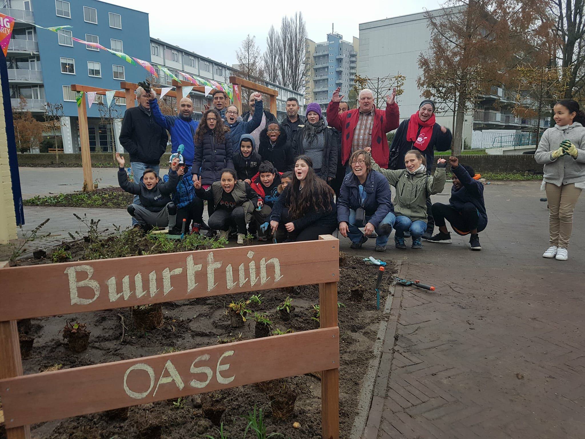 Bij buurtcentrum Op Eigen Wieken aan het Valkenpad in de Merenwijk is maandagochtend de buurttuin ‘Oase’ feestelijk geopend. Wethouder Paul Laudy (Bouw en Openbare Ruimte) gaf samen met kinderen en buurtbewoners het startsein voor de vergroening van het plein.