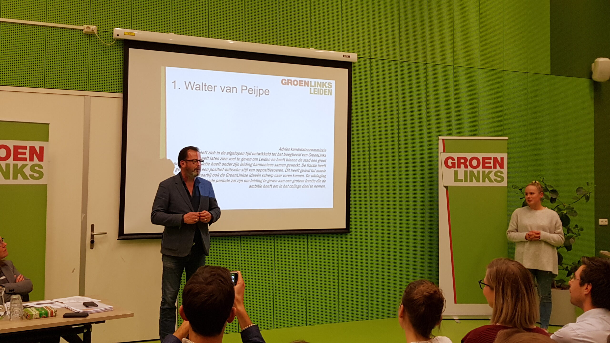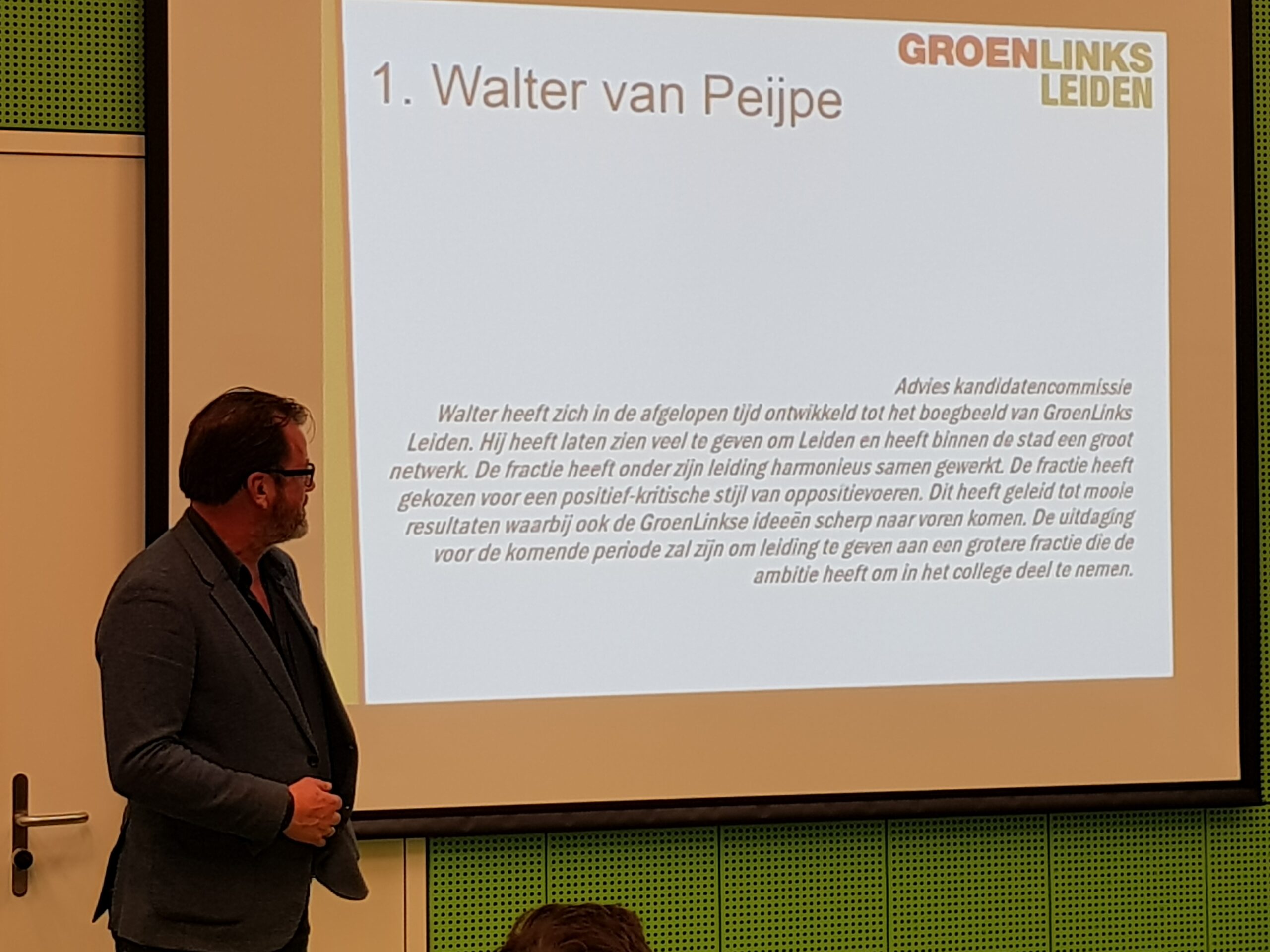 De ALV heeft Walter van Peijpe gekozen als lijsttrekker. Van Peijpe zit sinds 2010 in de Leidse gemeenteraad en is sinds begin 2016 fractievoorzitter. De kandidatencommissie omschrijft Van Peijpe als het boegbeeld van GroenLinks Leiden en roemt zijn grote netwerk in de stad en de positief-kritische stijl waarmee de huidige fractie de afgelopen jaren harmonieus heeft samengewerkt, zowel onderling als met andere partijen.
