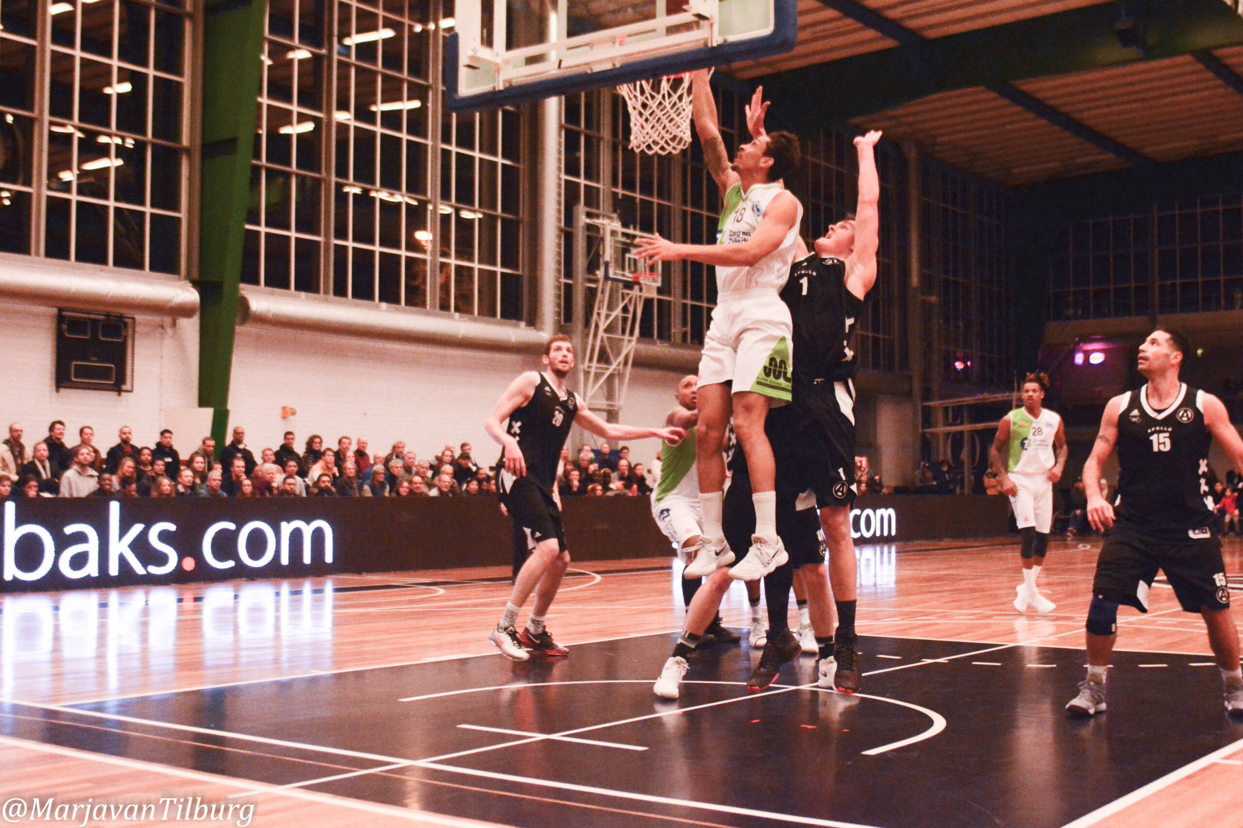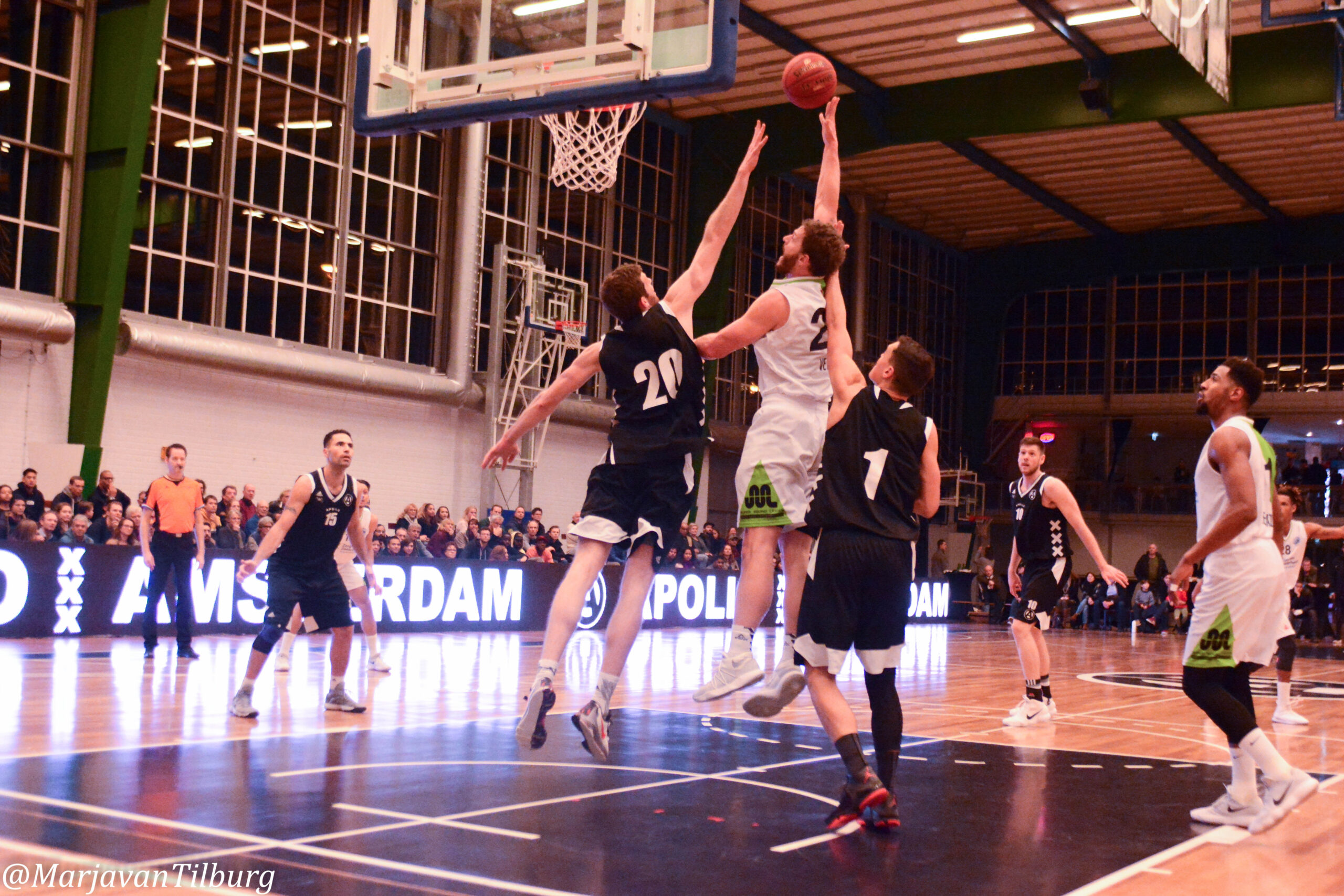 Het is al een paar keer eerder voorgekomen. Als een tegenstander dichterbij komt, zet Zorg en Zekerheid Leiden even aan en er is weer een veilige marge opgebouwd. In het eerste deel van het tweede kwart naderden de Amsterdammers, die bij tijden zone speelden, tot op zes punten: 26-32. Daarna volgde echter een 10-0 run van de Leidse ploeg via driepunters van Voorn en Love (die halverwege het tweede kwart al op 17 punten zat) en scores van Sergio de Randamie en Mohamed Kherrazi op de break. Eén minuut voor rust schoot Marijn Ververs 31-47 op het scorebord, maar door twee bommetjes van Jesse Markusse was het bij rust slechts 37-47.