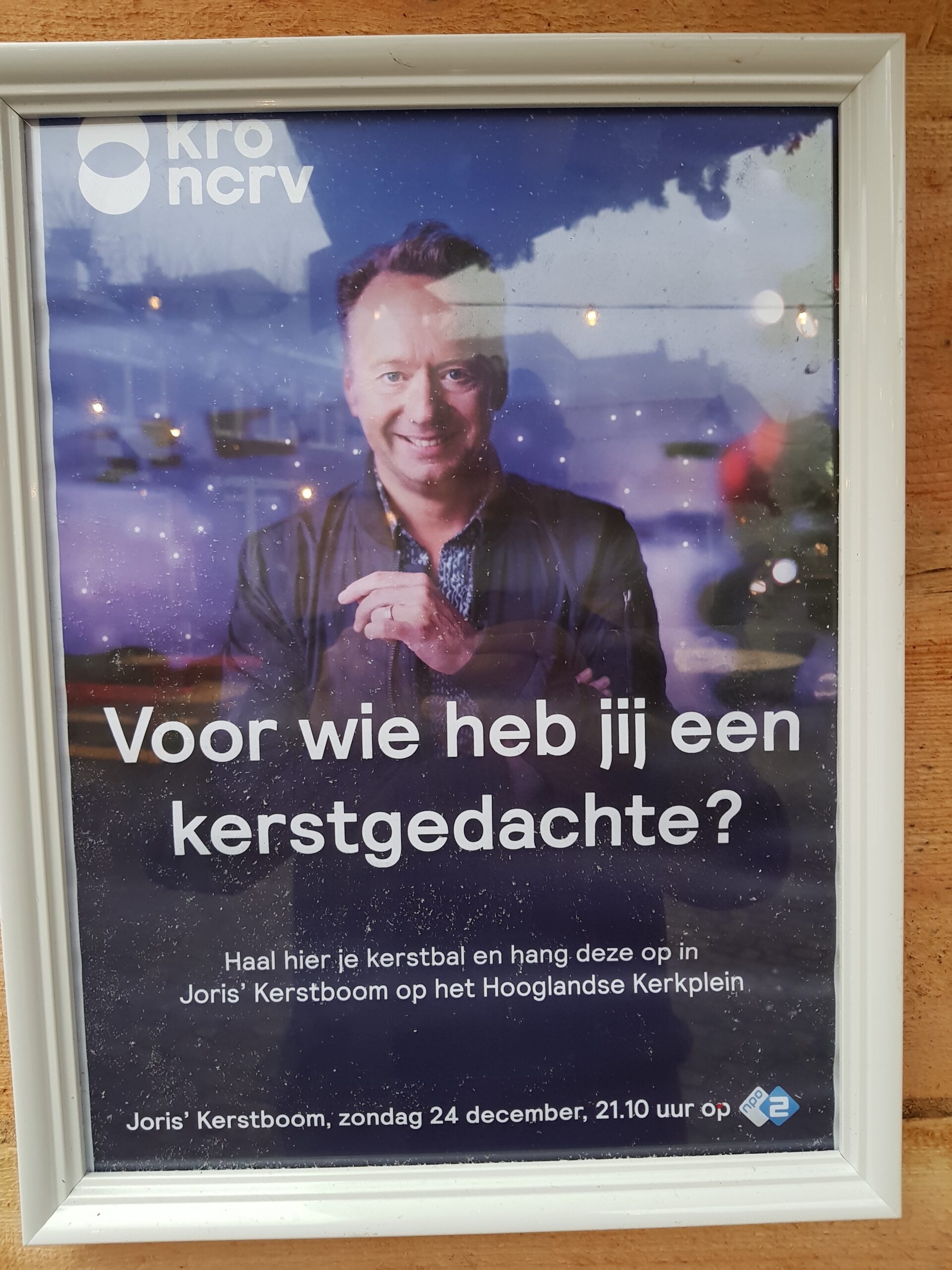 Zaterdagmiddag tussen 14.00 uur en 17.00 uur worden er in Leiden opnames gemaakt voor het televisieprogramma Joris’ Kerstboom. Elke dag kunnen er ballen in de boom worden gehangen met een foto van een dierbare. Zaterdagmiddag tekent Linssen een aantal verhalen op van mensen die een bal in de boom hingen.