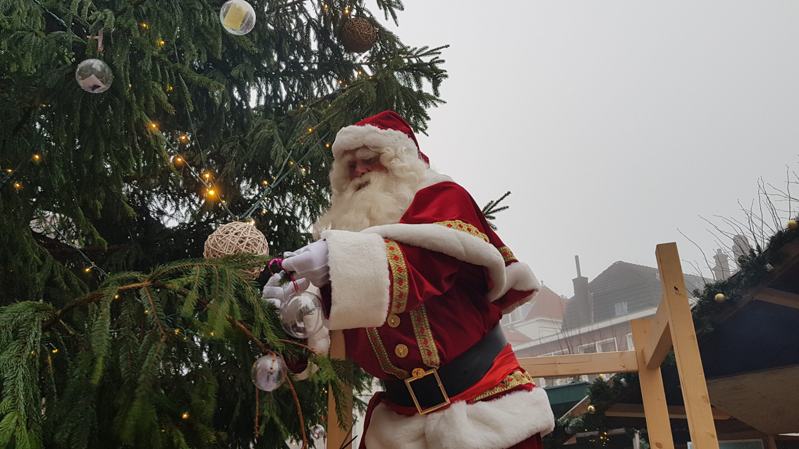 De kerstman hangt een bal in Joris’Kerstboom. Dat kan iedereen de komende dagen nog doen. Zaterdag worden bij de boom televisieopnames gemaakt met Joris Linssen.