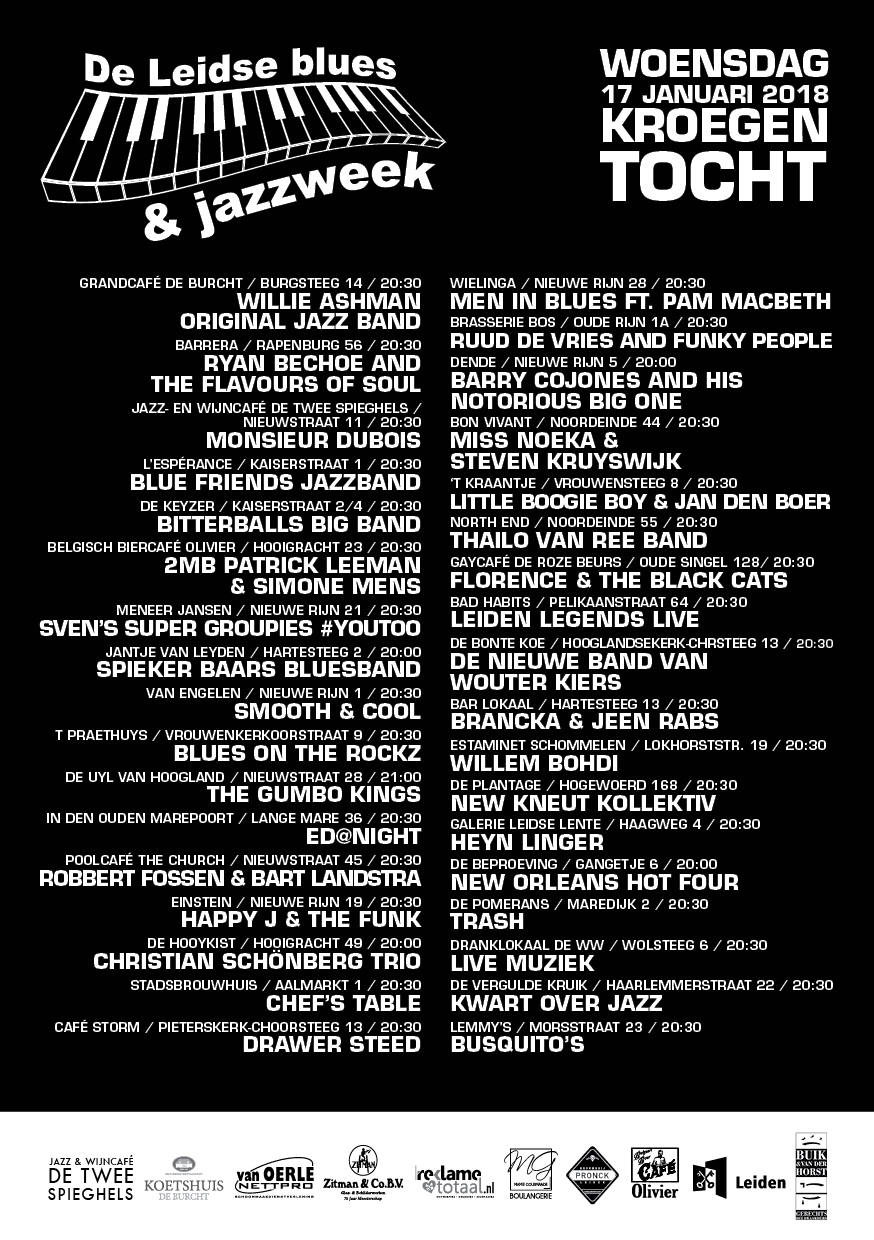 Natuurlijk kan de Kroegentocht niet ontbreken. Deze vindt plaats op de woensdag 17 januari. Meer dan 35 horecalocaties zullen die avond live blues- of jazzmuziek hebben. Ook dit jaar zijn er een aantal nieuwe deelnemende horecapodia, waaronder Grand Café De Burcht, Brasserie Bos, Belgisch Biercafé Olivier en Bar Lokaal. Naast de nieuwe podia zijn er ook de vertrouwde plekken als ‘t Praethuys, De Marenpoort en Lemmy’s. In de Pieterswijk en langs het Rapenburg is de “Jazzweek” ook flink aanwezig van de Keyzer tot aan Schommelen en de WW en alles wat op die route ligt. Natuurlijk is er langs de Nieuwe Rijn en rondom de Hooglandse Kerk op heel veel plekken muziek te horen.