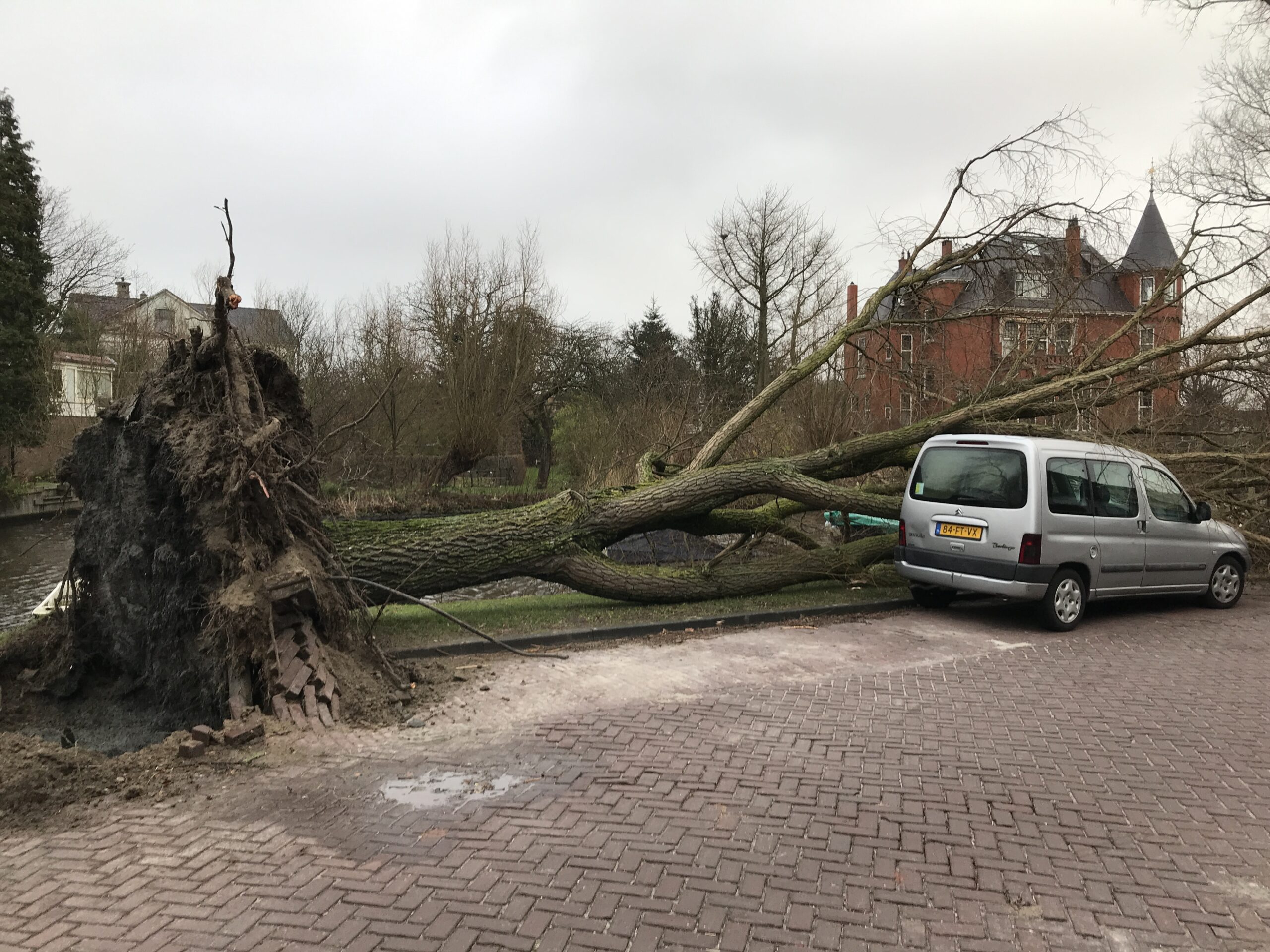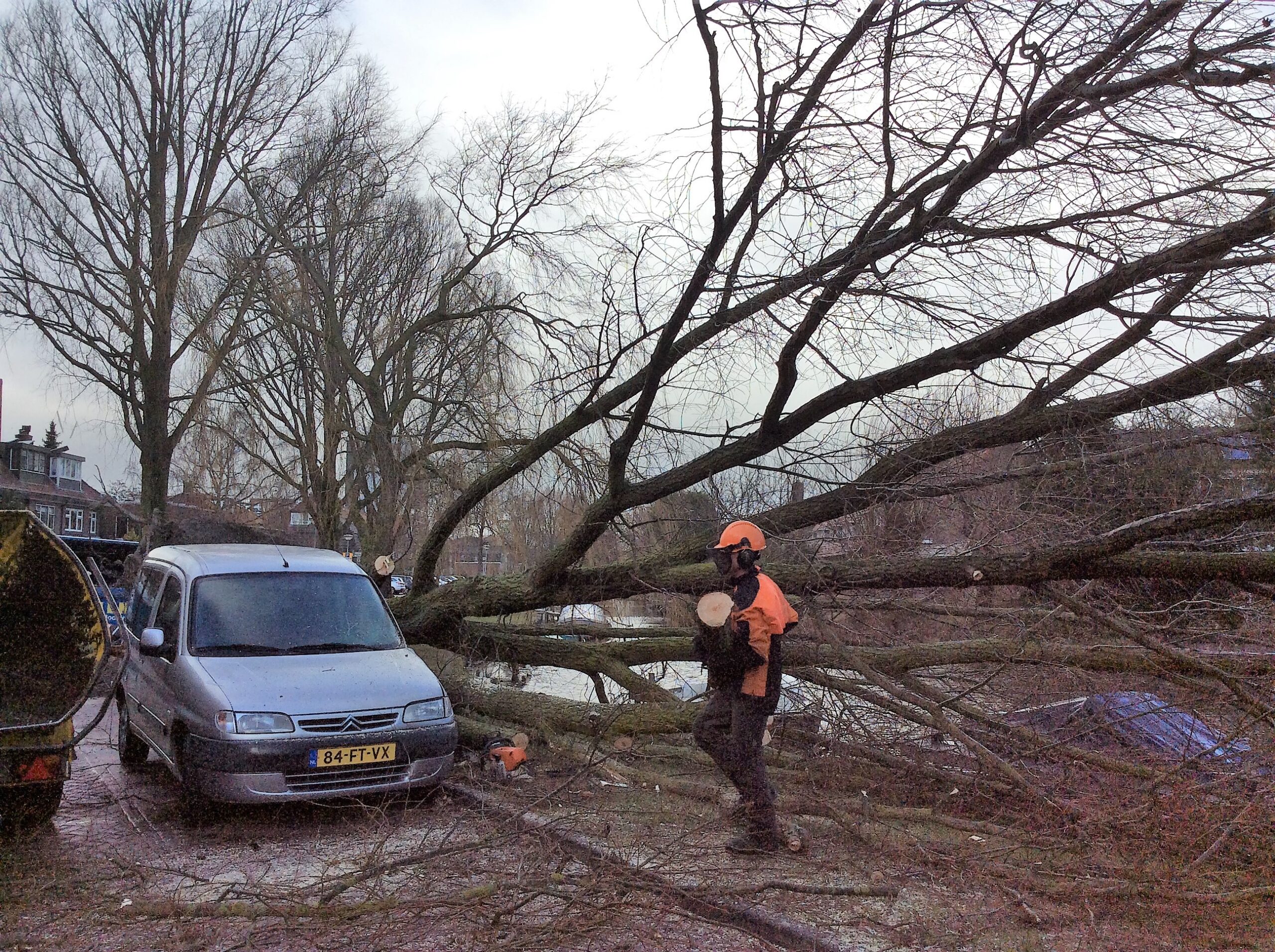 Aan de Rijn en Schiekade is een van de grote bomen omgewaaid die daar langs het water staan. De boom kwam deels op een geparkeerde auto terecht. Ook in de tuinen achter de woningen hebben afgewaaide takken voor schade gezorgd.