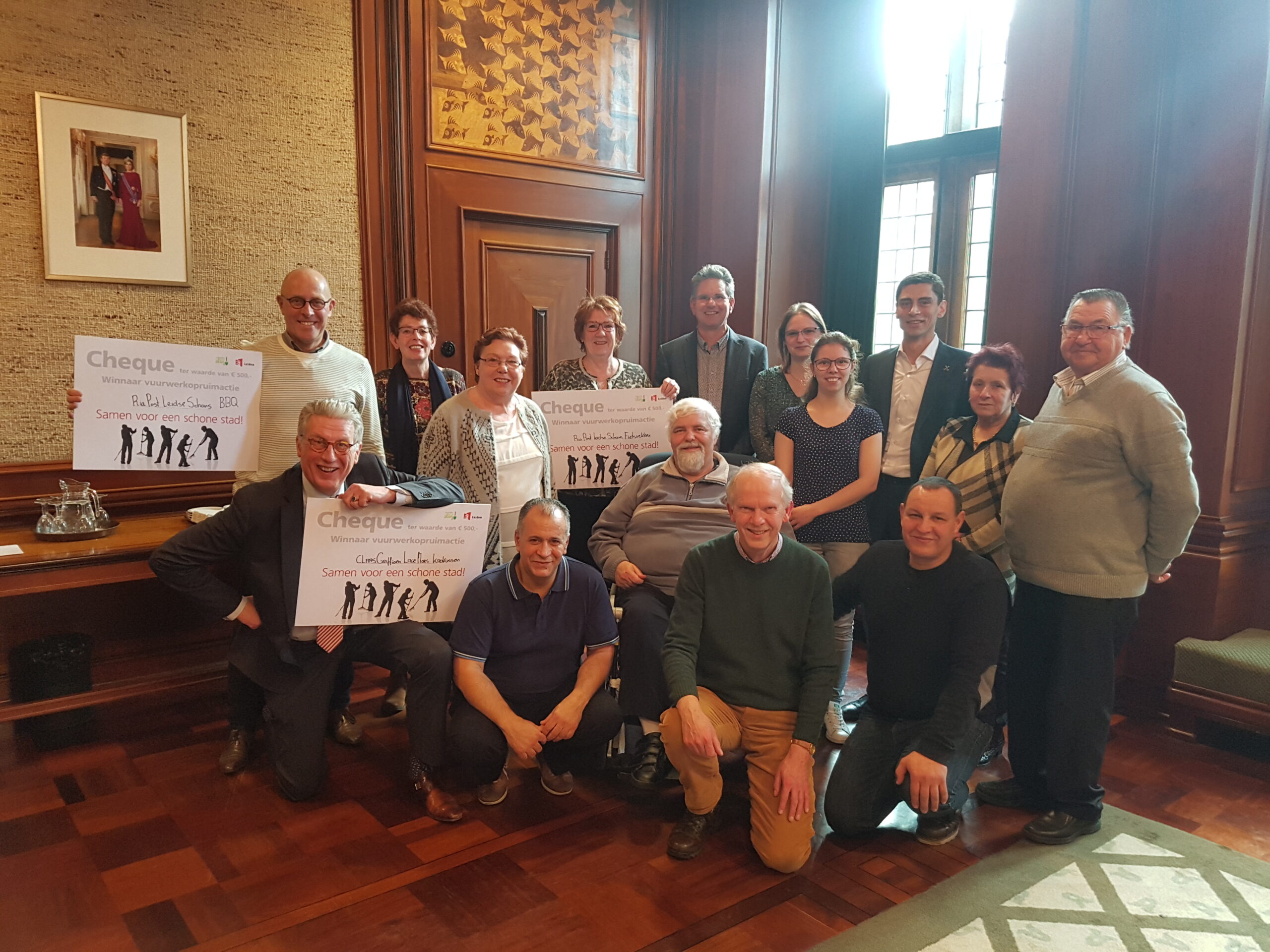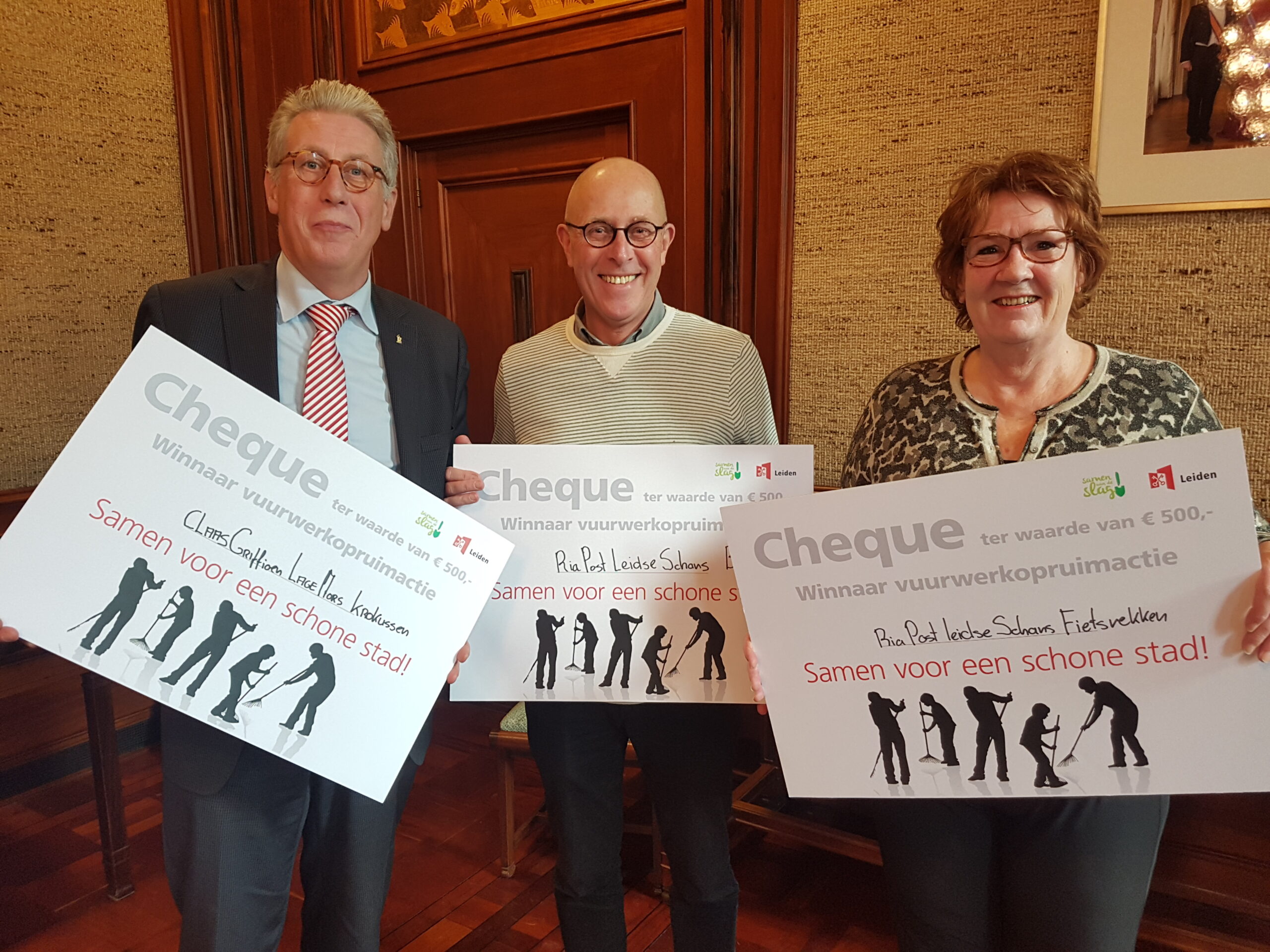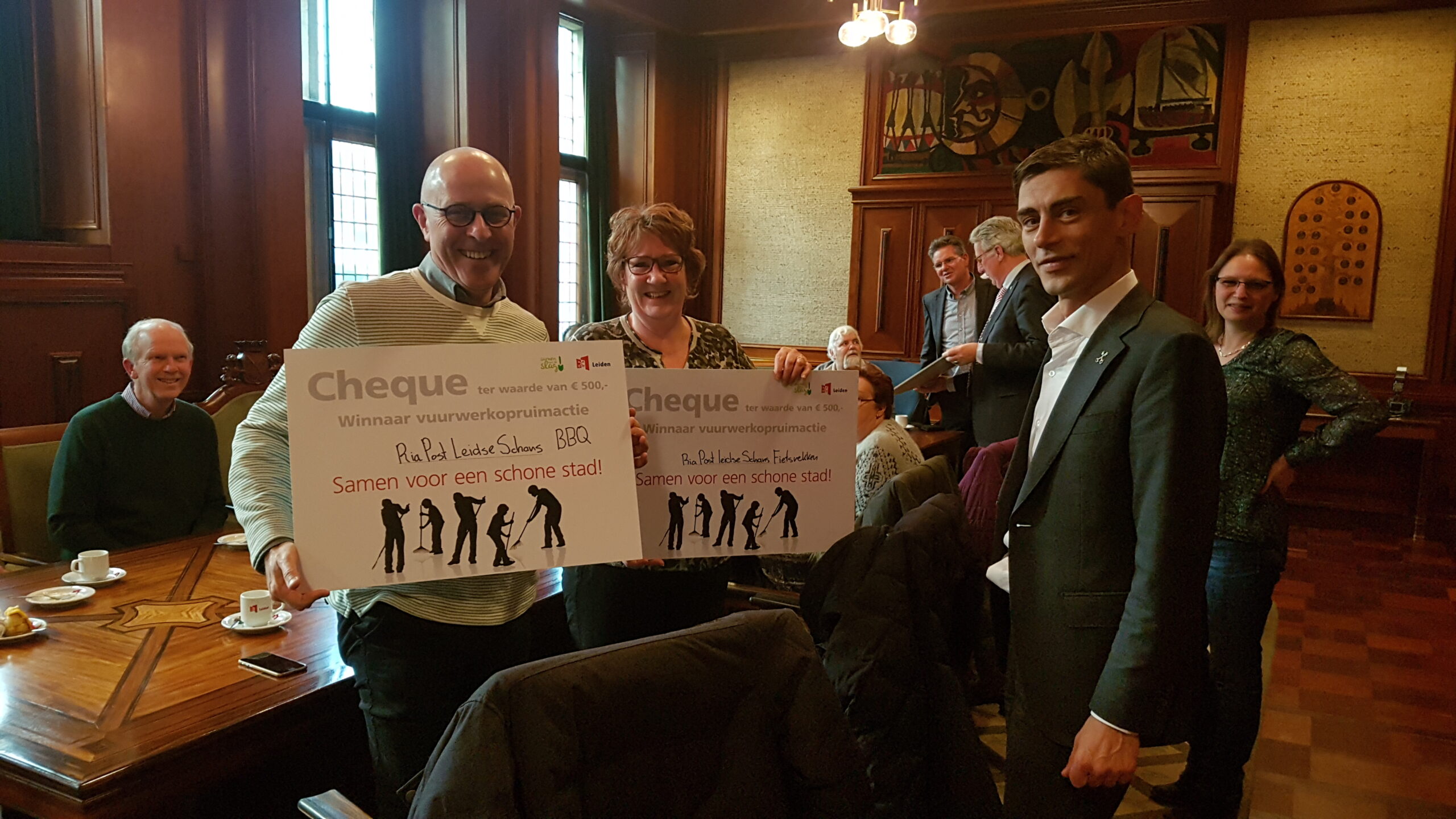 De gemeente Leiden heeft drie buurtcheques beschikbaar gesteld voor Leidenaren die na de jaarwisseling meehielpen hun eigen buurt zo snel mogelijk weer schoon te krijgen. Van alle buurten die meededen met de vuurwerkopruimactie werden een aantal vertegenwoordigers uitgenodigd op het stadhuis. Ze mochten ideeën voor hun buurt indienen en maakten kans op een bijdrage van 500,00 euro per idee.