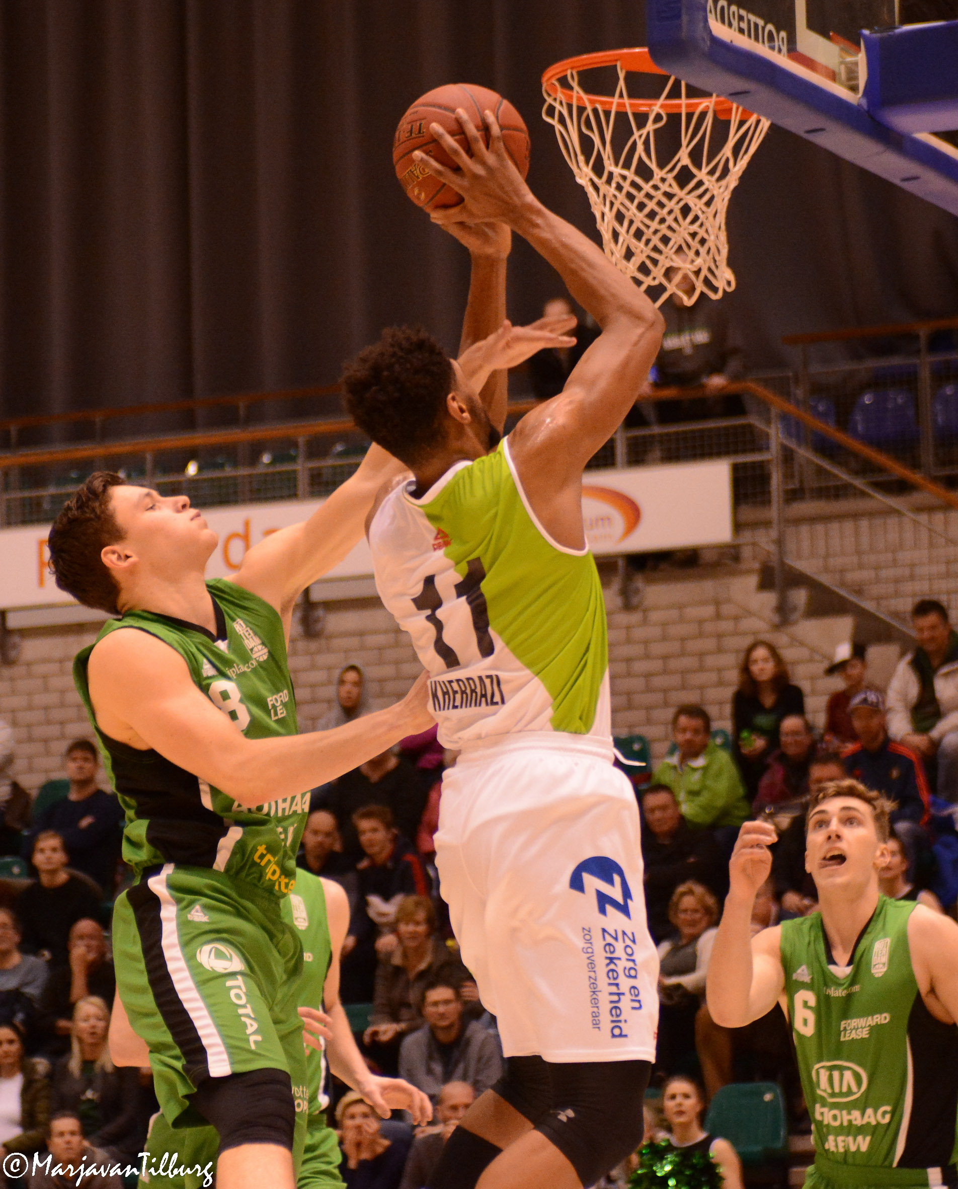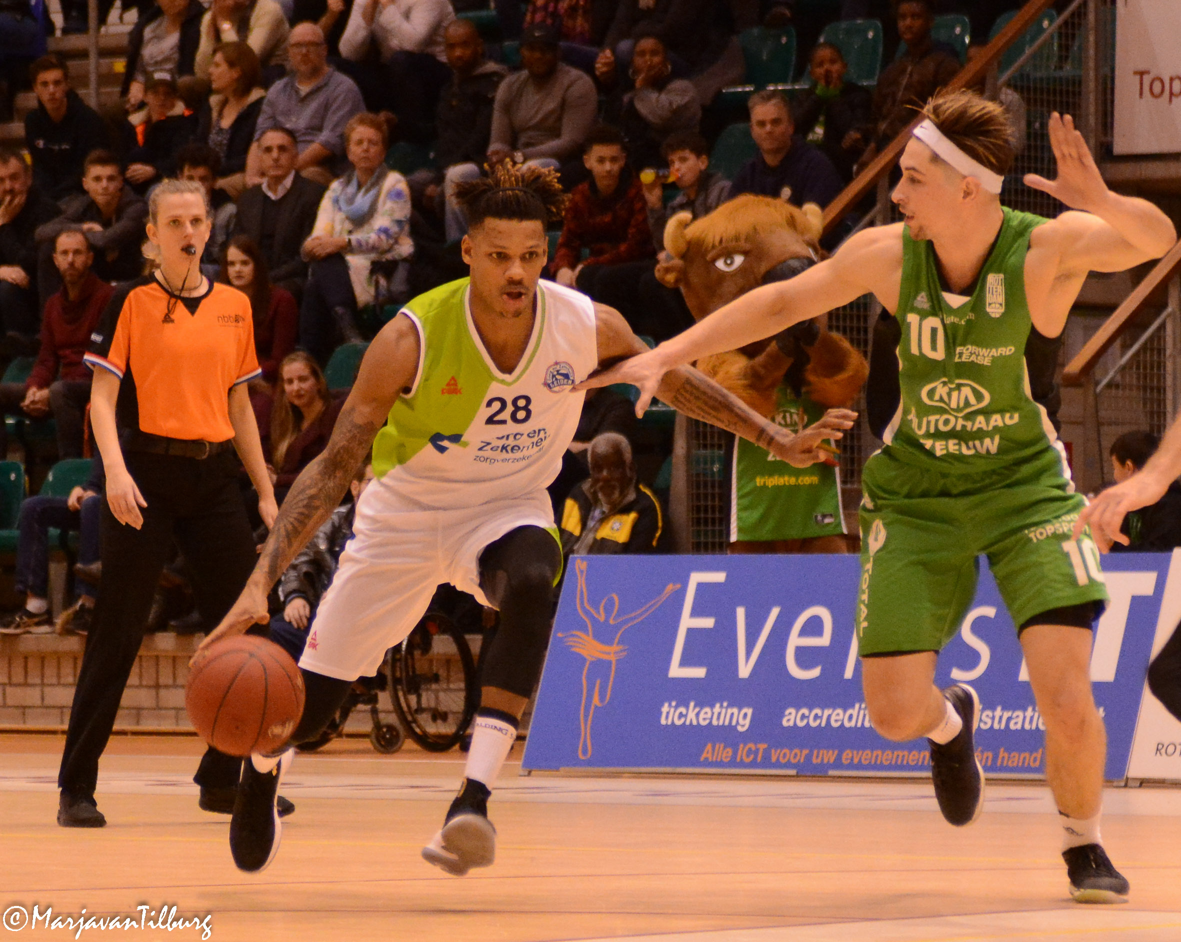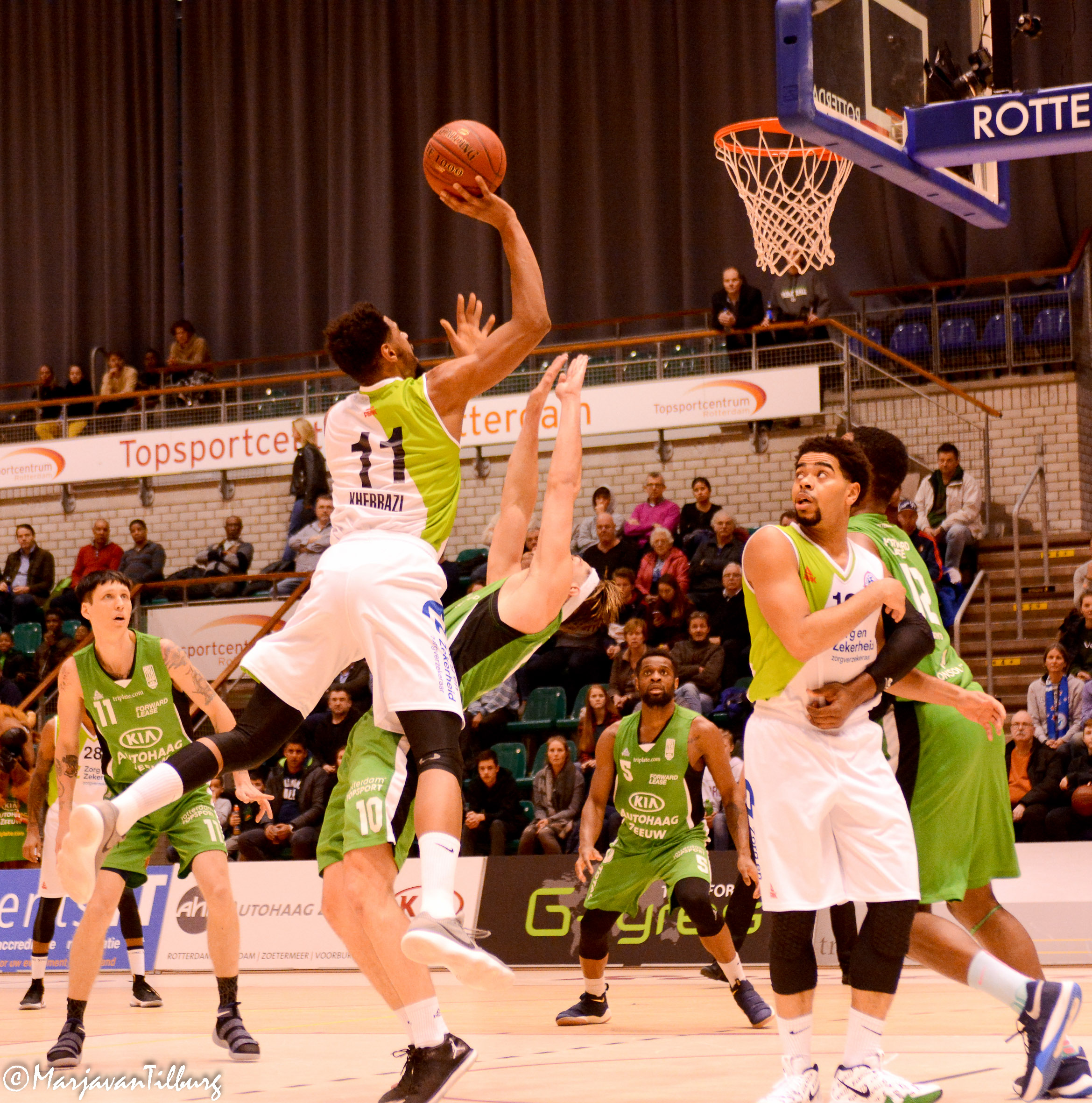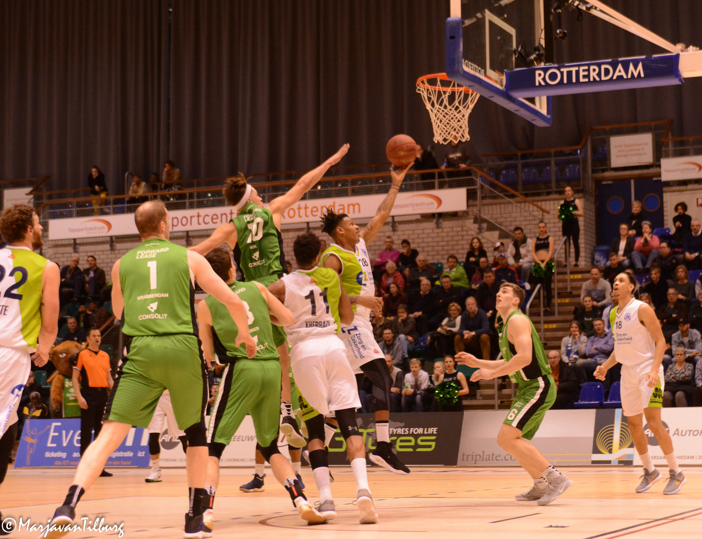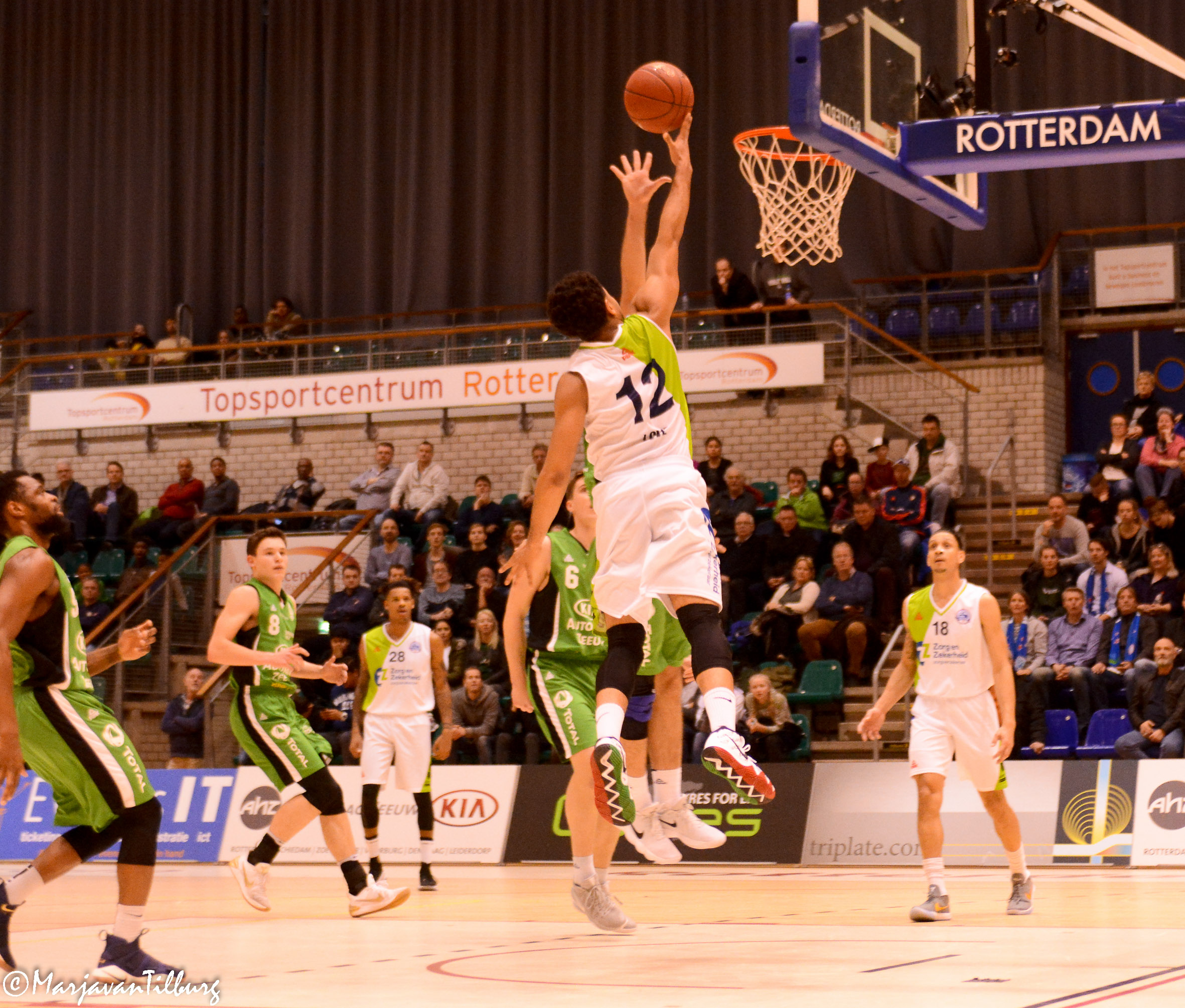 In Rotterdam ging het dus mis. Zorg en Zekerheid Leiden had moeite met de Rotterdamse verdediging. Er zat al geen tempo in de wedstrijd, wat deels de verdienste was van de Rotterdammers, maar het schot was overduidelijk in de kleedkamer achtergebleven. Laat dat nou precies datgene zijn waar de Leidse ploeg mee bezig was. In plaats van sterke penetraties naar de ring of daar de vrije man zien te vinden, werd er keer op keer voor schoten van ver gekozen. Nu zitten enkele spelers even niet lekker in hun vel en dat uitte zich door de vele missers. Maar liefst elf keer op rij werd een driepunter gemist. De voor rust sterk spelende Marijn Ververs brak halverwege het tweede kwart met de eerste rake bom voor Zorg en Zekerheid Leiden.