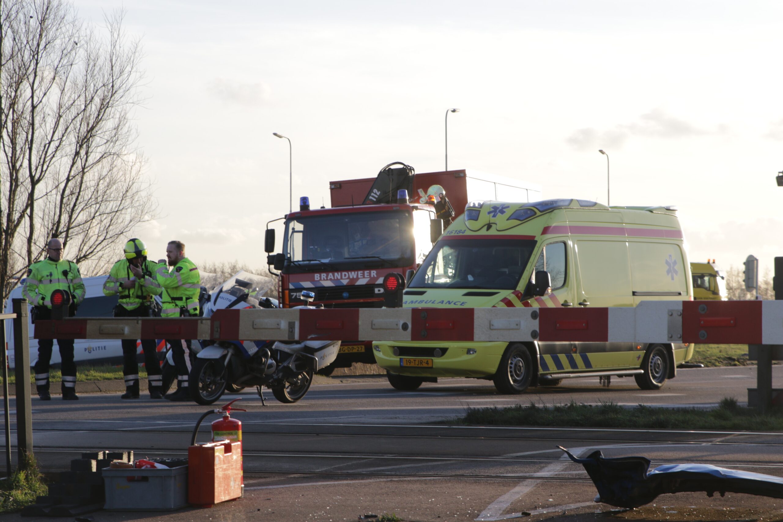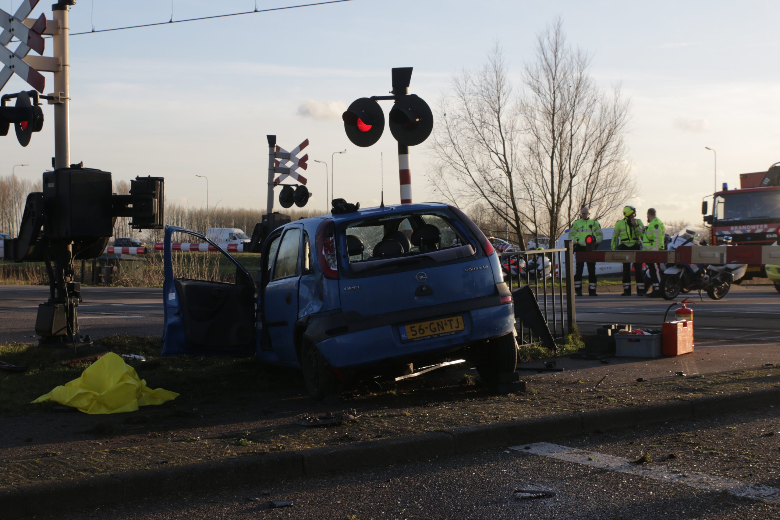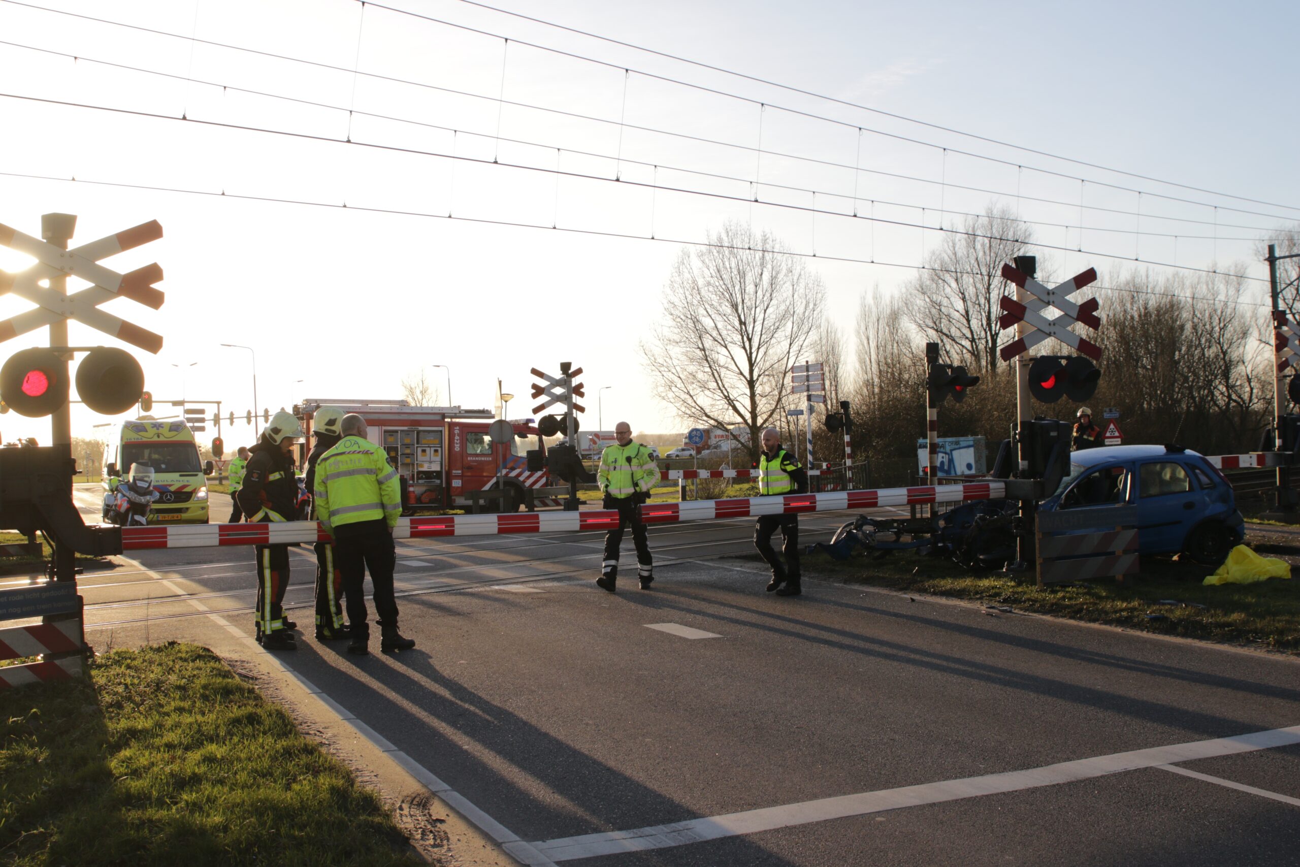 Een persoon is uit de auto gehaald en wordt nagekeken door het ambulancepersoneel. Hoe het ongeval heeft kunnen gebeuren is nog niet bekend. Door het ongeval is er ook geen treinverkeer mogelijk.