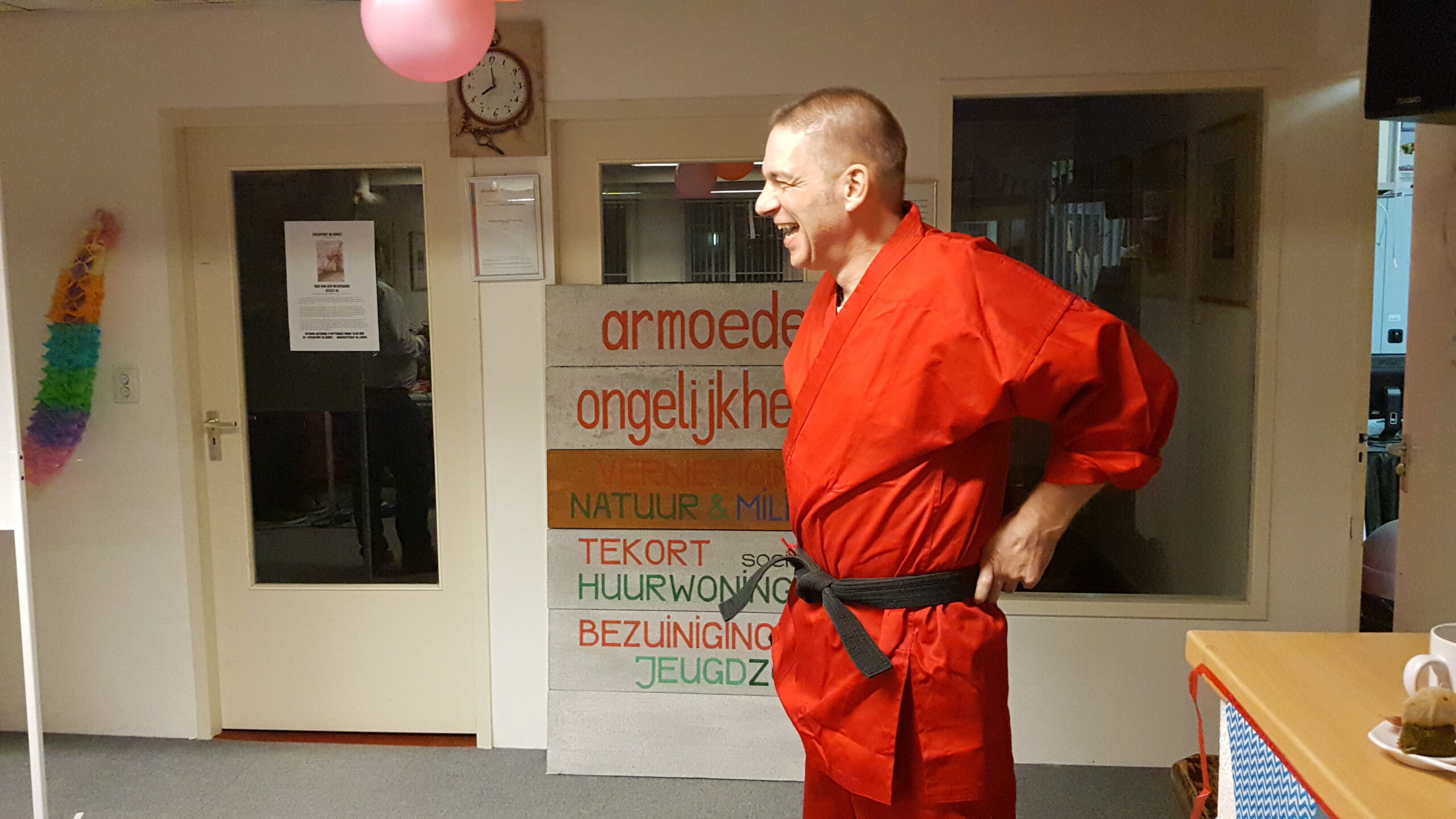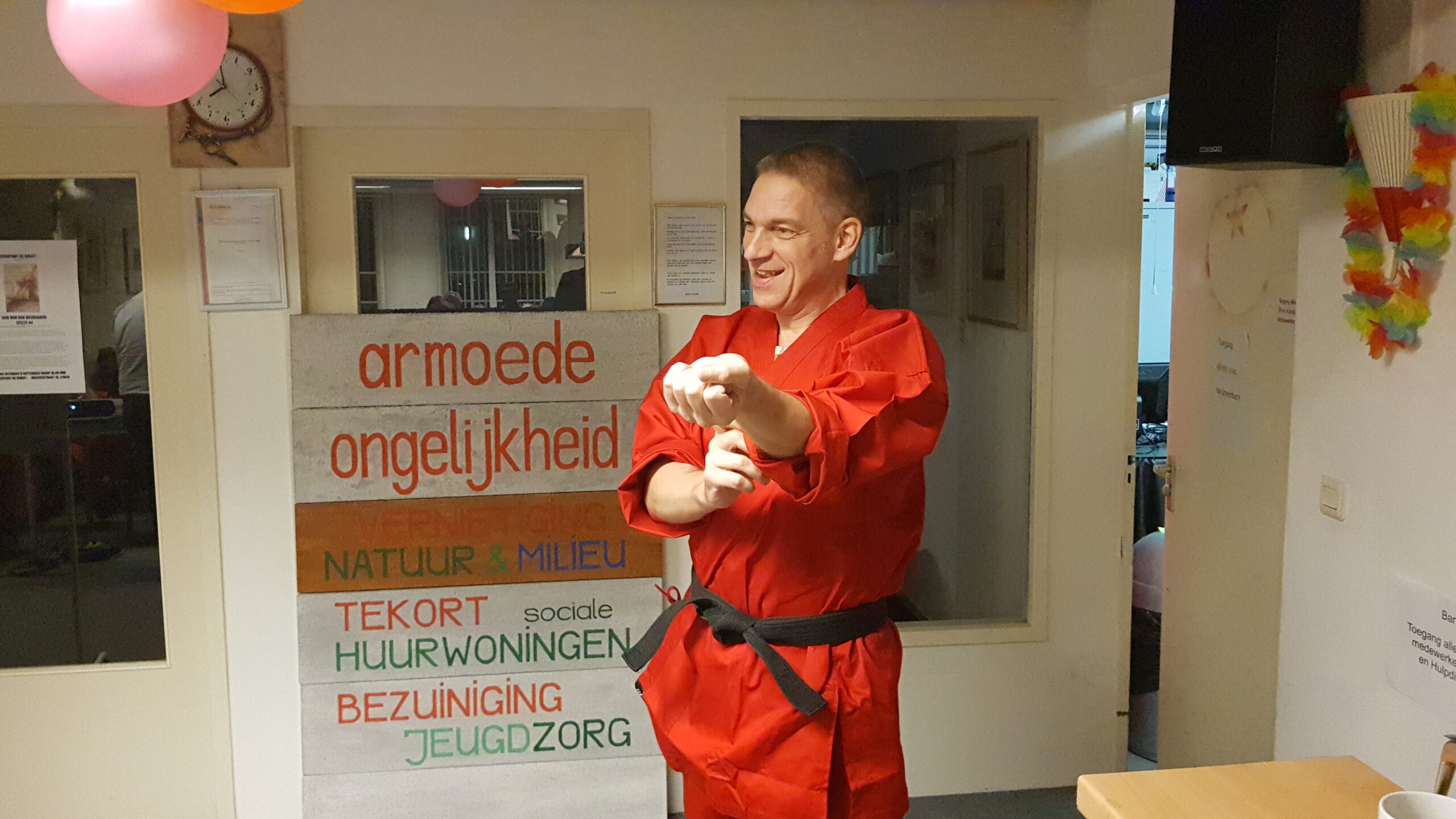 Lijsttrekker Antoine Theeuwen van de SP Leiden heeft vrijdagavond de verkiezingscampagne van de partij letterlijk afgetrapt door korte metten te maken met de grootste problemen die de SP Leiden wil aanpakken. “We zijn klaar om te strijden voor een socialer Leiden,” aldus Theeuwen die, gestoken in een rood karatepak, een aantal borden doormidden sloeg of trapte waarop die problemen waren benoemd. “Ik ben nu een soort tomateka, maar die zwarte band is echt,” lachte Theeuwen.