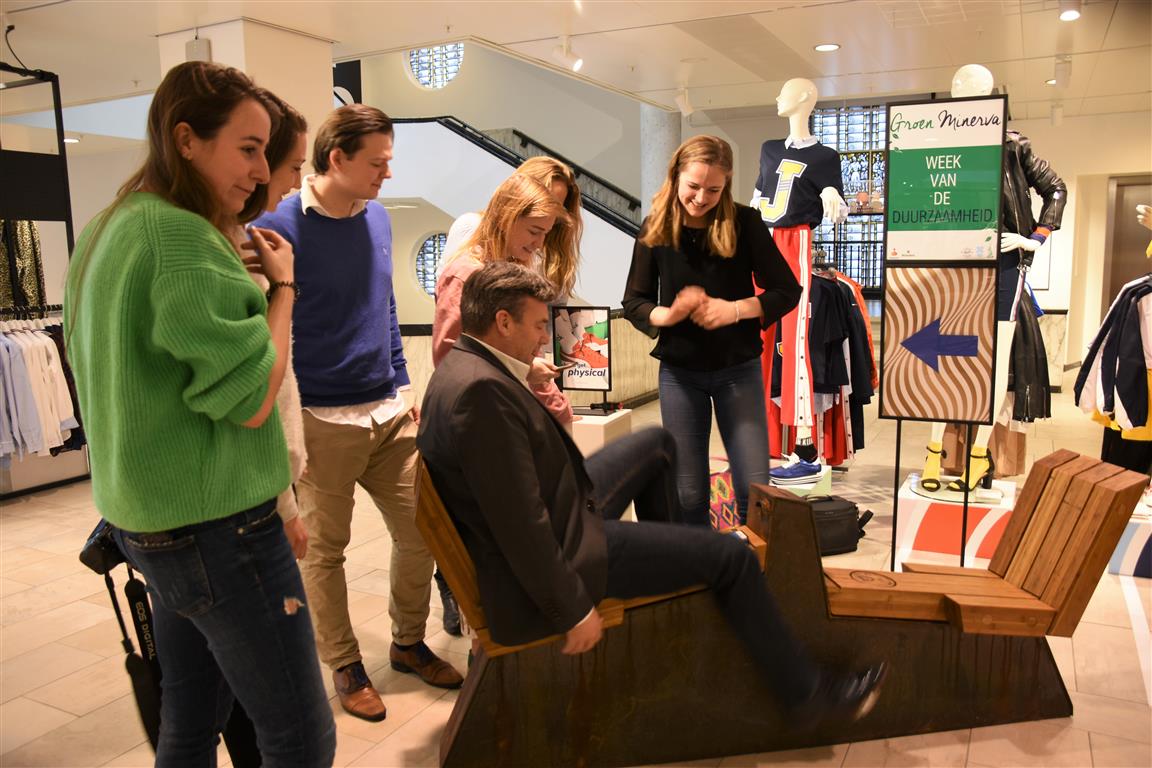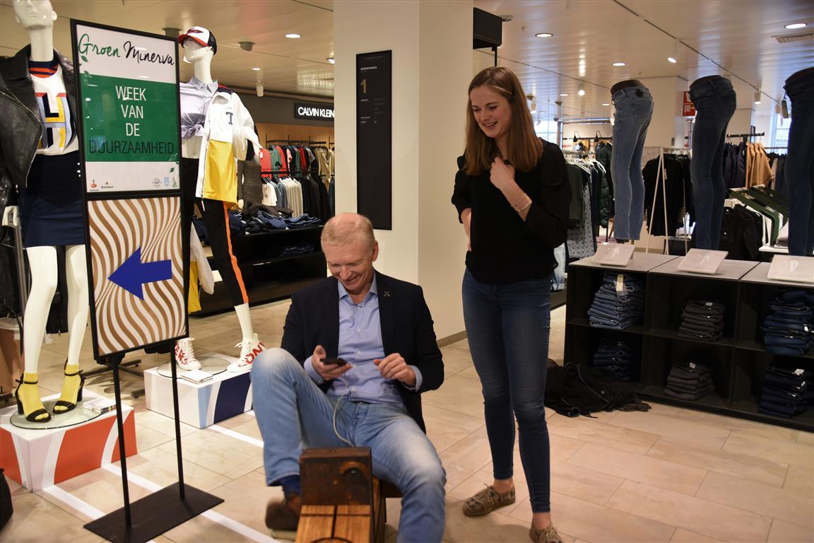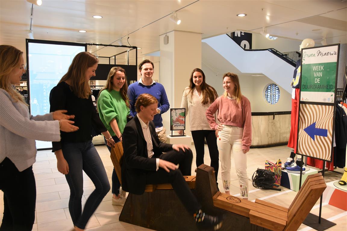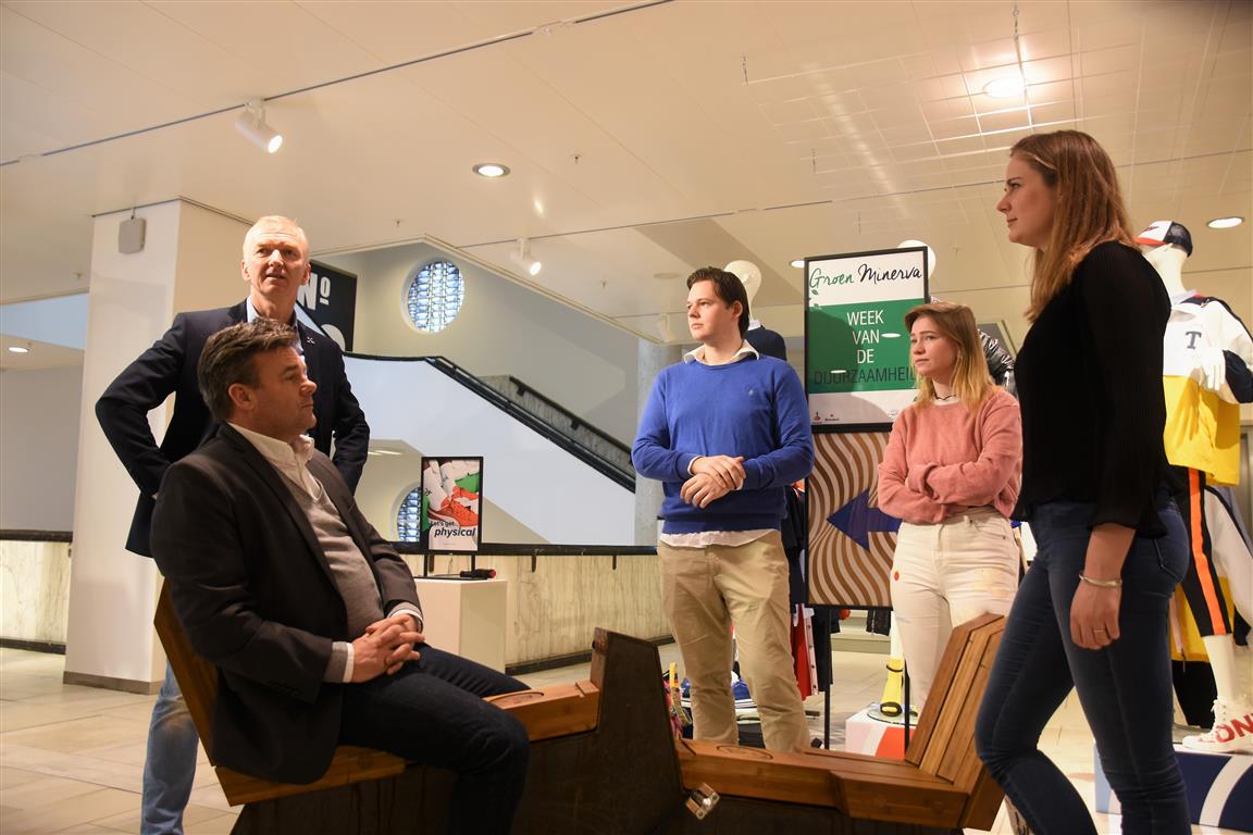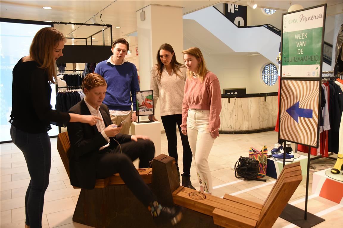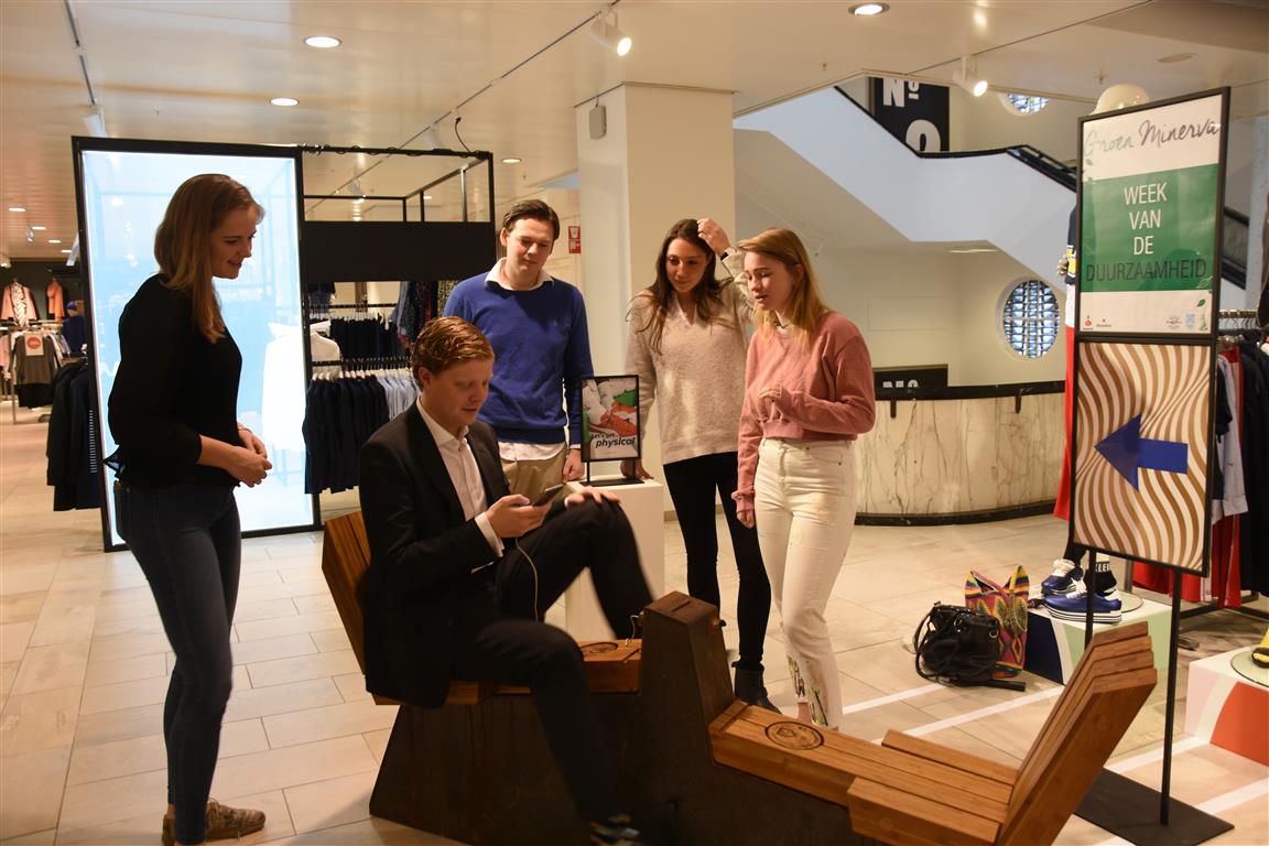 Vorige week stond studentensociëteit Minerva in het teken van duurzaamheid. De werkgroep Groen Minerva had diverse activiteiten georganiseerd om duurzaamheid onder de aandacht te brengen. Tijdens de warme truiendag ging de verwarming een aantal graden lager, er waren vegetarische maaltijden en er werd niet uit plastic maar uit glas gedronken. In de sociëteit stond een energiefiets waarop je al fietsend je mobieltje kon opladen of stroom opwekken om een tosti te maken. Veel leden fietsten op die manier een gratis tosti bij elkaar. De leden van de werkgroep sloten de week af door zaterdagmiddag het winkelend publiek in Hudson’s Bay de mogelijkheid te bieden ook hun mobieltje op te laden op de energiefiets. De D66 wethouders Paul Dirkse en Robert Strijk kwamen ook langs om hun mobiel op te laden en te horen hoe de Week van de Duurzaamheid op Minerva verlopen was. De energiefiets was geleend van station Kerckebosch -Zeist waar hij wachtende passagiers de mogelijkheid biedt sportief bezig te zijn en direct hun mobiel op te laden. Beide wethouders waren enthousiast over de energiefiets en vonden dat hij ook in Leiden niet zou misstaan in de openbare ruimte.