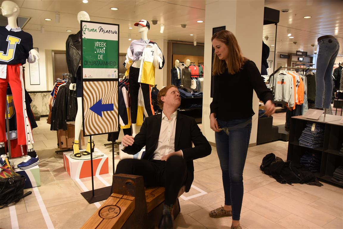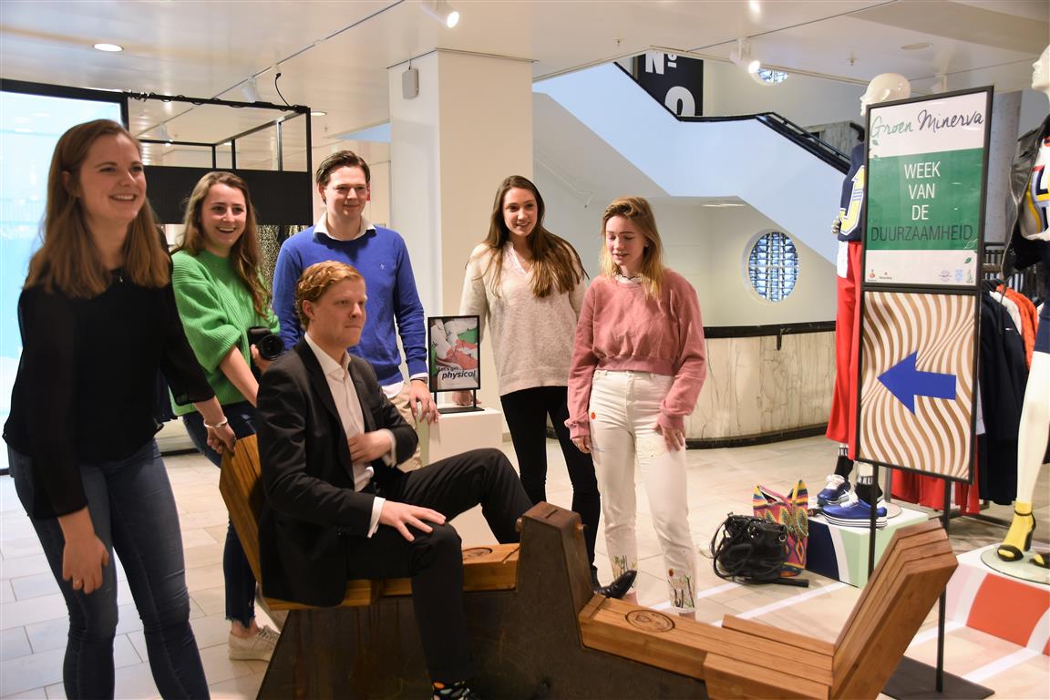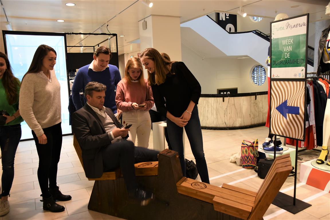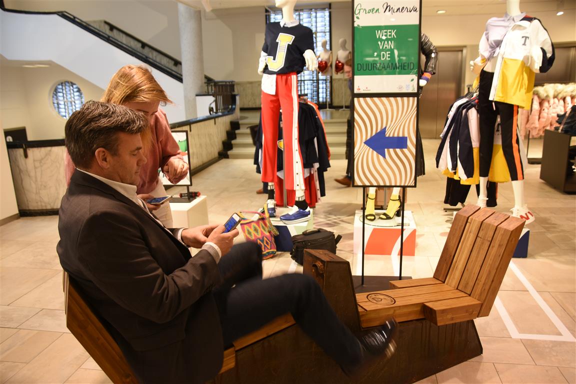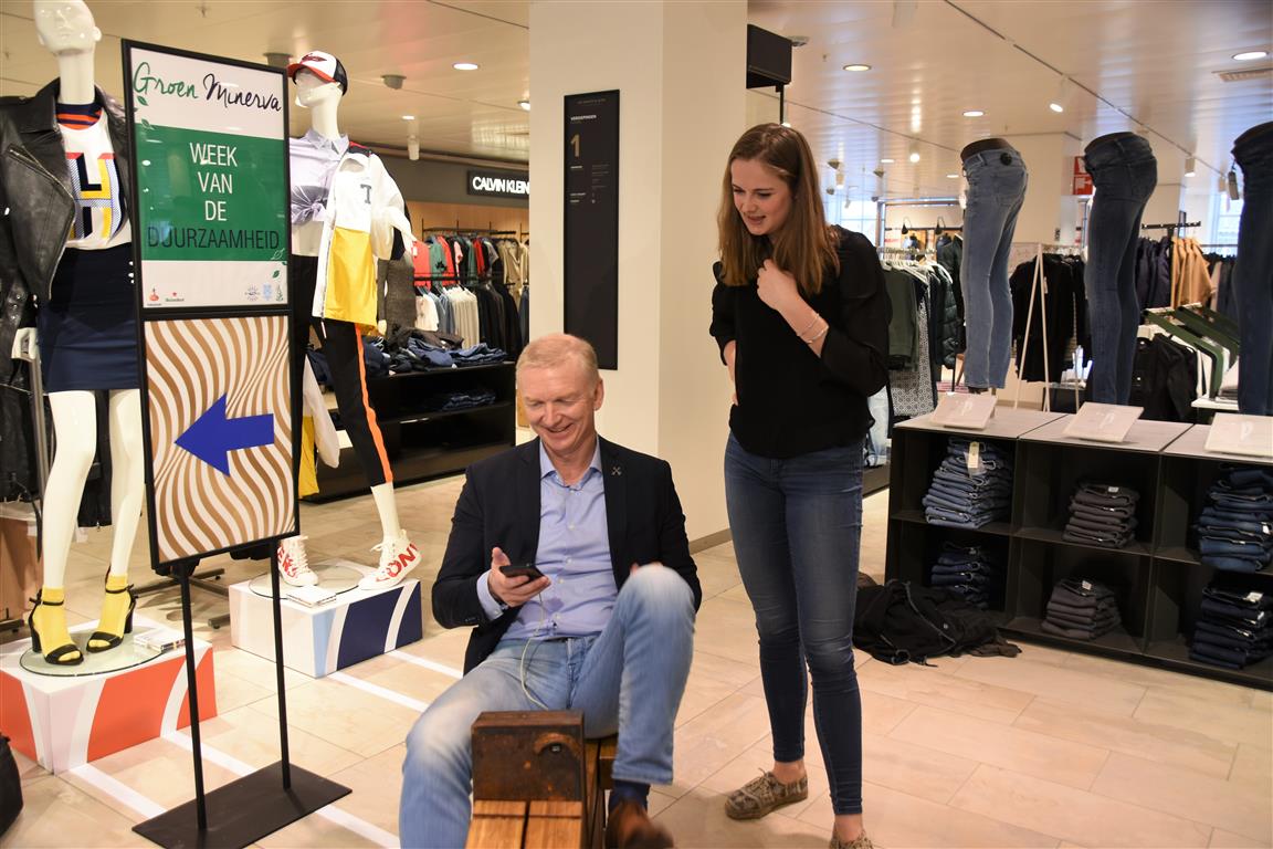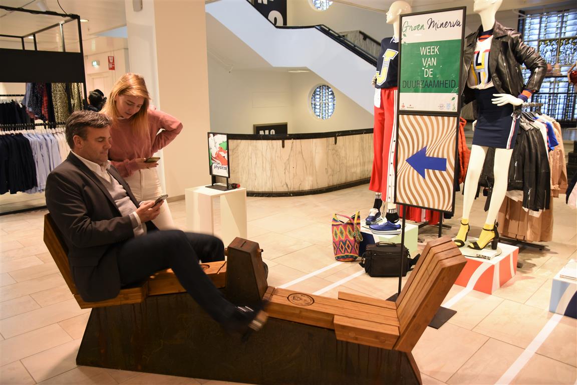 Vorige week stond studentensociëteit Minerva in het teken van duurzaamheid. De werkgroep Groen Minerva had diverse activiteiten georganiseerd om duurzaamheid onder de aandacht te brengen. Tijdens de warme truiendag ging de verwarming een aantal graden lager, er waren vegetarische maaltijden en er werd niet uit plastic maar uit glas gedronken. In de sociëteit stond een energiefiets waarop je al fietsend je mobieltje kon opladen of stroom opwekken om een tosti te maken. Veel leden fietsten op die manier een gratis tosti bij elkaar. De leden van de werkgroep sloten de week af door zaterdagmiddag het winkelend publiek in Hudson’s Bay de mogelijkheid te bieden ook hun mobieltje op te laden op de energiefiets. De D66 wethouders Paul Dirkse en Robert Strijk kwamen ook langs om hun mobiel op te laden en te horen hoe de Week van de Duurzaamheid op Minerva verlopen was. De energiefiets was geleend van station Kerckebosch -Zeist waar hij wachtende passagiers de mogelijkheid biedt sportief bezig te zijn en direct hun mobiel op te laden. Beide wethouders waren enthousiast over de energiefiets en vonden dat hij ook in Leiden niet zou misstaan in de openbare ruimte.