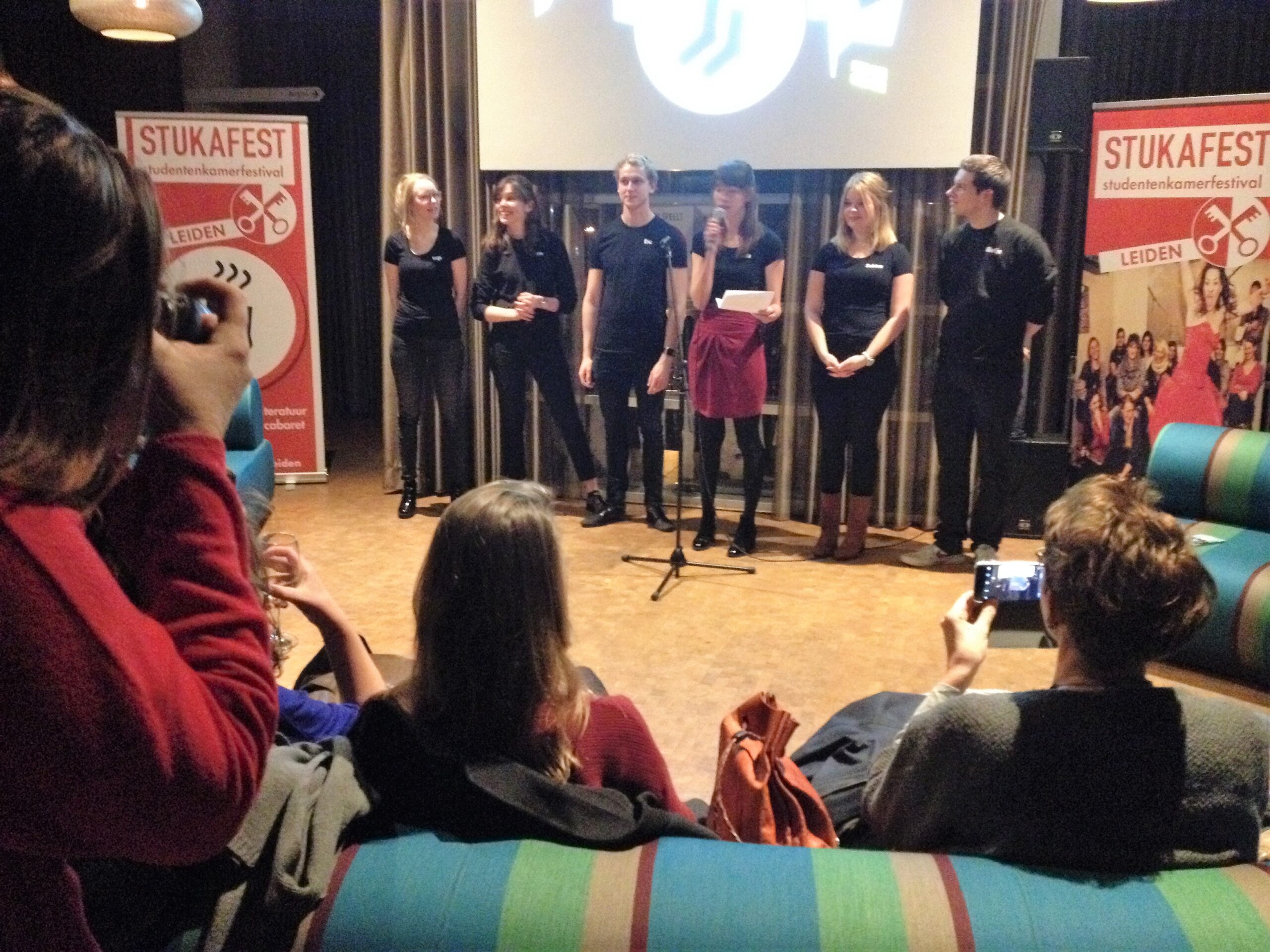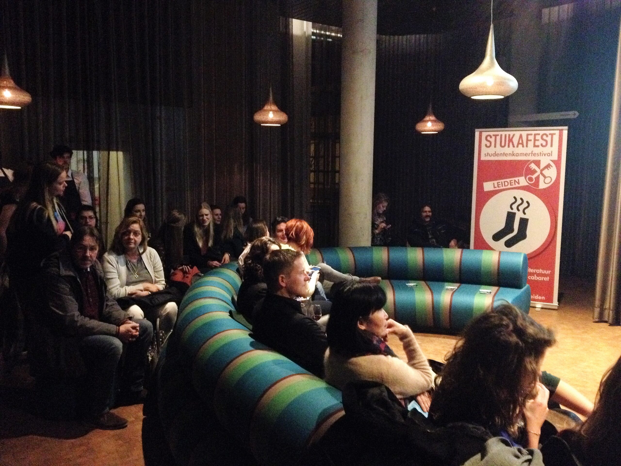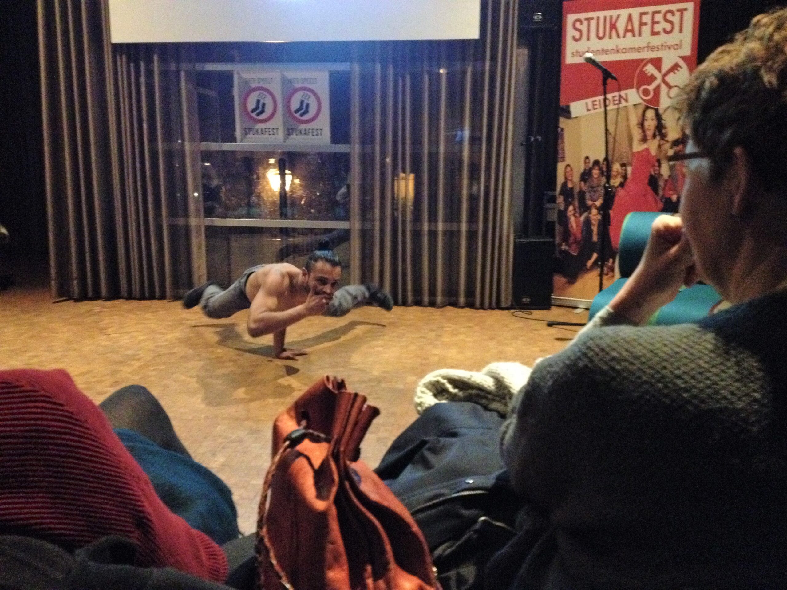 Stukafest biedt niet alleen doorkijkjes en delen van voorstellingen, maar ook een beeld van de bonte verzameling studentenkamers die Leiden rijk is. Dat je gemiddeld zo’n vijfentwintig bezoekers in zo’n kamer kwijt kan, is al een wonder op zich. Goed, er wordt dan ook gezeten op alles waarop je maar kunt zitten en het wordt soms best warm na dat half uur. En op een of andere manier is het gros van die kamers te bereiken via smalle, steile trappen. Rommelig, OK, maar Spartaans niet echt: een espresso-apparaat tref je er net zo goed aan als de inmiddels noodzakelijke magnetron.
