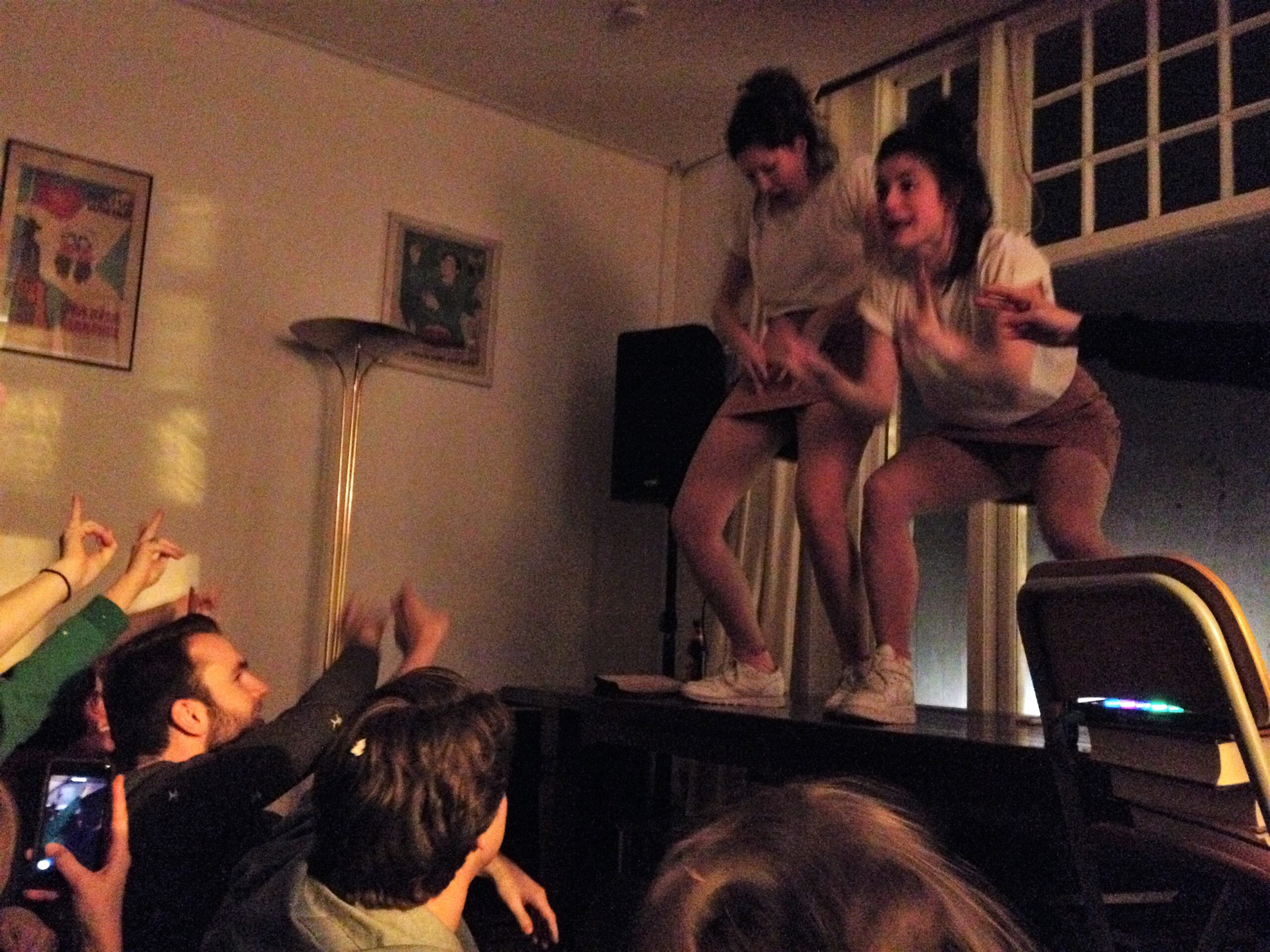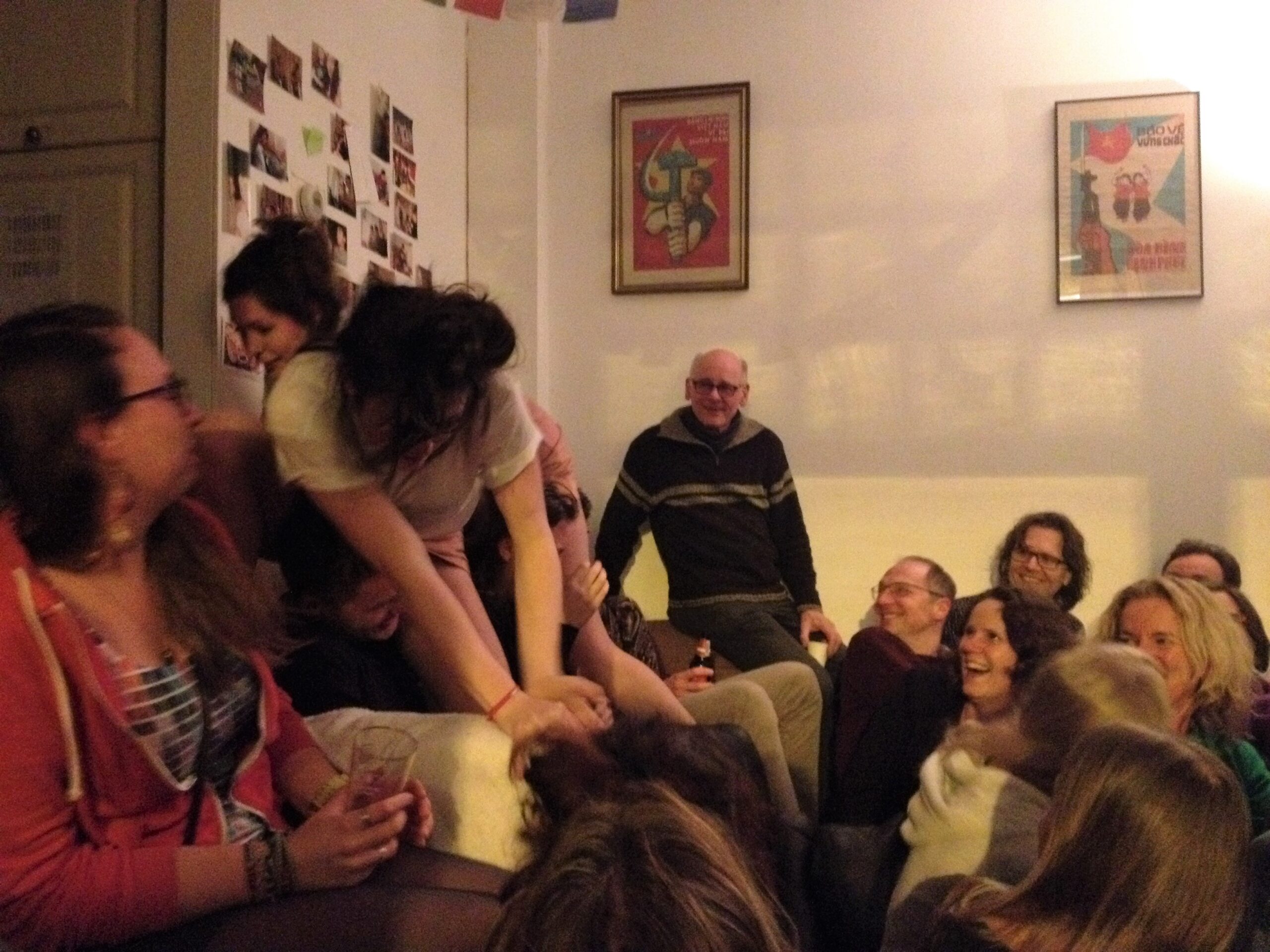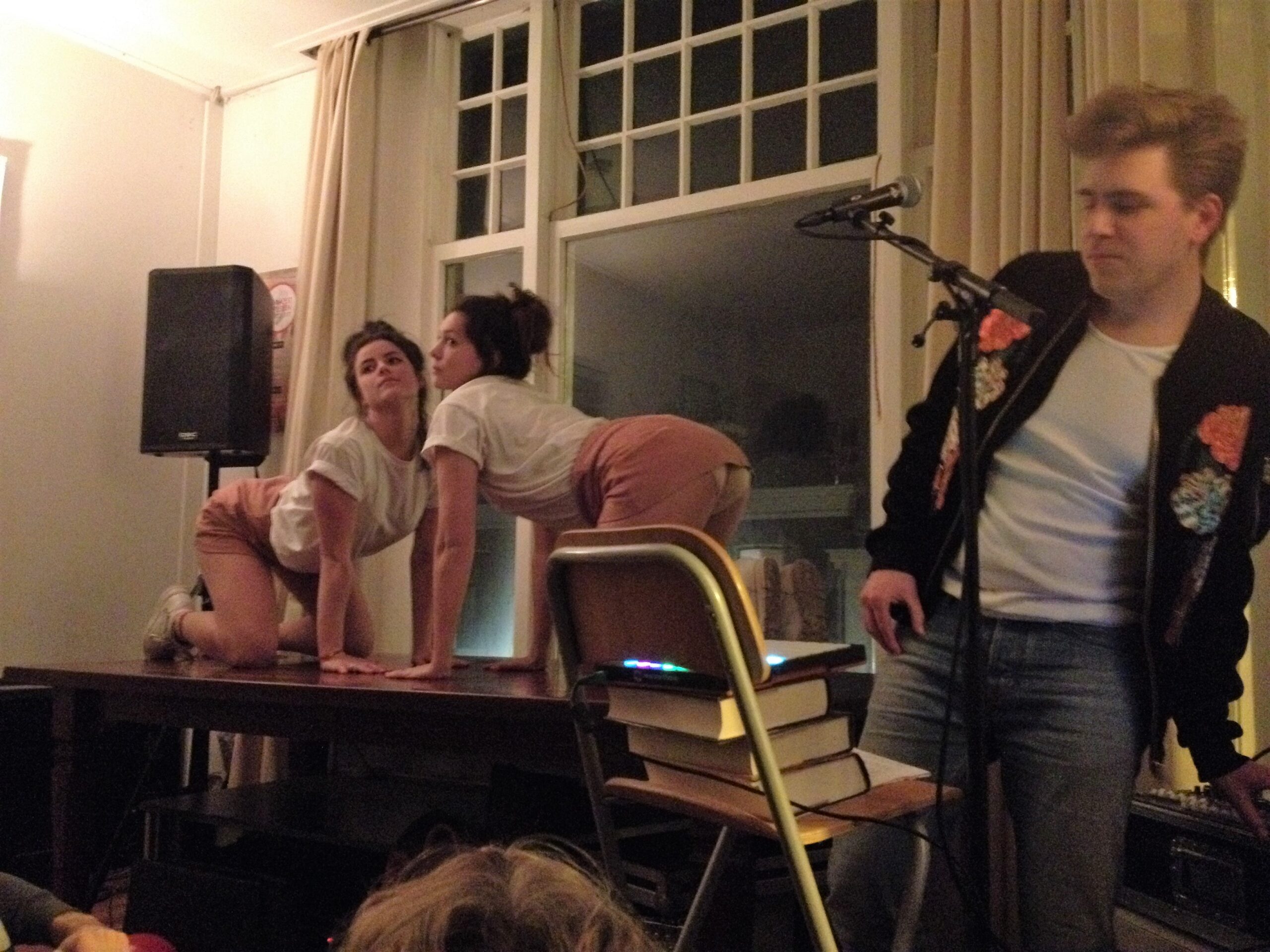 De koude avond is ineens handig als tegenhanger voor een studentenkamer vol mensen. Zeker bij Luke aan de Zoeterwoudsesingel is het effect van veel mensen te merken: beslagen ruiten, die vanaf de straat het beeld scheppen van een gezellig feest. Daar heeft de voorstelling van het duo-trio Steinmann&vanderPas – muzikant Woody mogen we niet vergeten – wel iets van weg, terwijl tegelijk ongemakkelijkheden aan de orde worden gesteld. Zij zijn ook de enigen die óp een ietwat gammele eettafel voor een raam optreden. Een voorstelling over de vagina – of is het de vulva? – kan toch haast niets meer toevoegen na bijvoorbeeld de Vaginamonologen? Wel. Want de dames brengen alledaagse ongemakkelijkheid op het netvlies. De eerste menstruatie en de oma die daaropvolgend uitgebreid vertelt over háár seksleven (ooit). Iets wat je nu net níet wilde horen. Het moet gezegd: de mededeling dat vagina zwaardhouder betekende (gevolgd door de onthutsing bij de dames), ontlokt Woody een prijswaardig lachje. Toch eindigt de voorstelling met een meezingende en -klappende kamer die “een toast uitbrengt op de vagina. V for vagina”.
