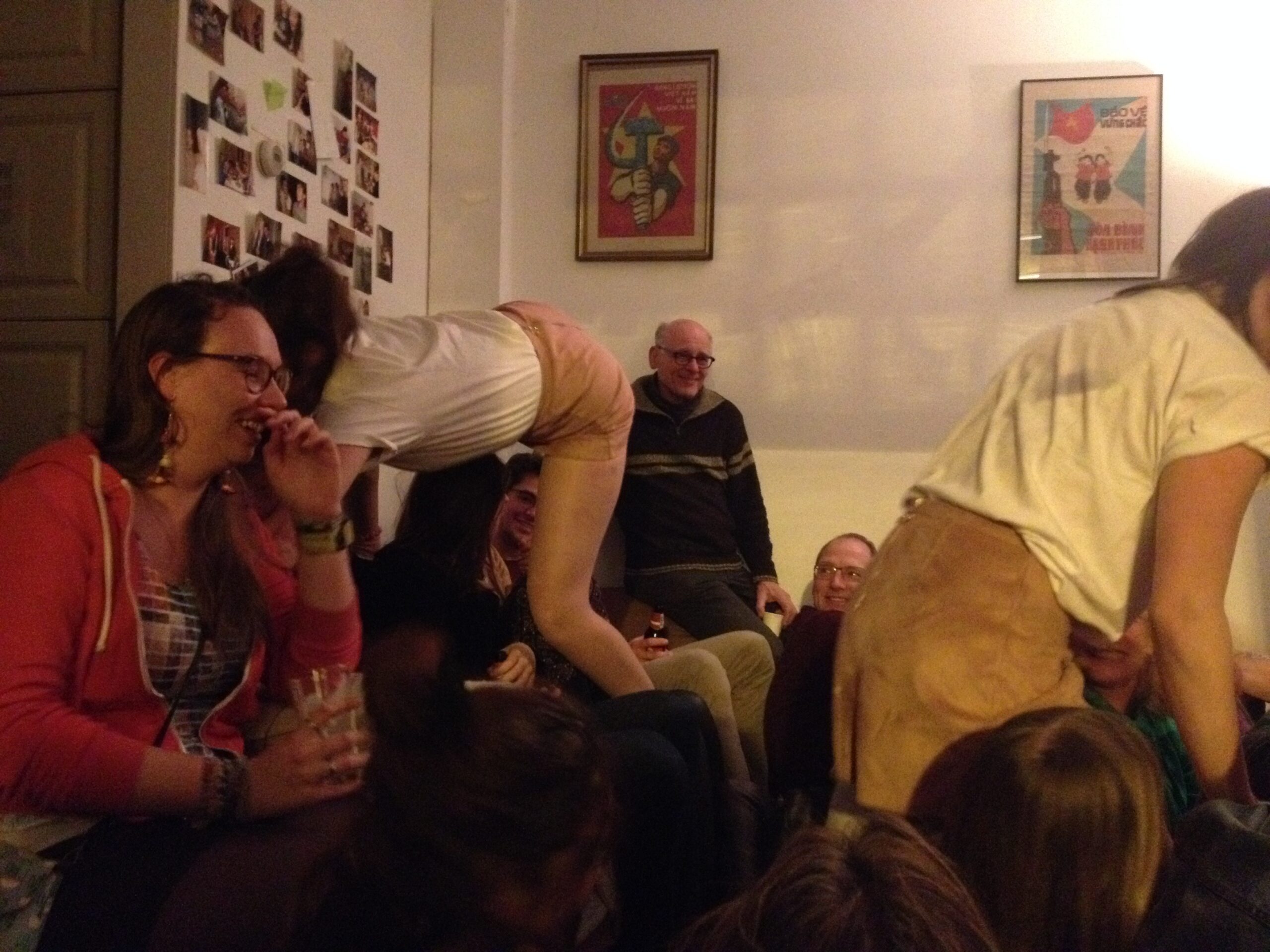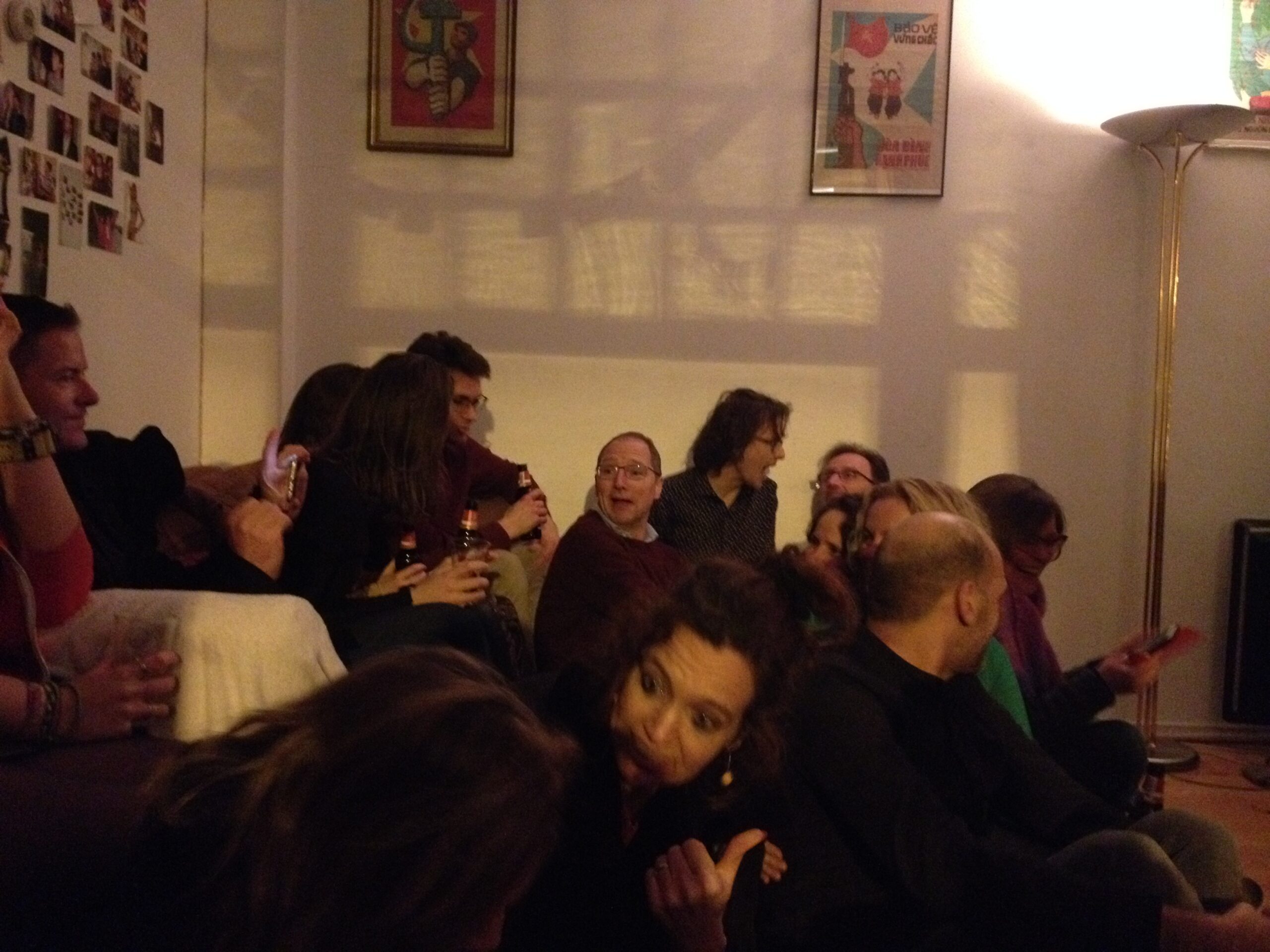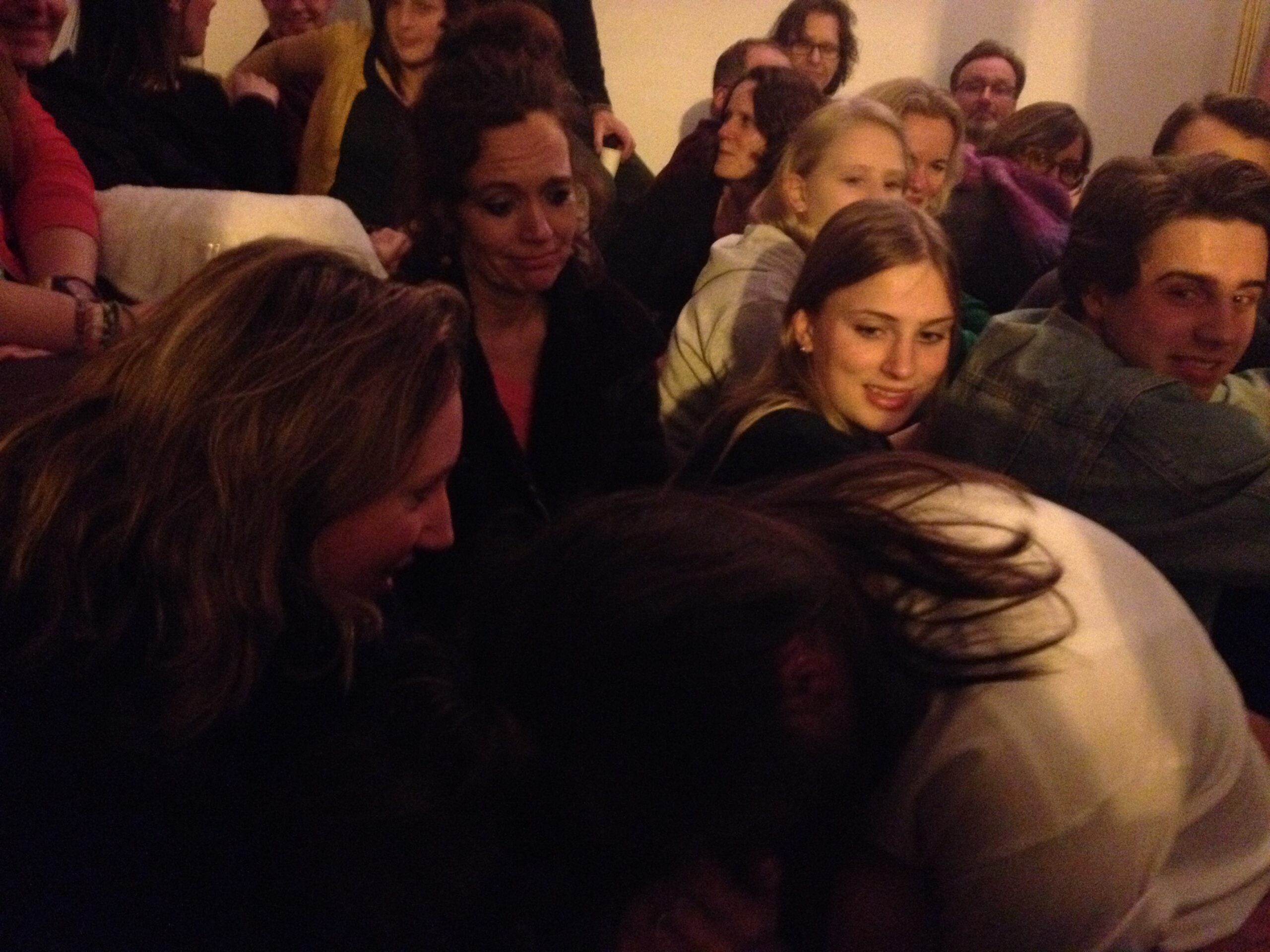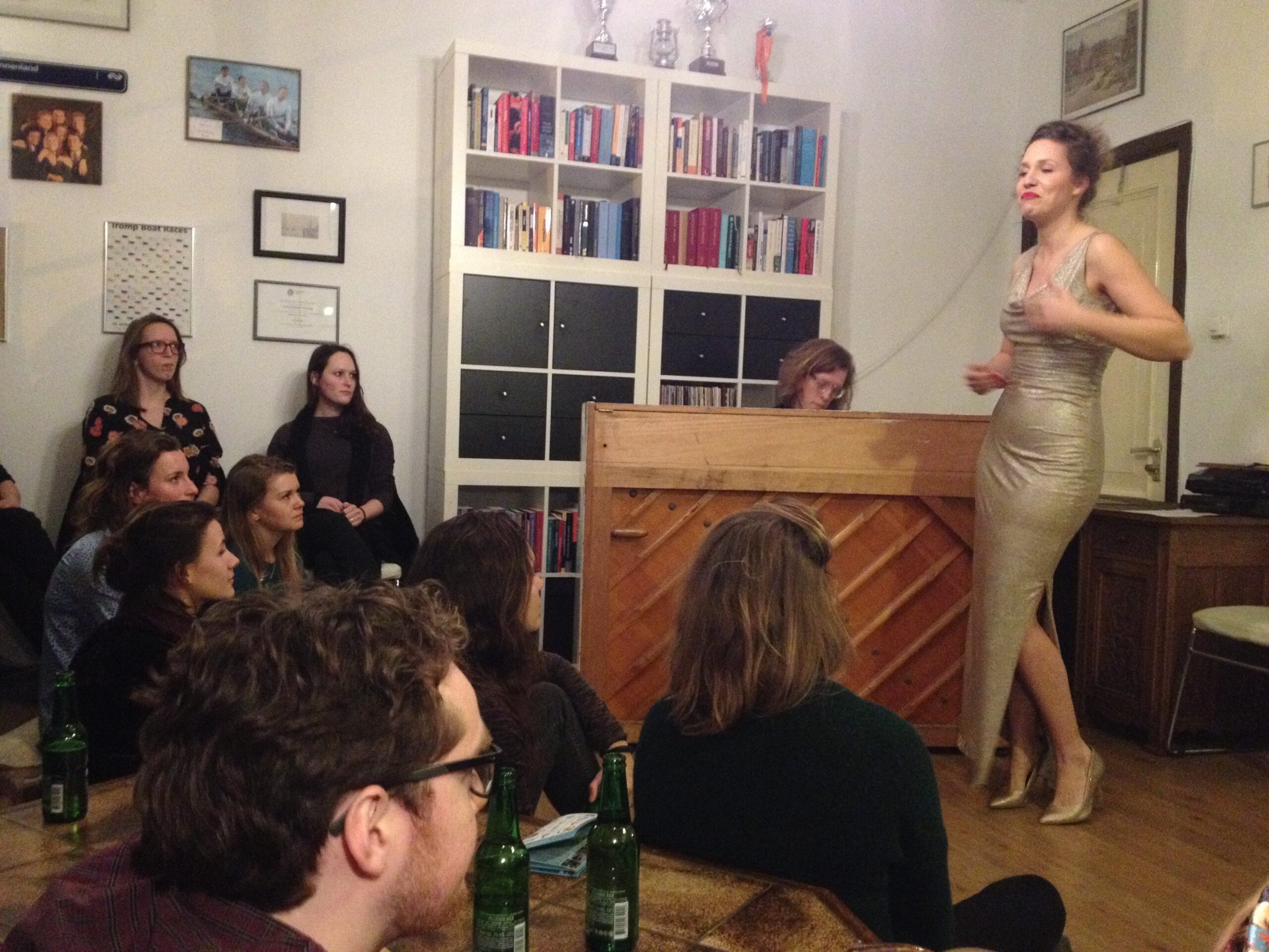 De koude avond is ineens handig als tegenhanger voor een studentenkamer vol mensen. Zeker bij Luke aan de Zoeterwoudsesingel is het effect van veel mensen te merken: beslagen ruiten, die vanaf de straat het beeld scheppen van een gezellig feest. Daar heeft de voorstelling van het duo-trio Steinmann&vanderPas – muzikant Woody mogen we niet vergeten – wel iets van weg, terwijl tegelijk ongemakkelijkheden aan de orde worden gesteld. Zij zijn ook de enigen die óp een ietwat gammele eettafel voor een raam optreden. Een voorstelling over de vagina – of is het de vulva? – kan toch haast niets meer toevoegen na bijvoorbeeld de Vaginamonologen? Wel. Want de dames brengen alledaagse ongemakkelijkheid op het netvlies. De eerste menstruatie en de oma die daaropvolgend uitgebreid vertelt over háár seksleven (ooit). Iets wat je nu net níet wilde horen. Het moet gezegd: de mededeling dat vagina zwaardhouder betekende (gevolgd door de onthutsing bij de dames), ontlokt Woody een prijswaardig lachje. Toch eindigt de voorstelling met een meezingende en -klappende kamer die “een toast uitbrengt op de vagina. V for vagina”.