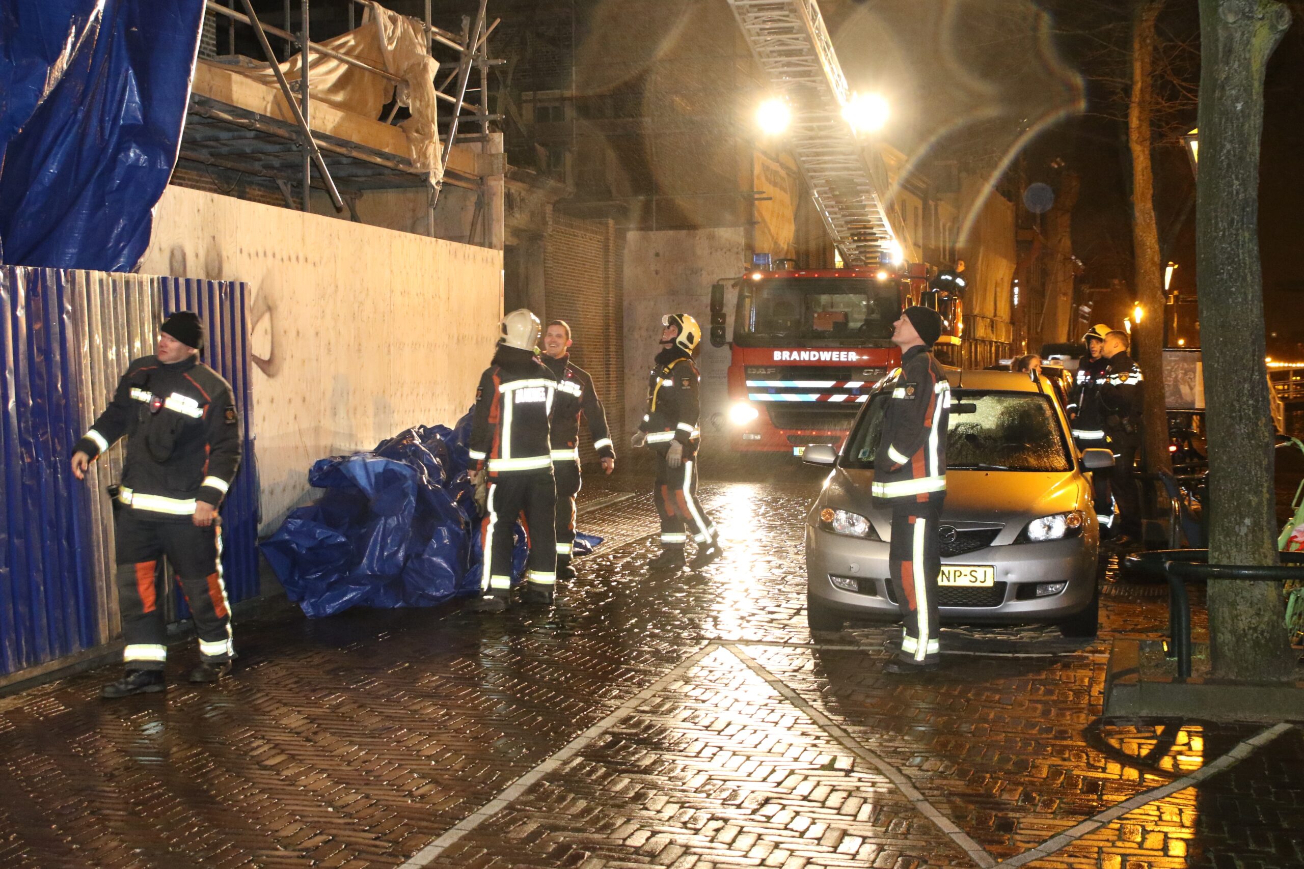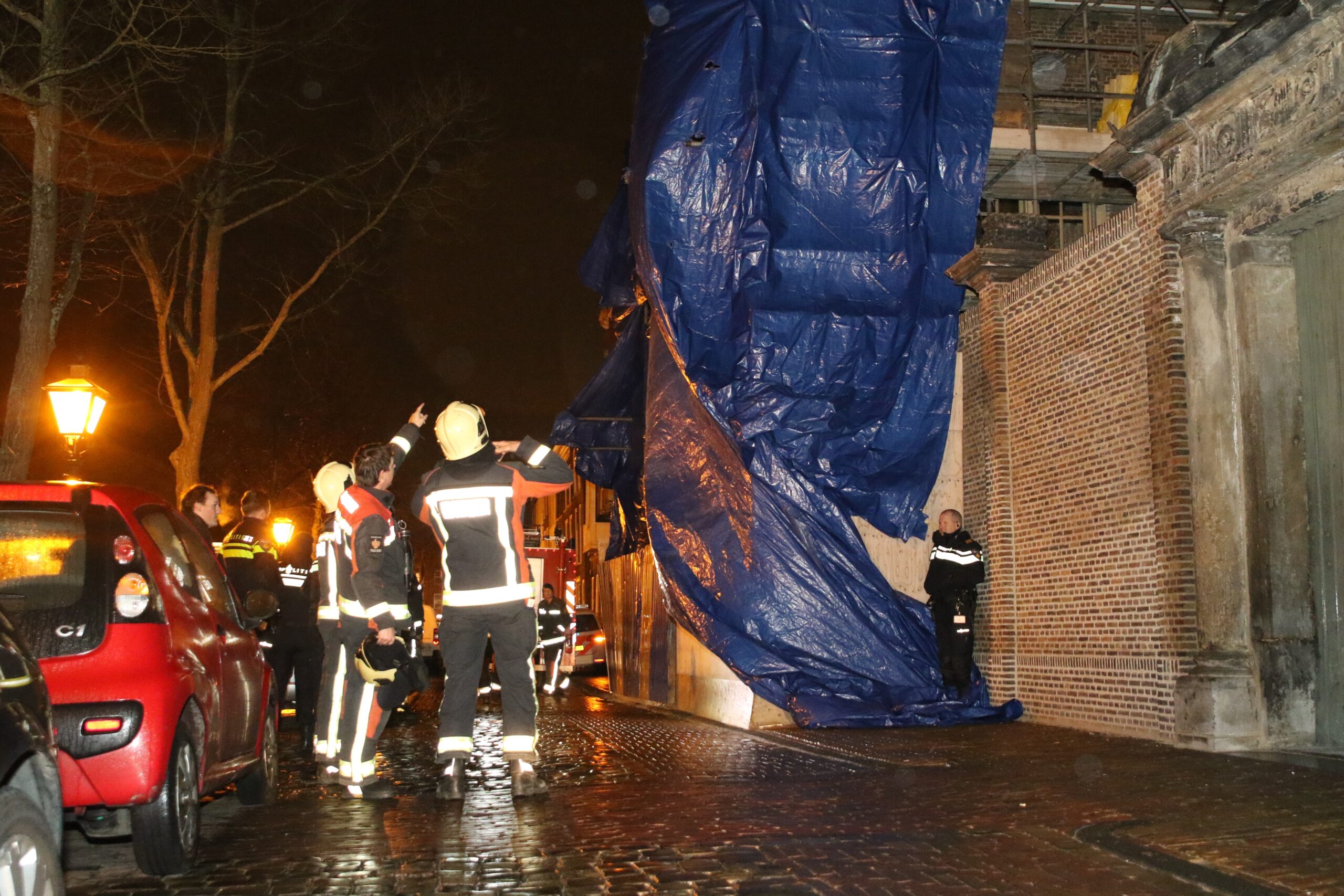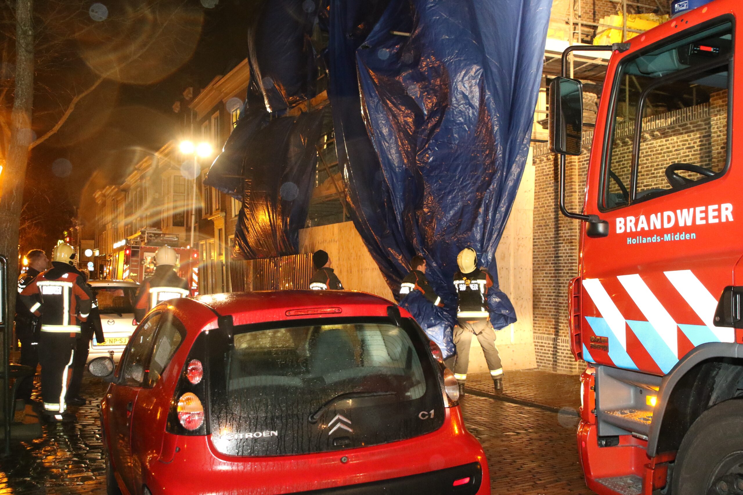 Zaterdagavond raakte rond 21.30 uur op de Oude Singel in Leiden een enorm afdekzeil los liet van de bouwsteigers waar het aan vast zat. Het zeil wapperde door de harde wind dwars over de weg, waardoor een gevaarlijke situatie ontstond voor voorbijgangers.