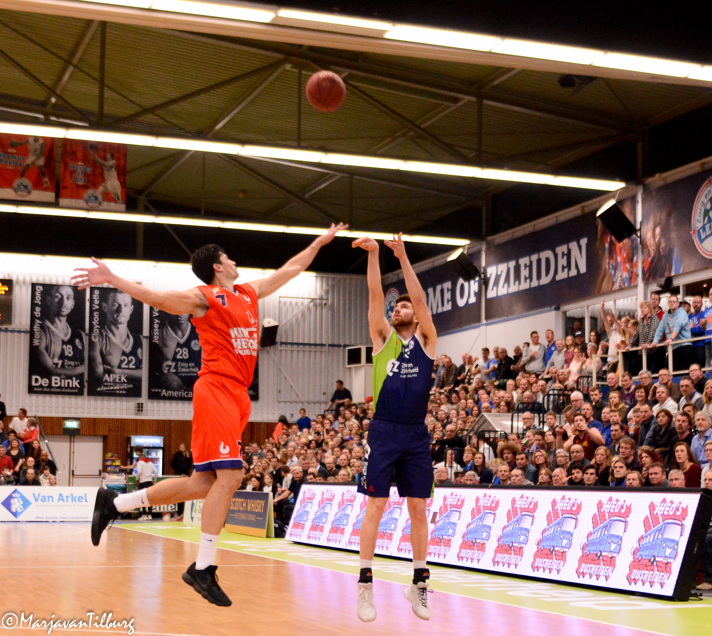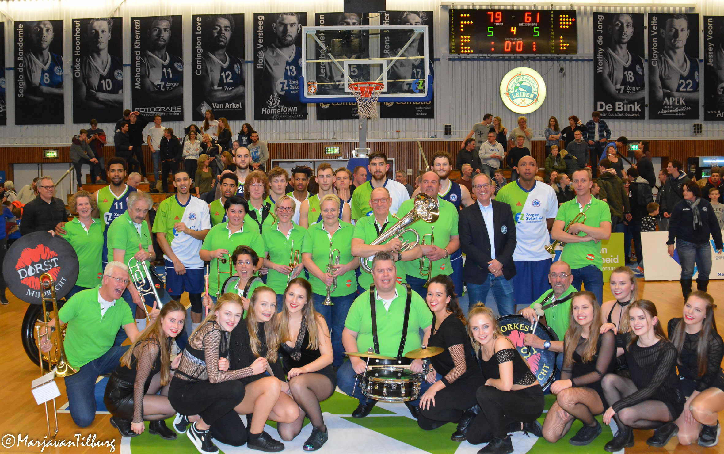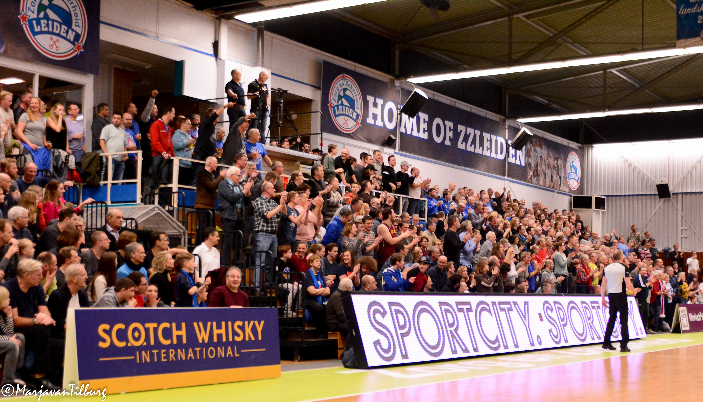 Wedstrijden tussen Zorg en Zekerheid Leiden en New Heroes Den Bosch behoren tot de snoepjes van het basketbalseizoen. Ook deze editie trok weer vele belangstellenden naar de Vijf Meihal. Zodanig dat het platform ook door menig supporter werd gevuld. Het was al snel aangenaam warm in de hal en de muziek van het hoempaorkest zorgde voor de nodige sfeer. Een Bossche supporter sprak glimlachend over een takkeherrie. Als er raadsleden van de gemeente Leiden aanwezig waren geweest, dan zouden ze misschien anders denken over de nieuwe sporthal en het aantal zitplaatsen.