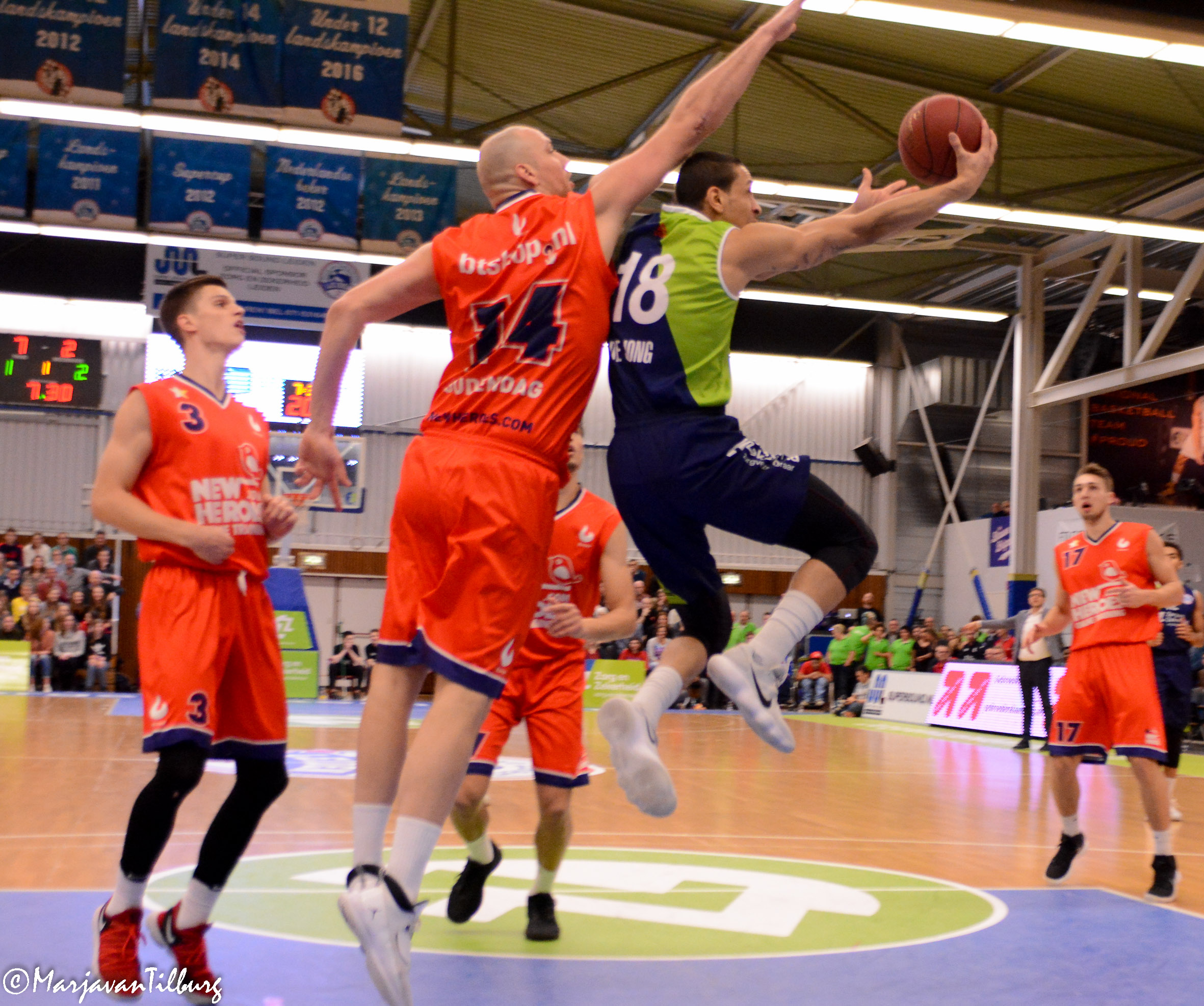 Zorg en Zekerheid Leiden wil in het derde kwart nog wel eens verslappen, maar daar was vandaag geen sprake van. New Heroes, dat in Norville Carey een uitblinker had (21 punten en 12 rebounds), kwam na twee minuten terug tot vijf punten (46-41), maar daarna stelde de Leidse ploeg snel orde op zaken. De Jong scoorde via een jumper, waarna Voorn een steal op Sherrill verzilverde voor 50-41. Na opnieuw balverlies van New Heroes knalde Floris Versteeg een driepunter door de ring. Nadat Voorn een persoonlijke fout tegen Maarten Bouwknecht had gemaakt, had Mike Miklusak commentaar op de arbitrage. Het kwam de Amerikaan op een technische fout te staan en dat was meteen zijn vijfde fout. Voorn benutte de vrije worp en na de balinname aan de zijlijn tekende Love voor 56-41. Vlak daarna dunkte Olah na een prima pass van Kherrazi voor 58-43. Nu is New Heroes, dat elf wedstrijden op rij gewonnen had, niet zo maar verslagen. Aan het eind van het derde kwart stond het 62-53 en kon er nog van alles gebeuren.