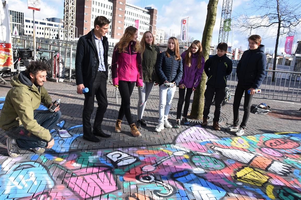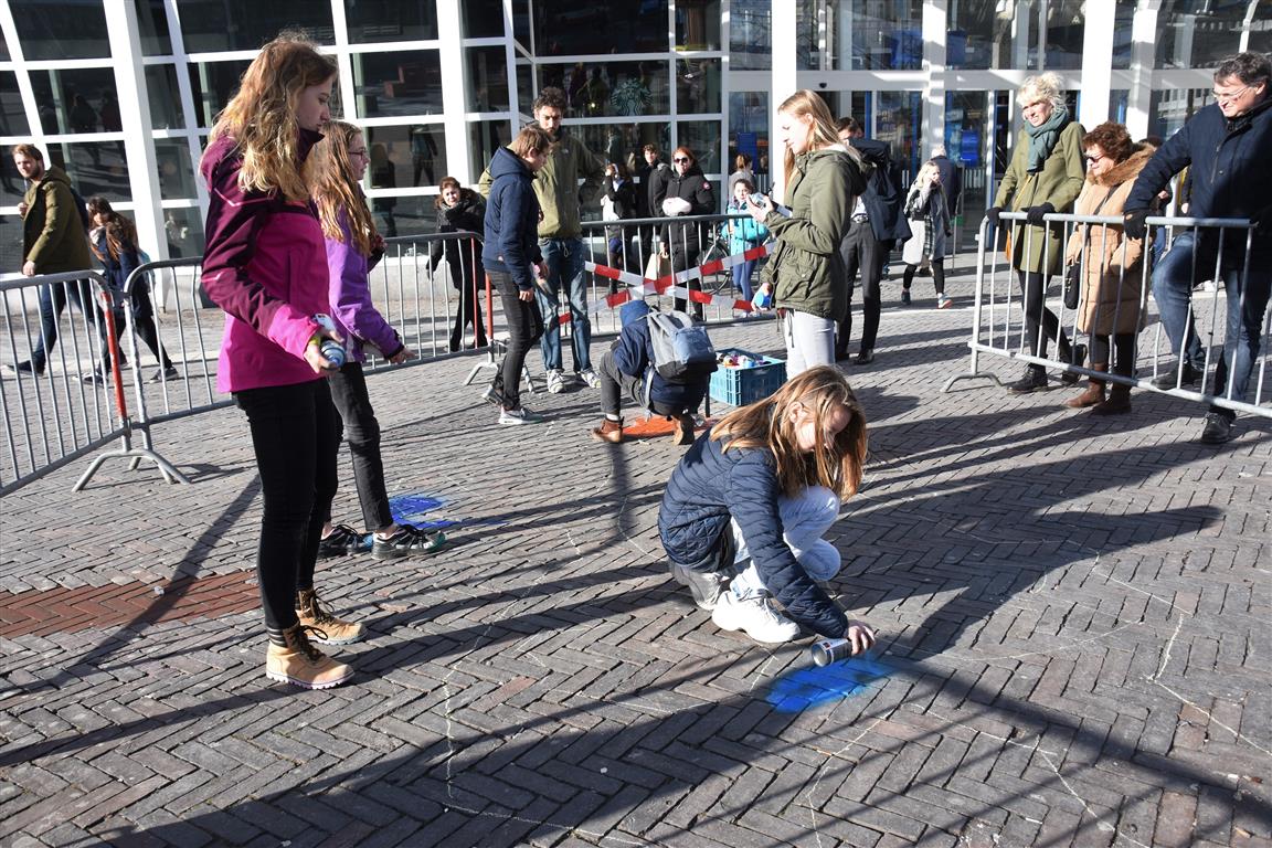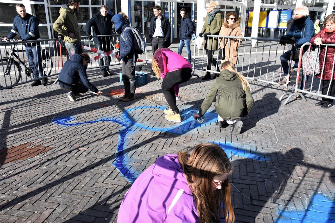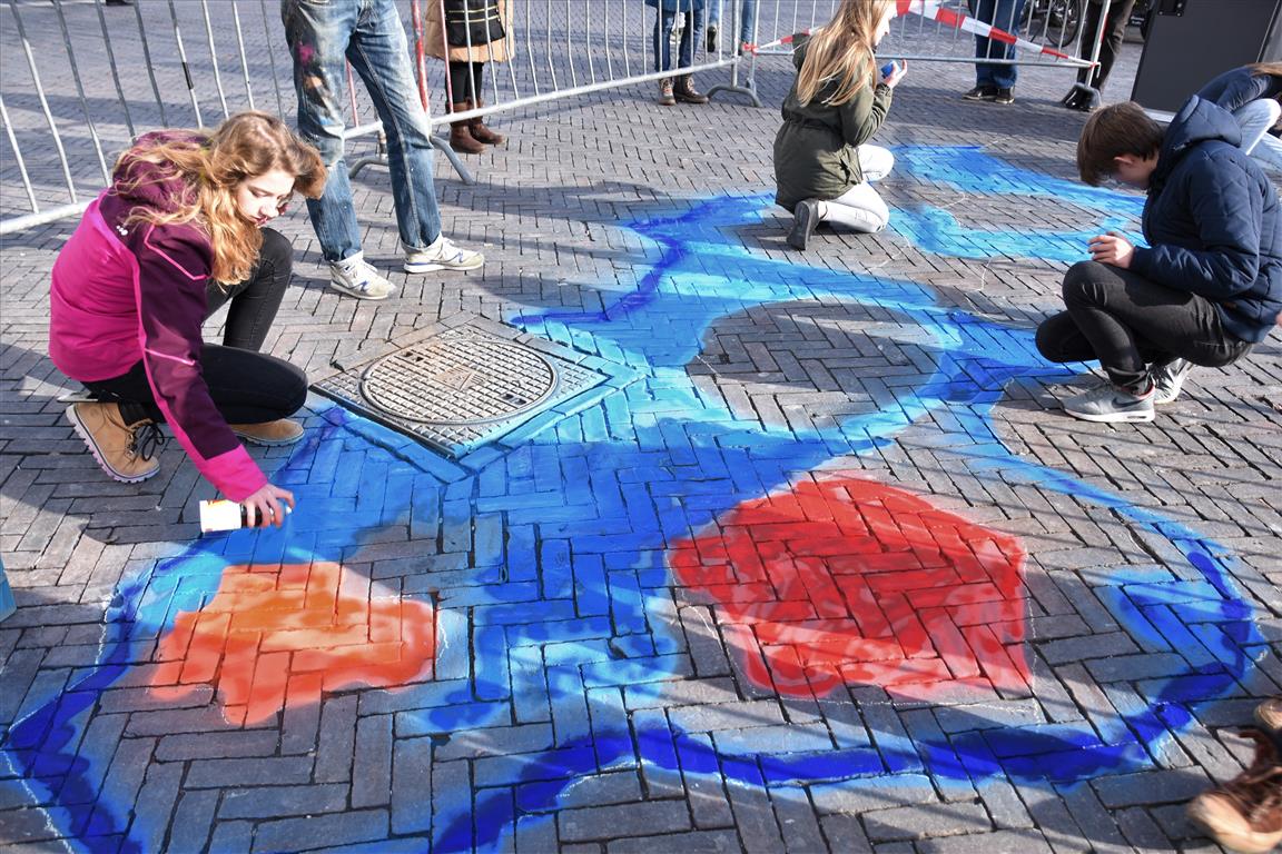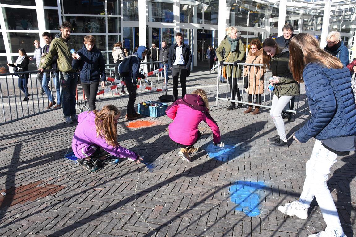 Leerlingen van het Visser ’t Hooft Lyceum hebben vanmiddag straattekeningen gemaakt op het Stationsplein in Leiden. Daarmee willen ze bijdragen aan het oplossen van het zwerfafvalprobleem in de stad. Wethouder Paul Laudy (Openbare Ruimte) kwam ook langs om de laatste hand aan de tekening te leggen.