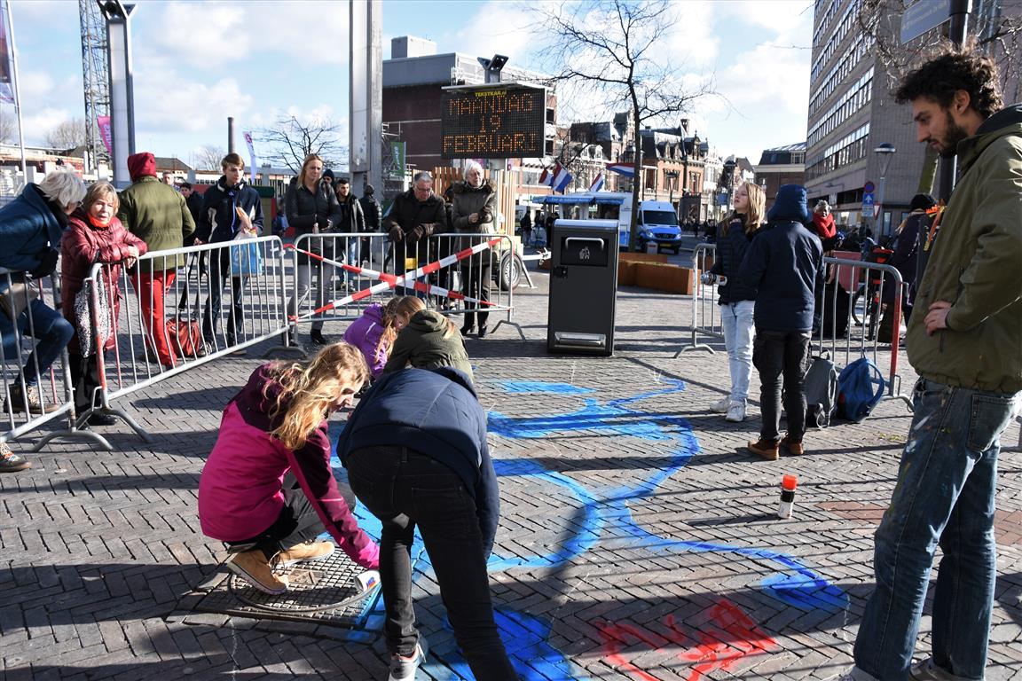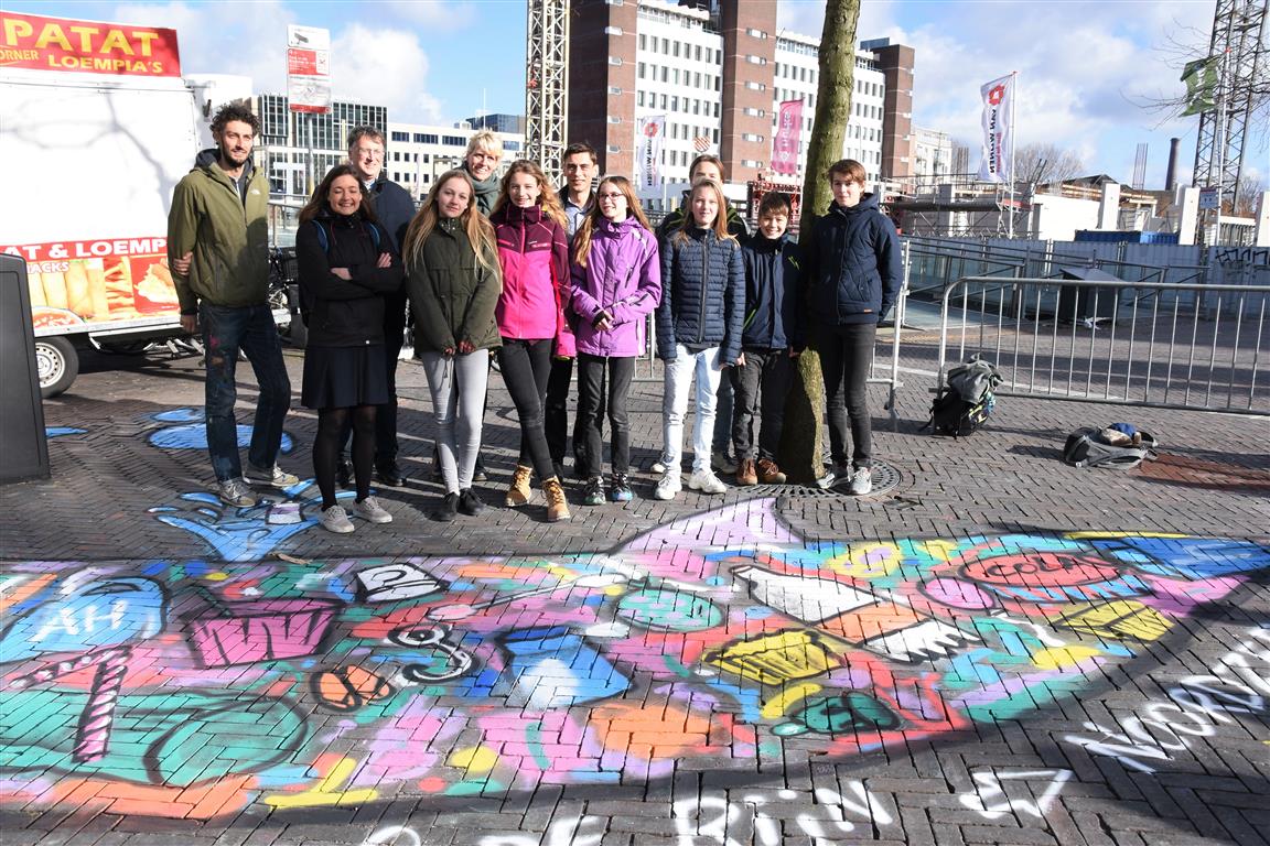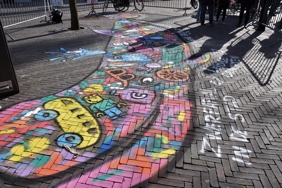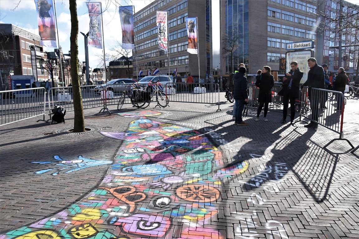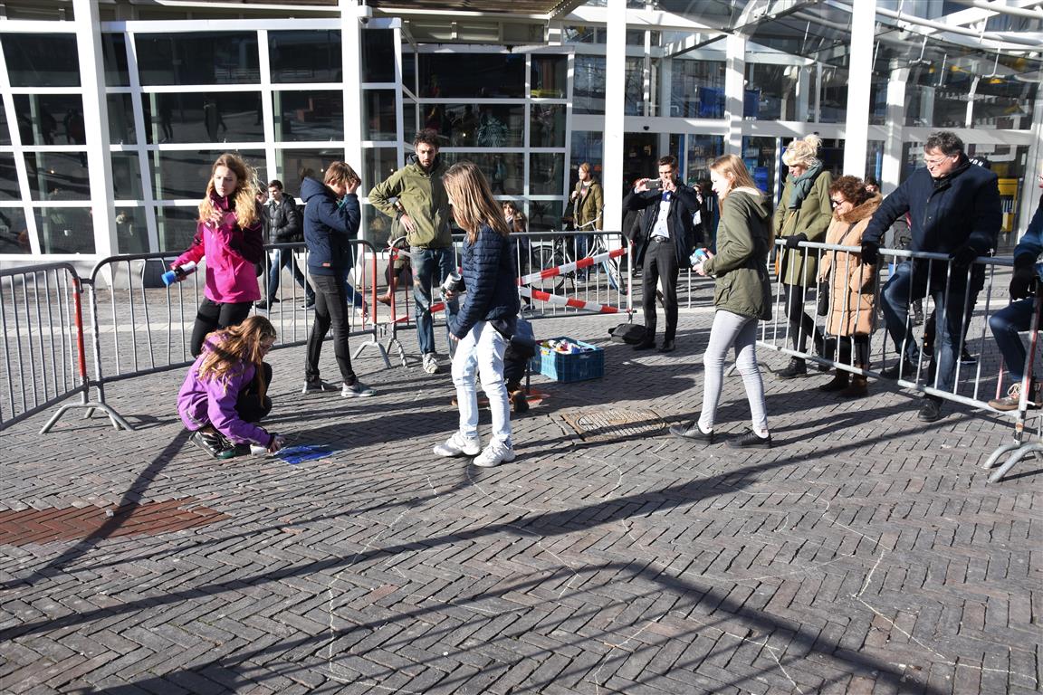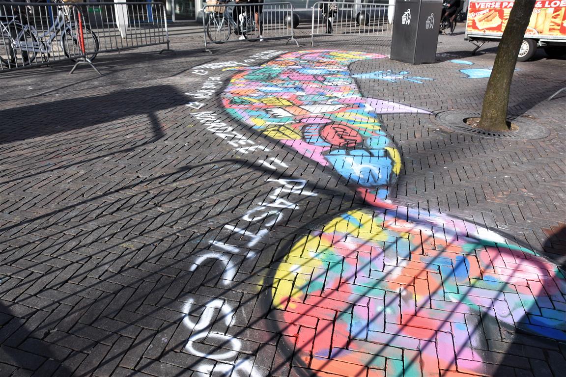 Leerlingen van het Visser ’t Hooft Lyceum hebben vanmiddag straattekeningen gemaakt op het Stationsplein in Leiden. Daarmee willen ze bijdragen aan het oplossen van het zwerfafvalprobleem in de stad. Wethouder Paul Laudy (Openbare Ruimte) kwam ook langs om de laatste hand aan de tekening te leggen.