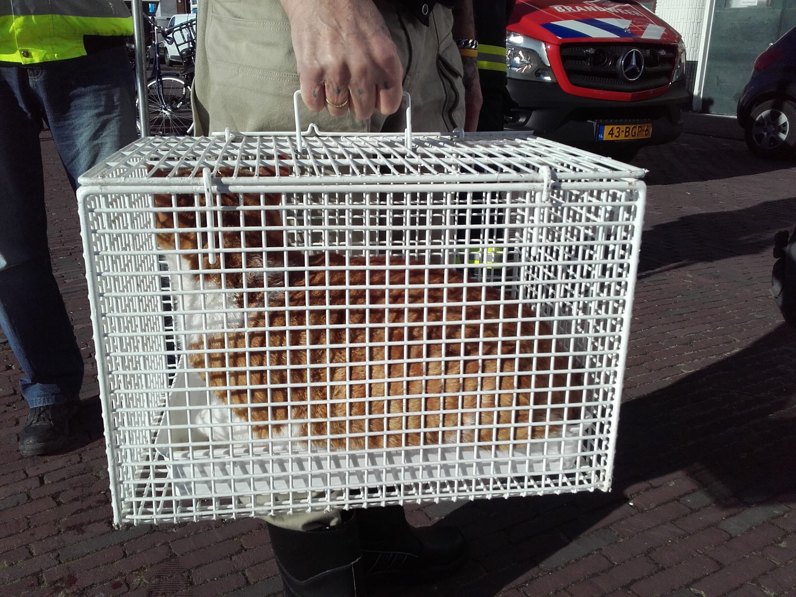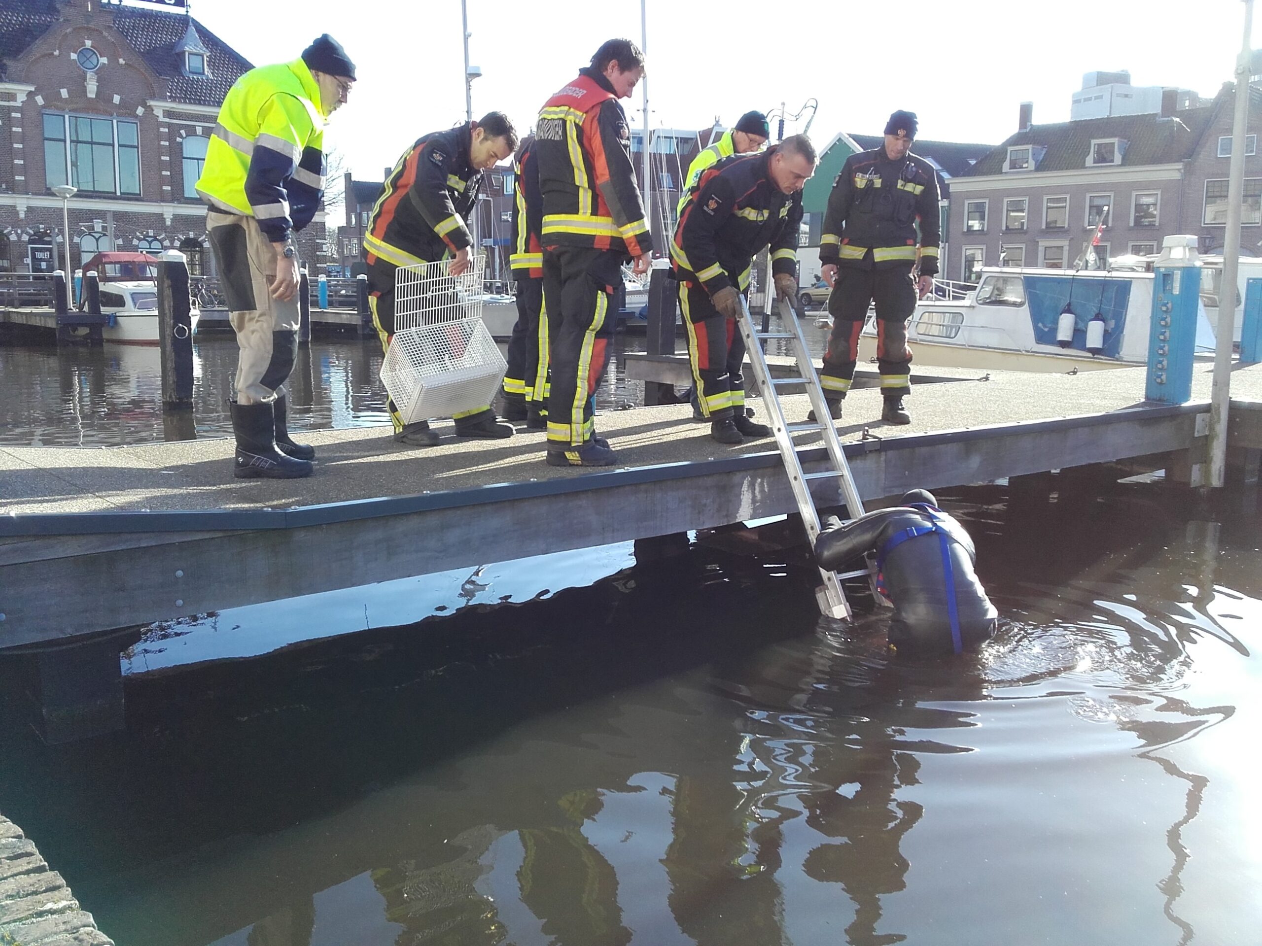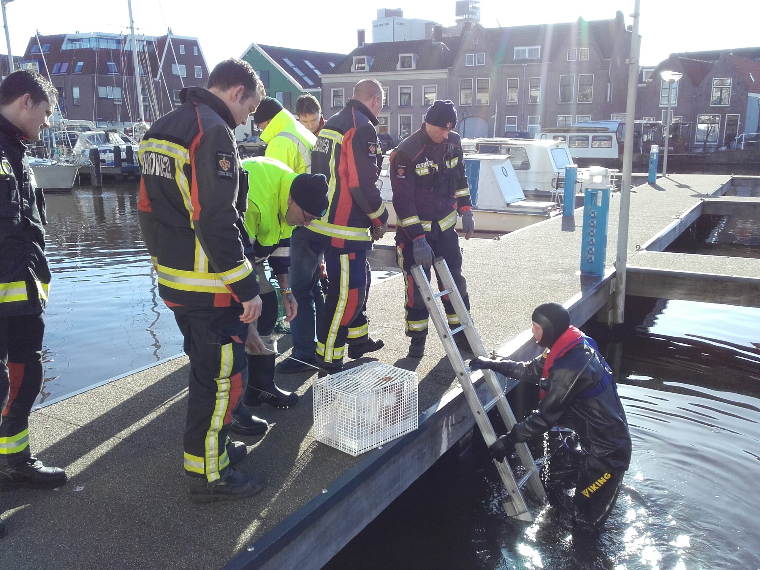 Een duiker van de brandweer heeft het onfortuinlijke huisdier onder de steiger vandaan gehaald. Dierenambulance heeft zich vervolgens over het beestje ontfermd. Volgens omstanders gaat het om een kat uit de buurt.
