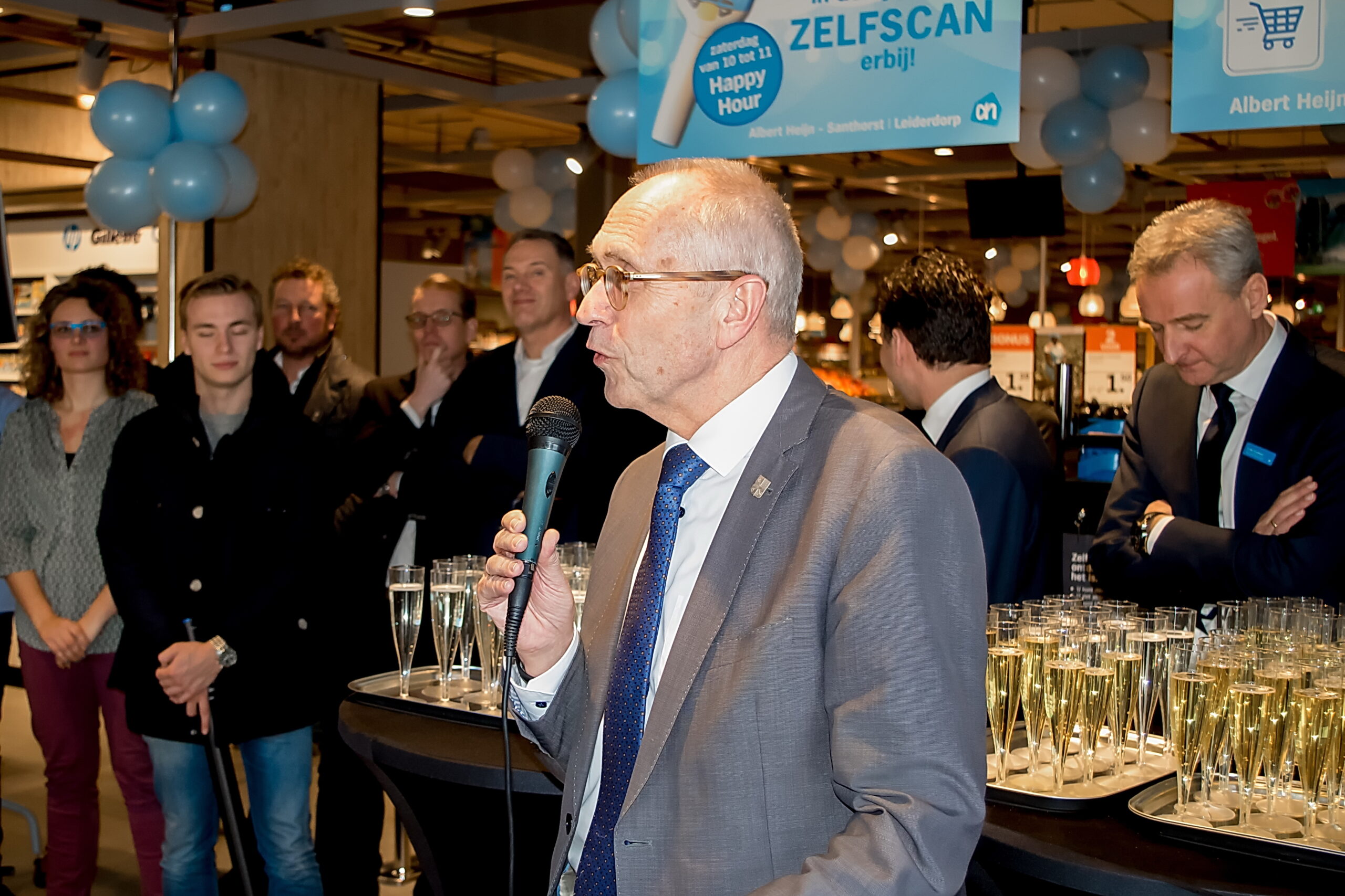 De geheel vernieuwde Albert Heijn in Santhorst Leiderdorp is gistermiddag geopend door wethouder Kees Wassenaar. De supermarkt was voor de verbouwing tien dagen gesloten.