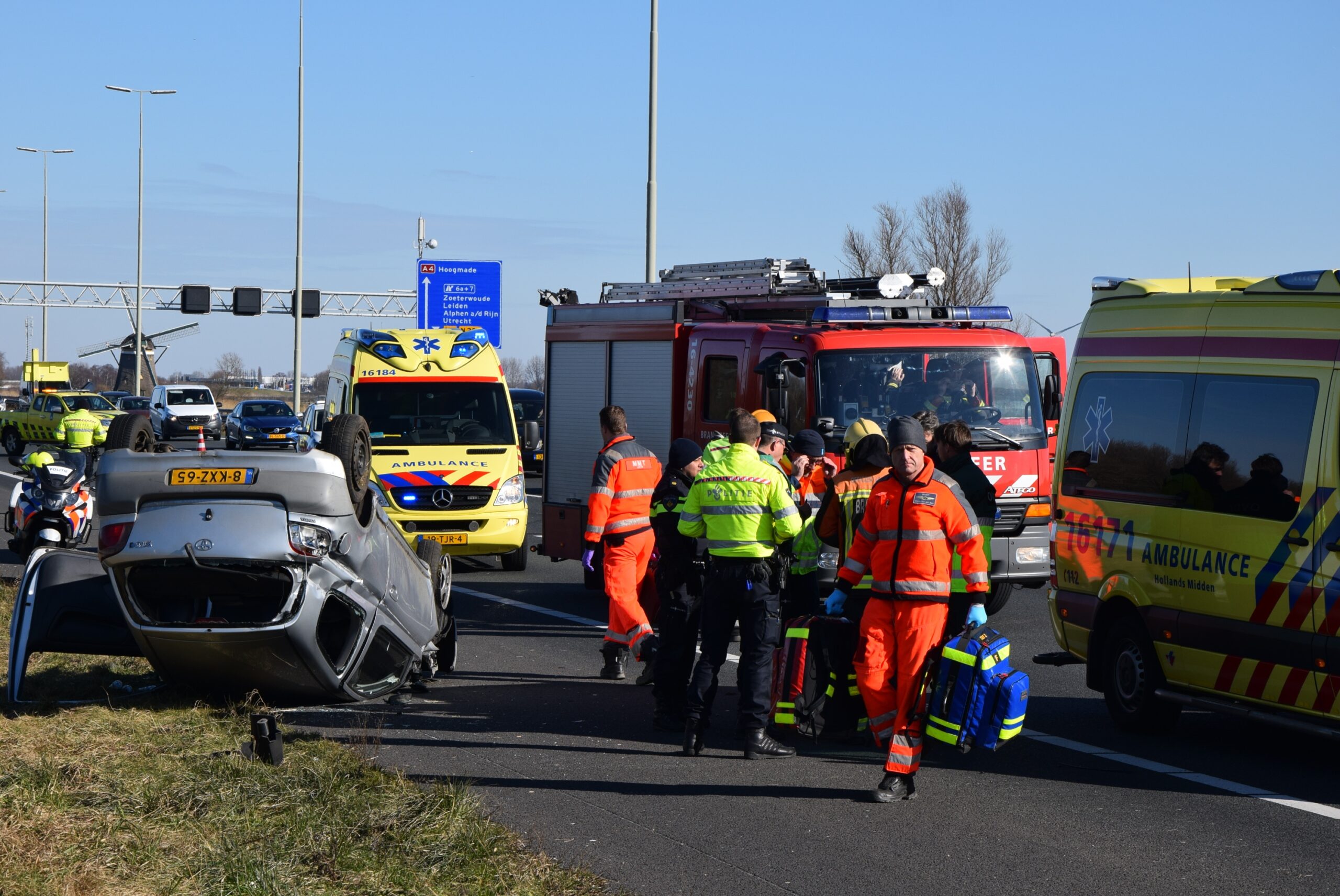 Zondagmiddag is rond 12.15 uur twee gewonden gevallen bij een aanrijding tussen meerdere voertuigen op de A4 bij Leiden. Bij de botsing kwam een auto ondersteboven op de vluchtstrook terecht. Naast politie, ambulance en brandweer kwam ook een Mobiel Medisch Team ter plaatse. De slachtoffers zijn per ambulance overgebracht naar het ziekenhuis.
