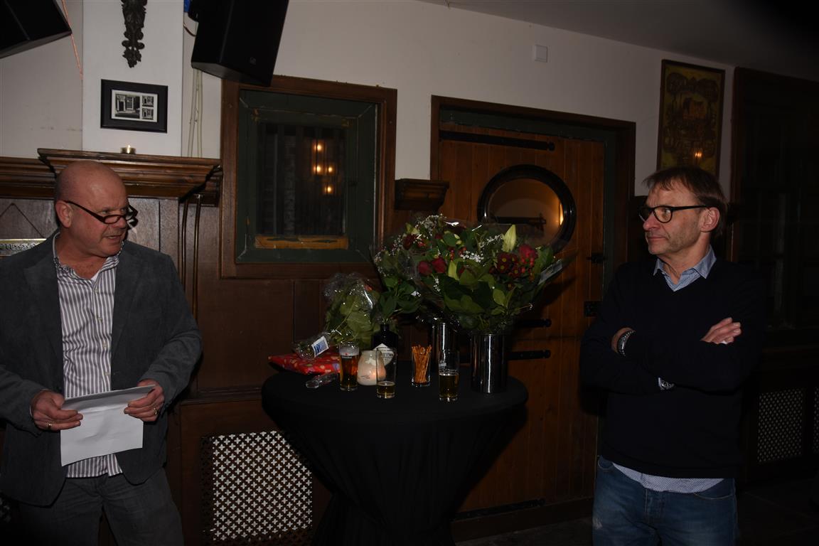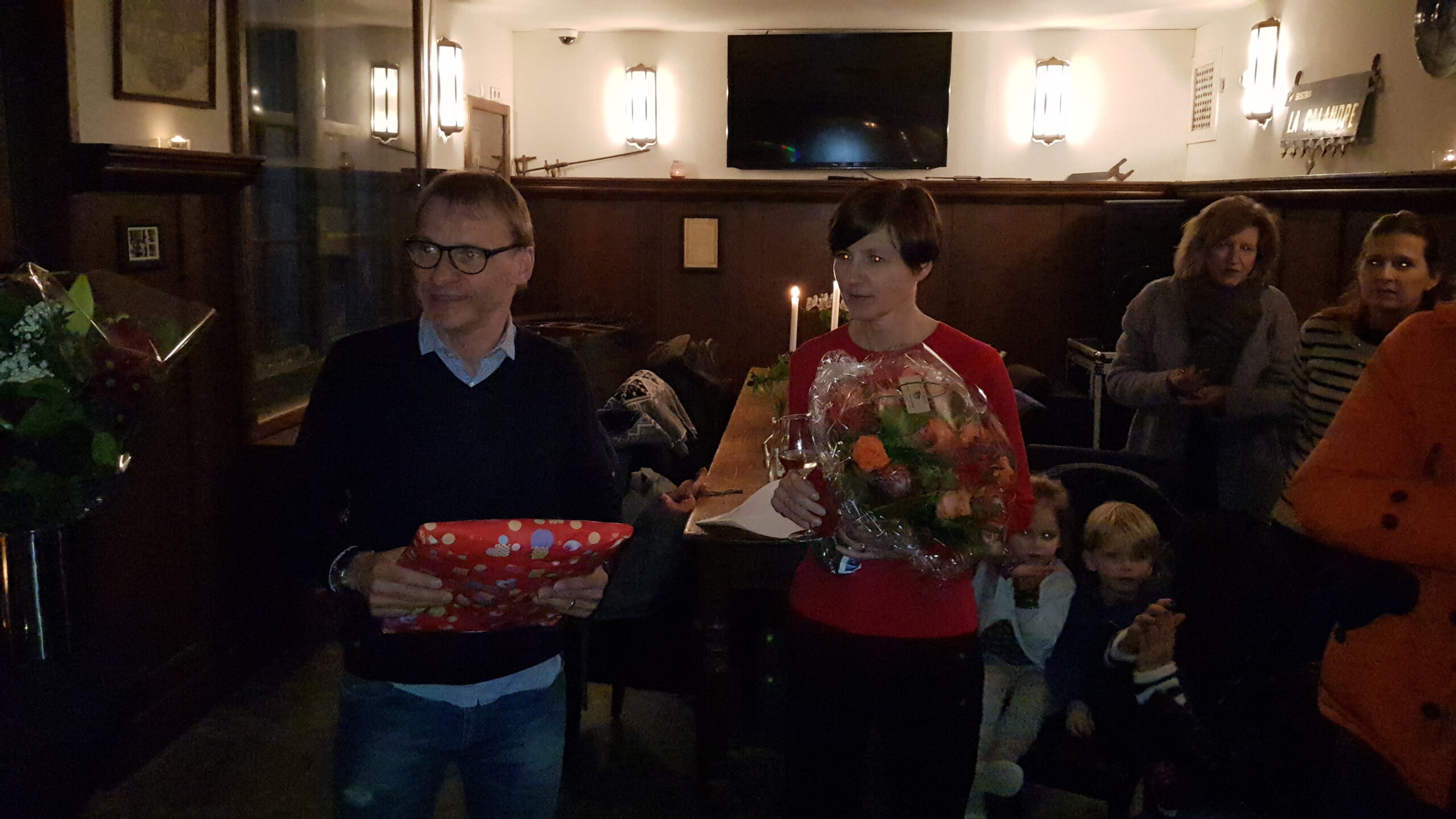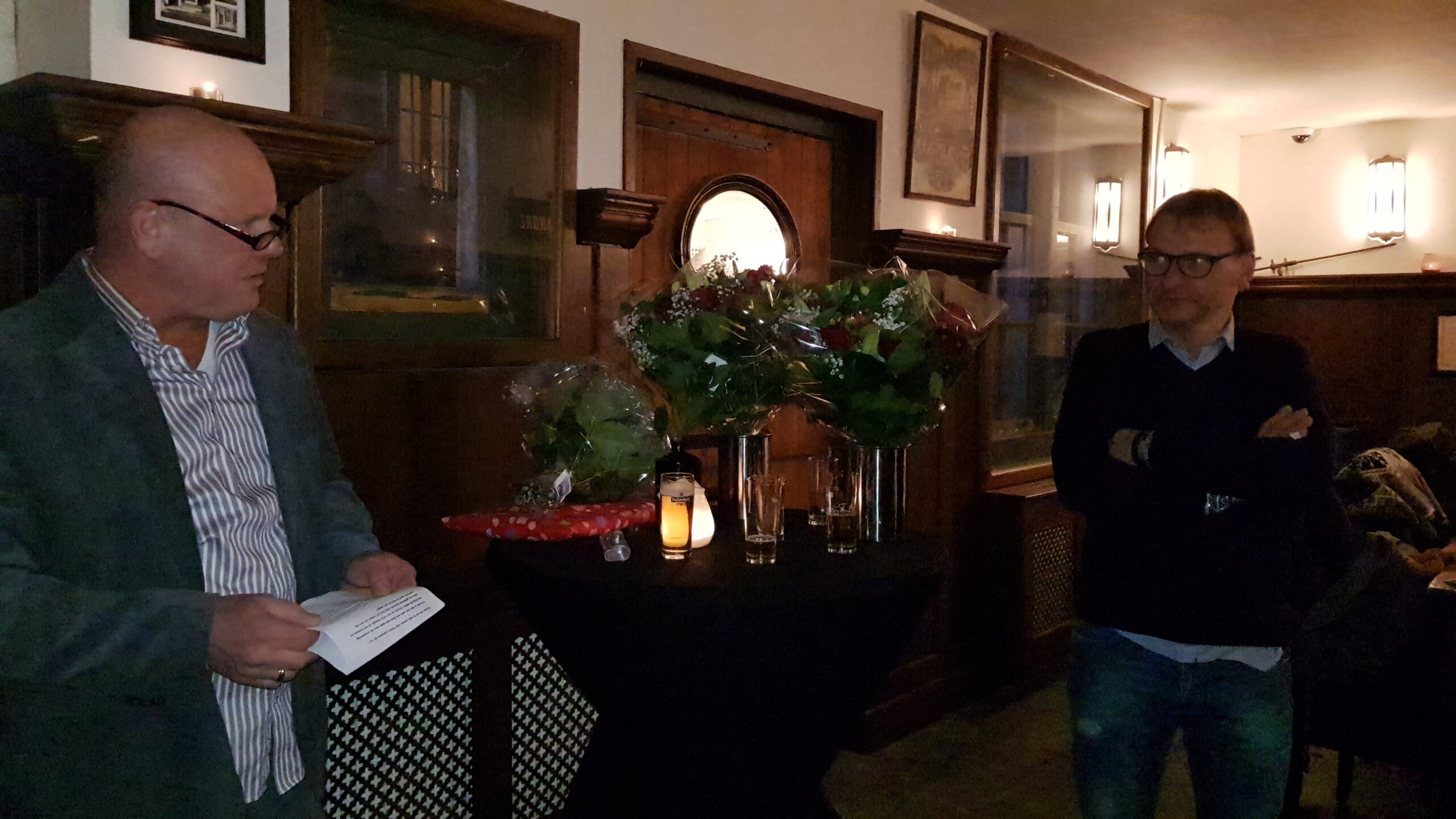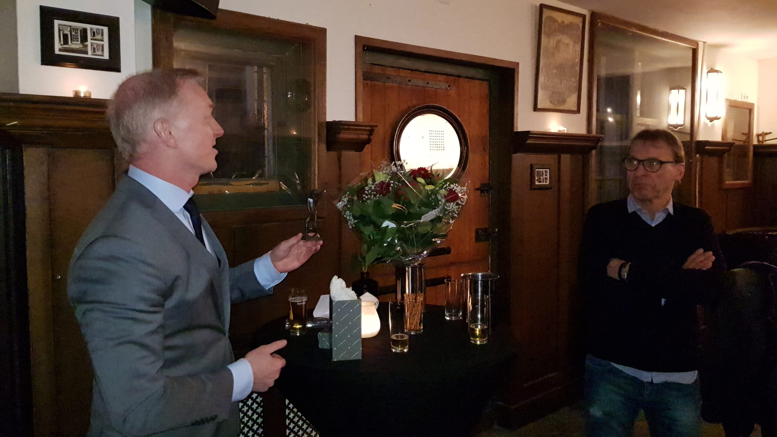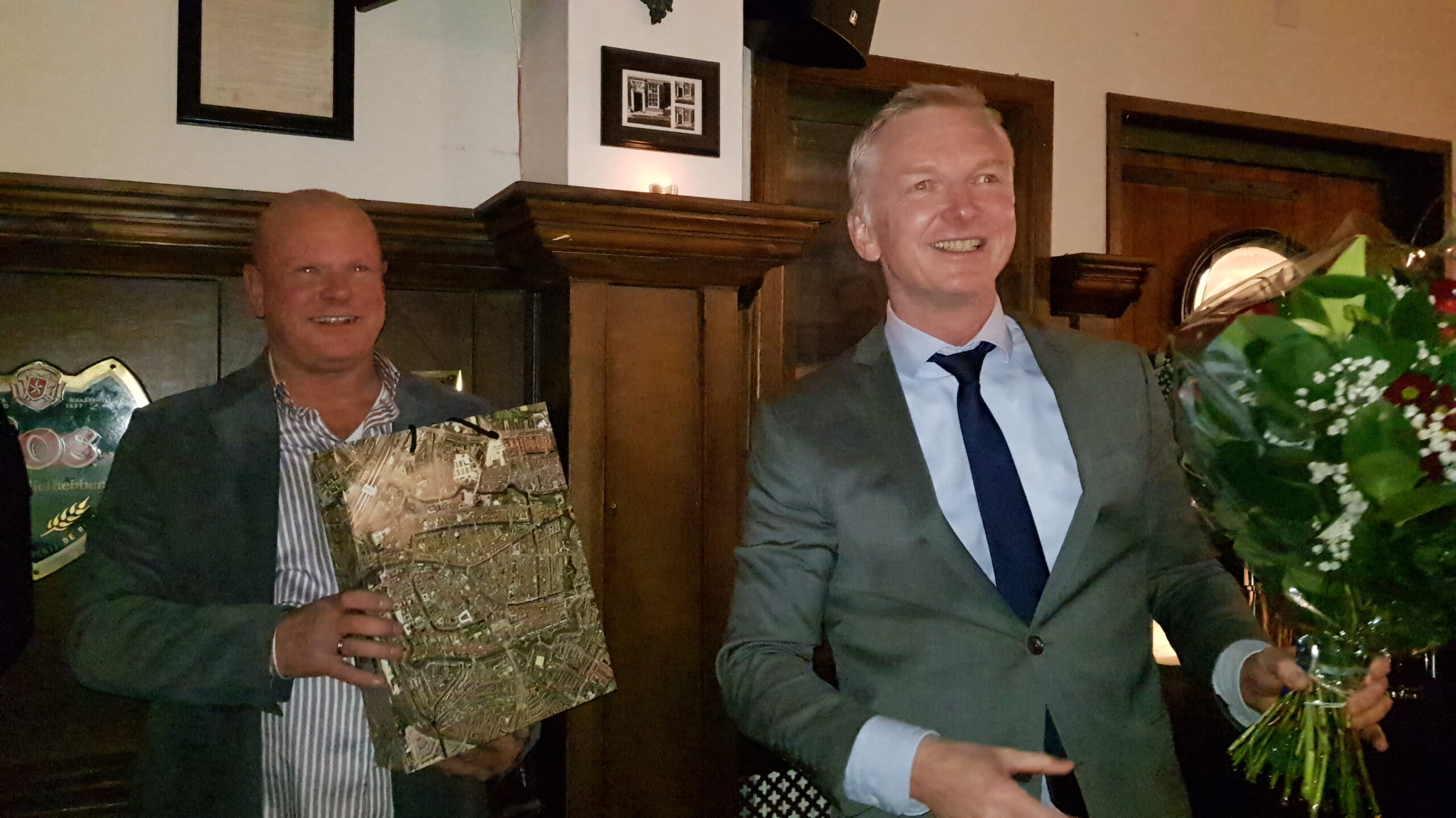 Tijdens een door collega-winkeliers georganiseerd afscheidsfeestje in Café de Vergulde Kruik in de Haarlemmerstraat heeft Jack Dambrink zaterdagavond het Cornelis Joppenszoon beeldje van de gemeente Leiden ontvangen uit handen van locoburgemeester en wethouder Bereikbaarheid, Economie, Binnenstad en Cultuur Robert Strijk.
