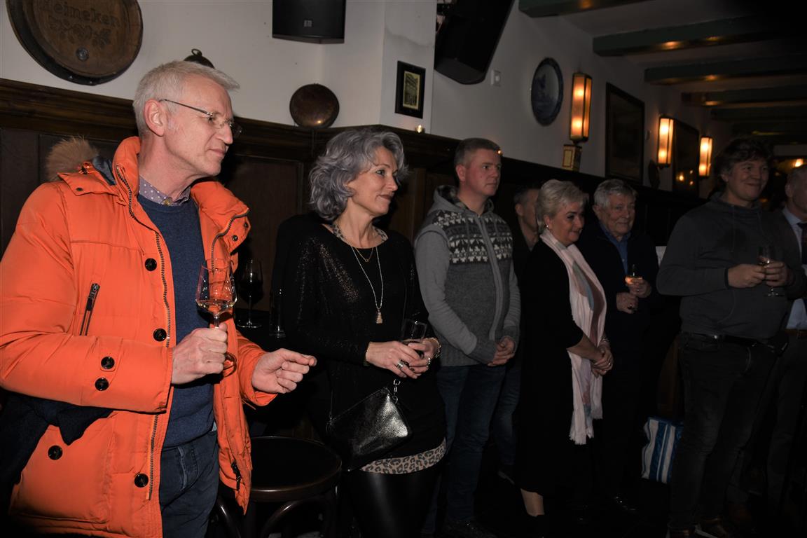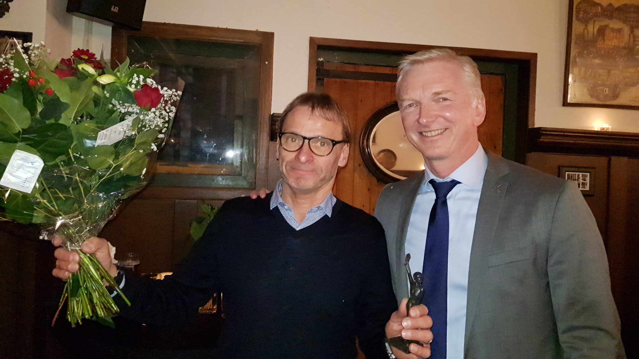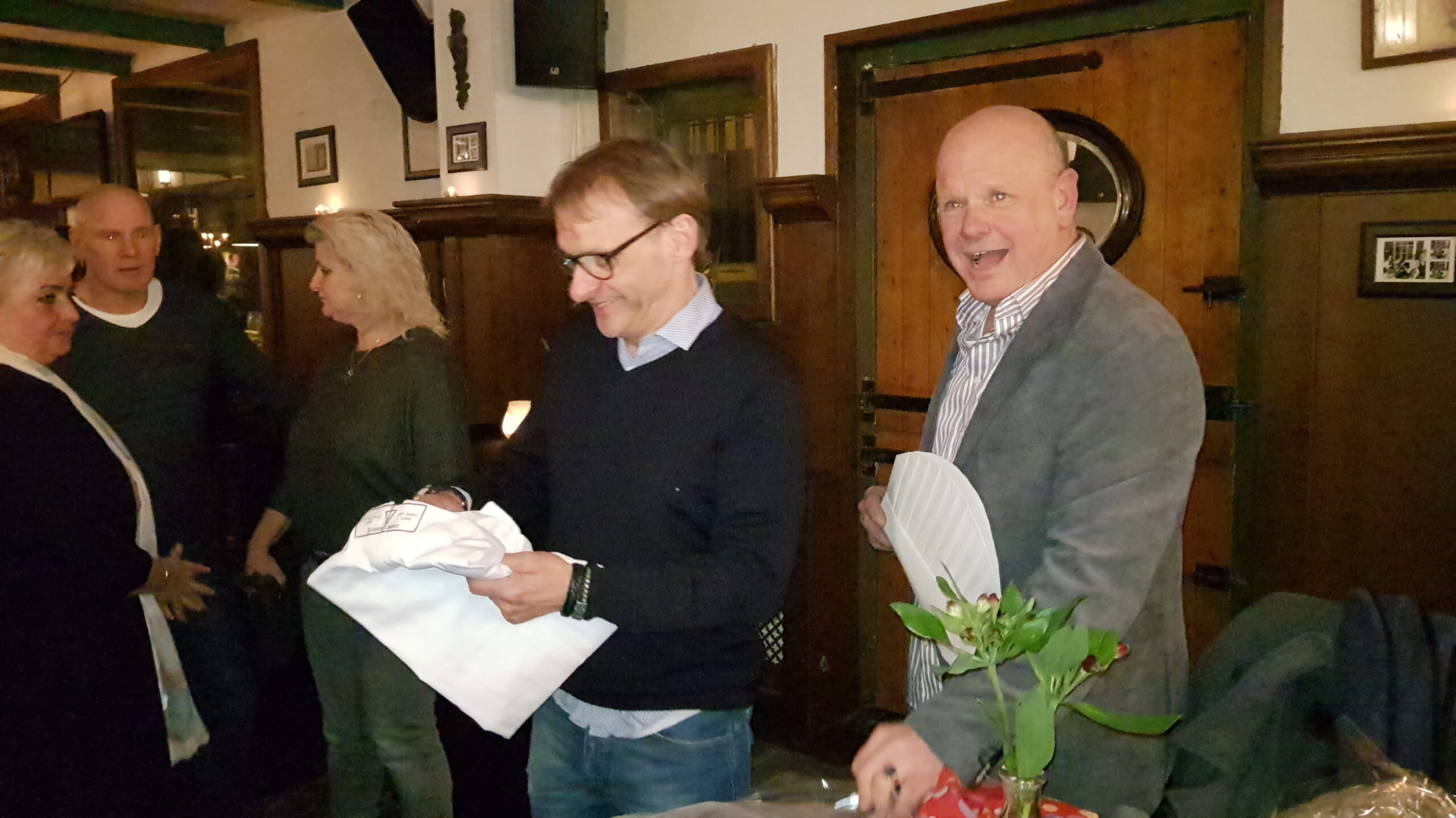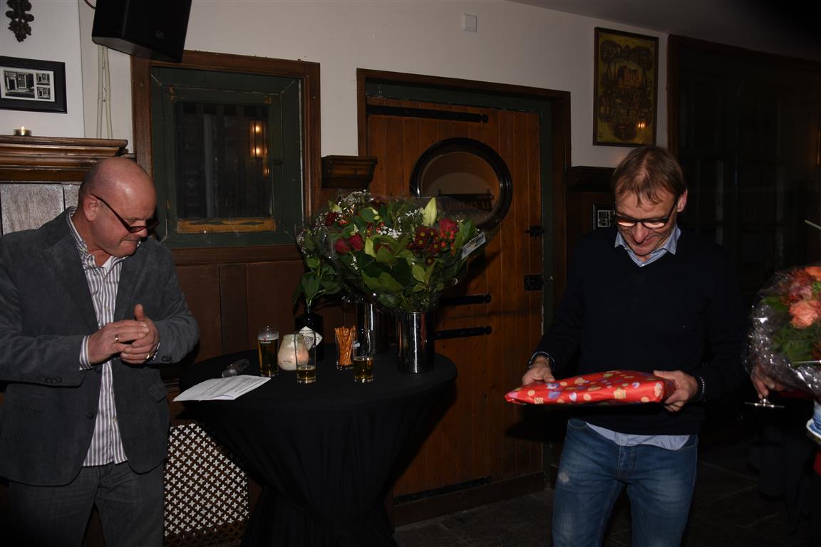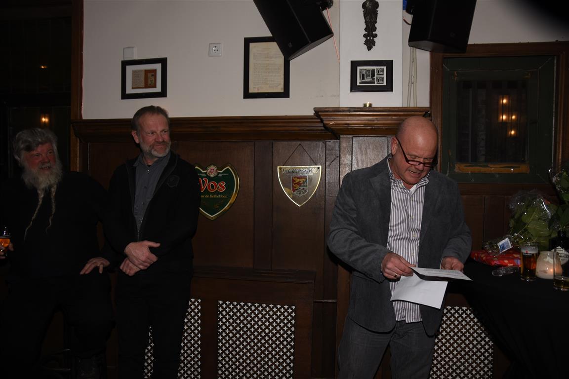 Tijdens een door collega-winkeliers georganiseerd afscheidsfeestje in Café de Vergulde Kruik in de Haarlemmerstraat heeft Jack Dambrink zaterdagavond het Cornelis Joppenszoon beeldje van de gemeente Leiden ontvangen uit handen van locoburgemeester en wethouder Bereikbaarheid, Economie, Binnenstad en Cultuur Robert Strijk.
