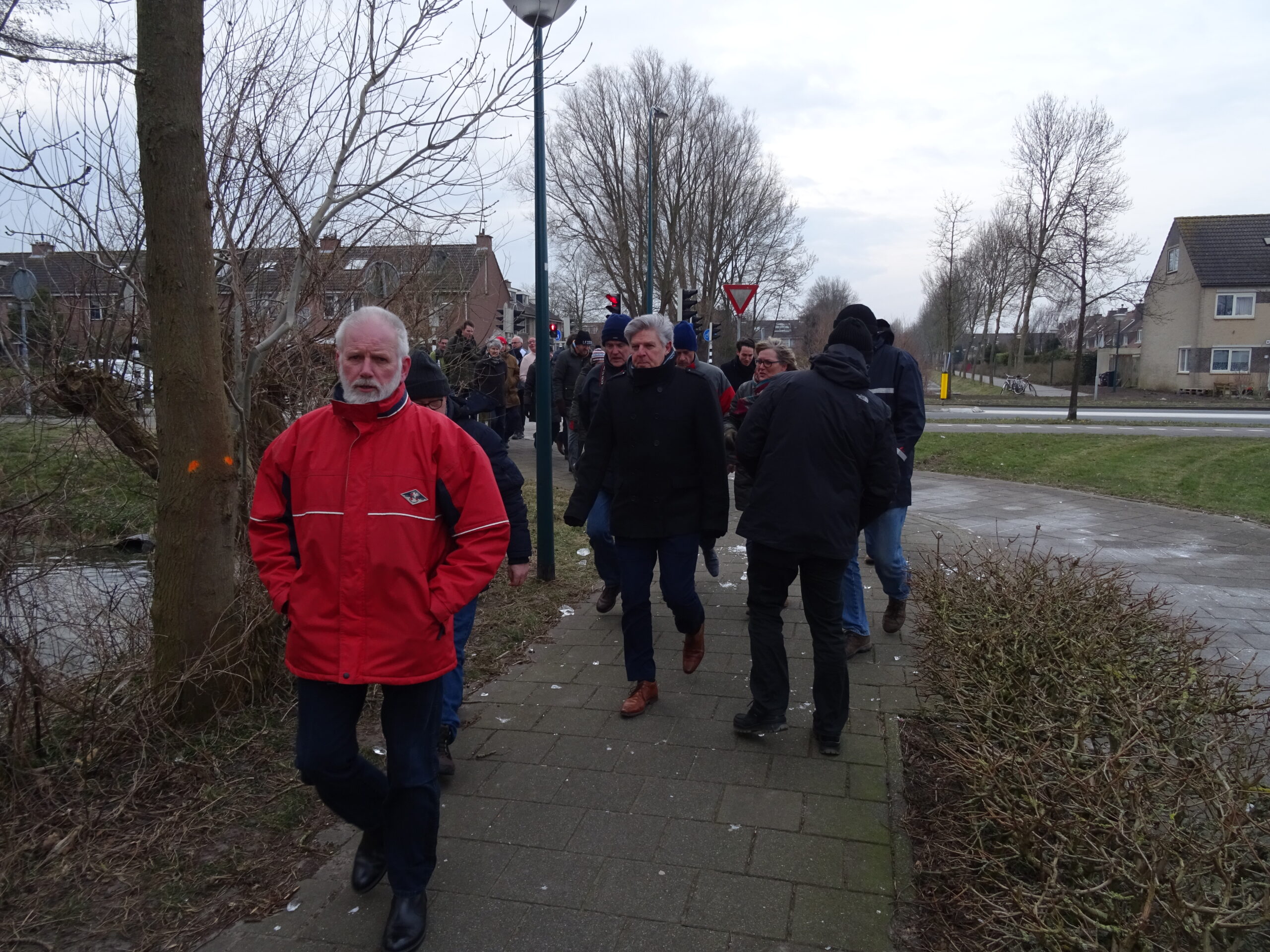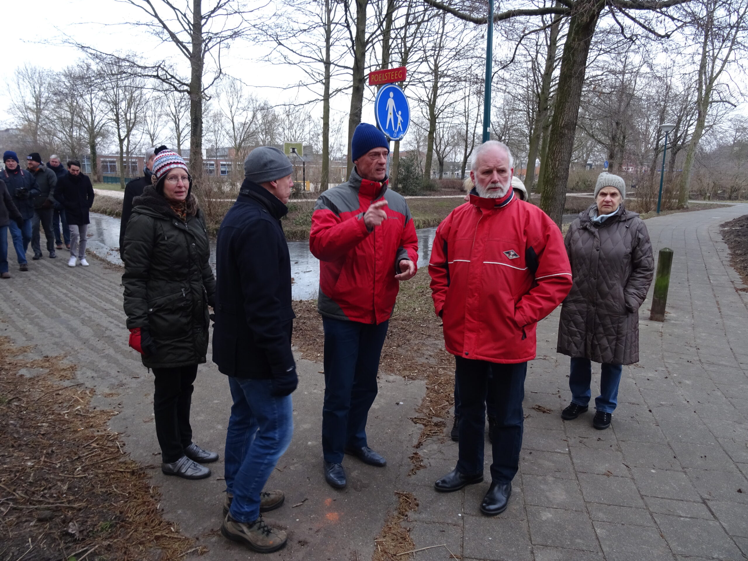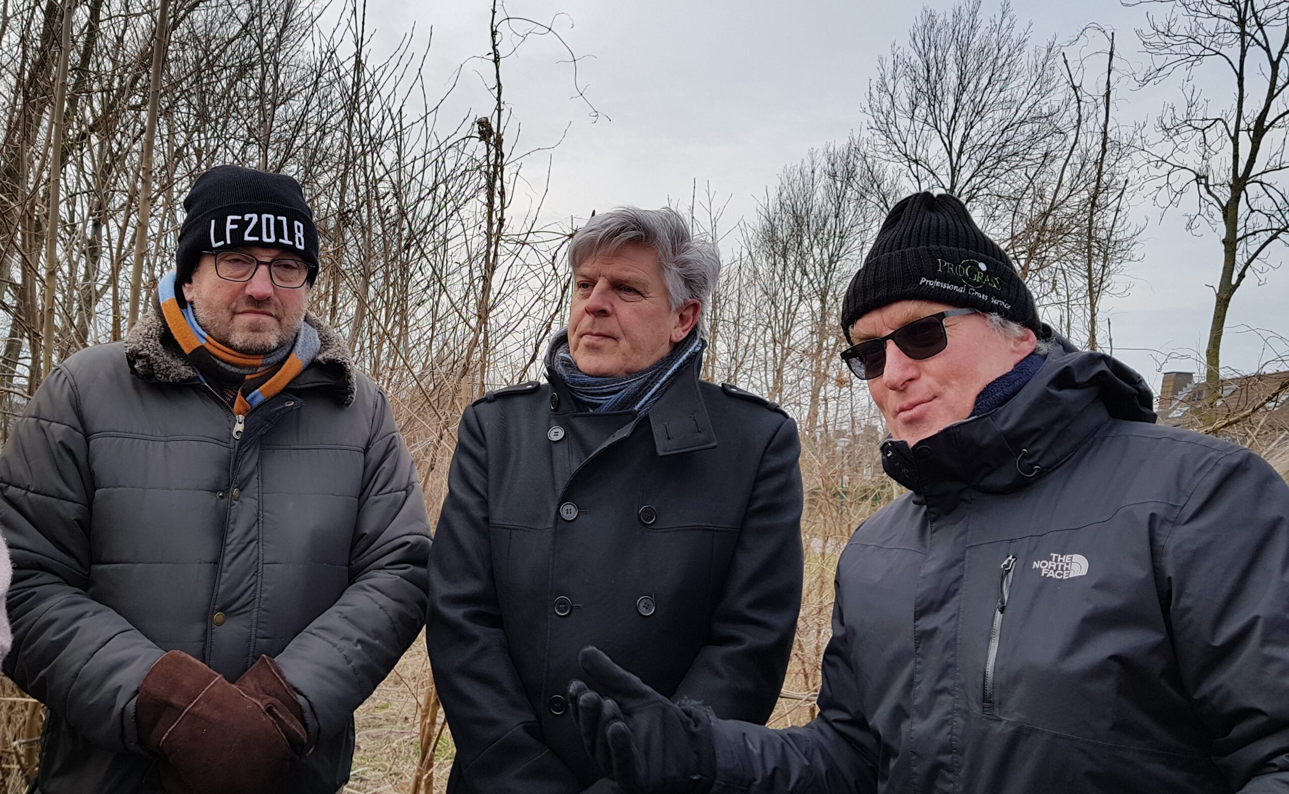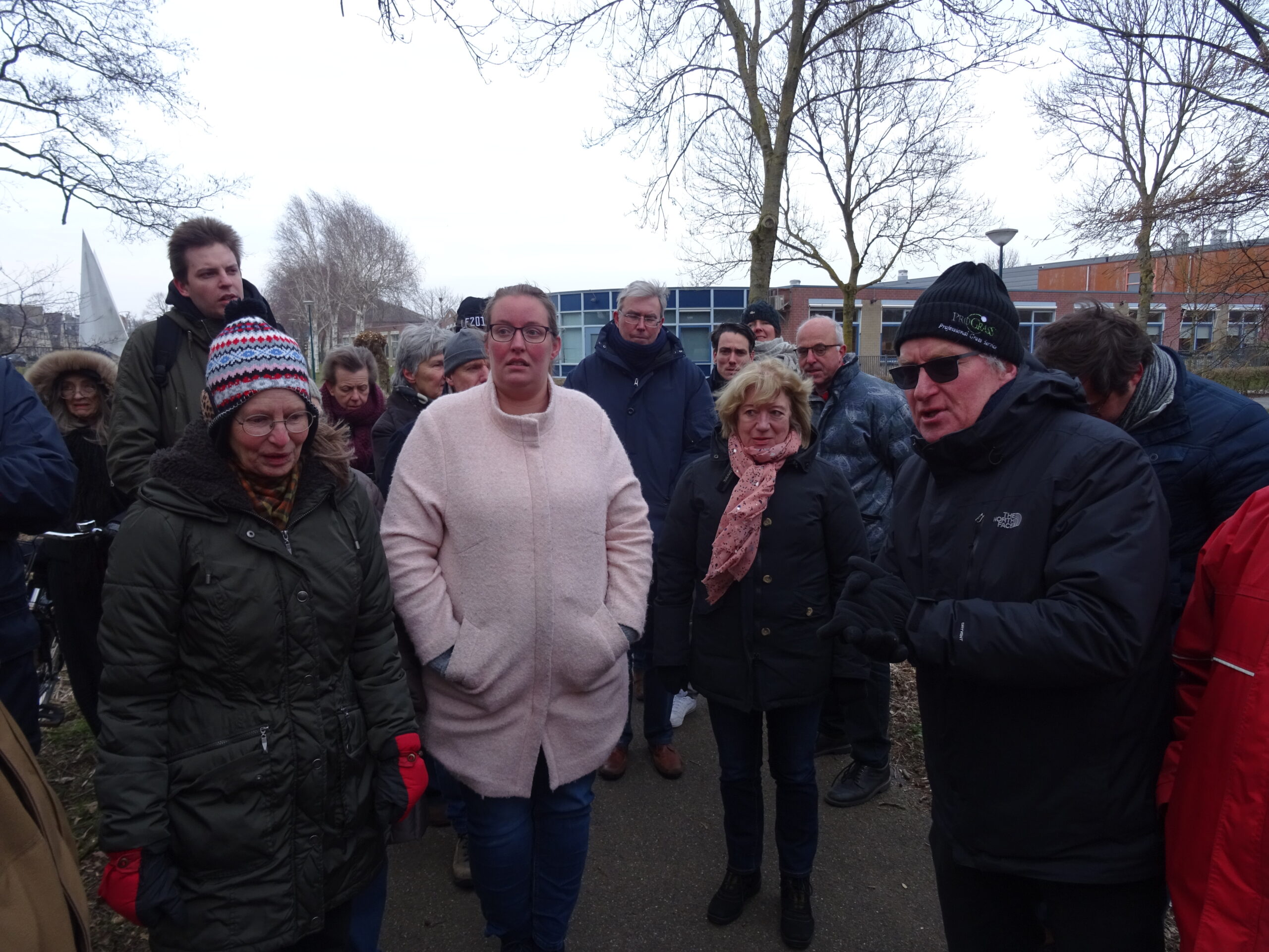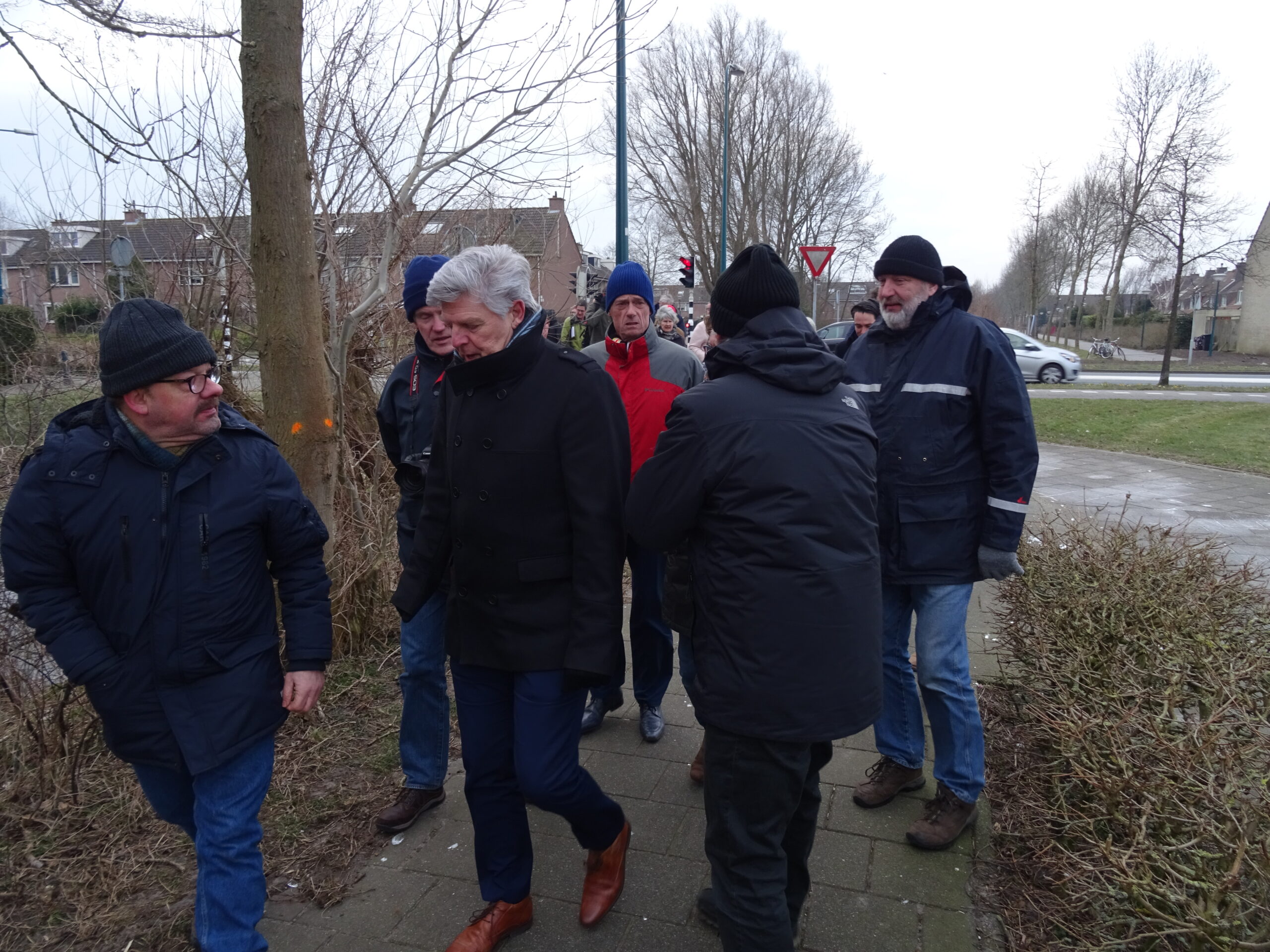 Chris de Waard trotseerde samen met voor- en tegenstanders van de bomenkap de vrieskou en liep met de wethouder en zijn ambtenaren mee langs de houtwal waar momenteel wordt gewerkt.