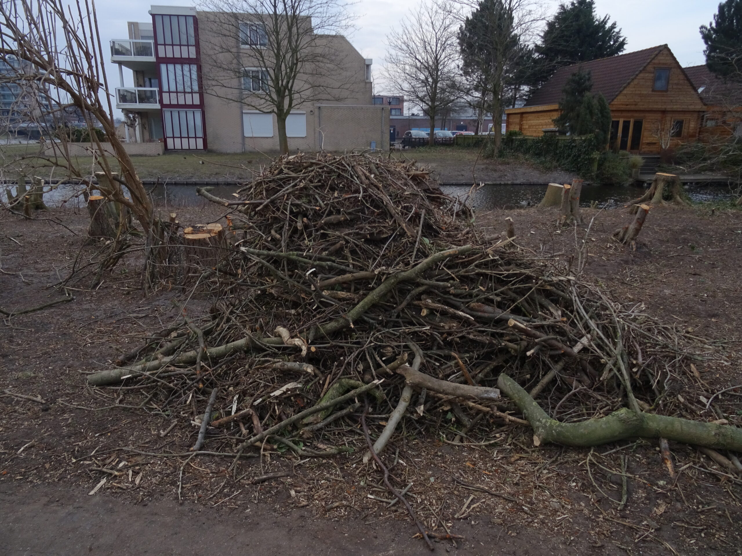 Roeffen: “Beplanting op een waterkerende houtwal zoals hier in de wijk mag niet hoger zijn dan vijf meter. De reden daarvoor is dat een hogere boom die omwaait forse schade kan veroorzaken aan de dijk en dat is gevaarlijk.” De wethouder legde tegenstanders van het uitvoeren van het ‘achterstallige onderhoud’ uit dat het terugsnoeien ervoor zorgt dat de houtwallen juist mooier en voller worden. Door de hoge bomen af te zagen krijgen ze weer uitlopers, kale plekken worden beplant met heesters.