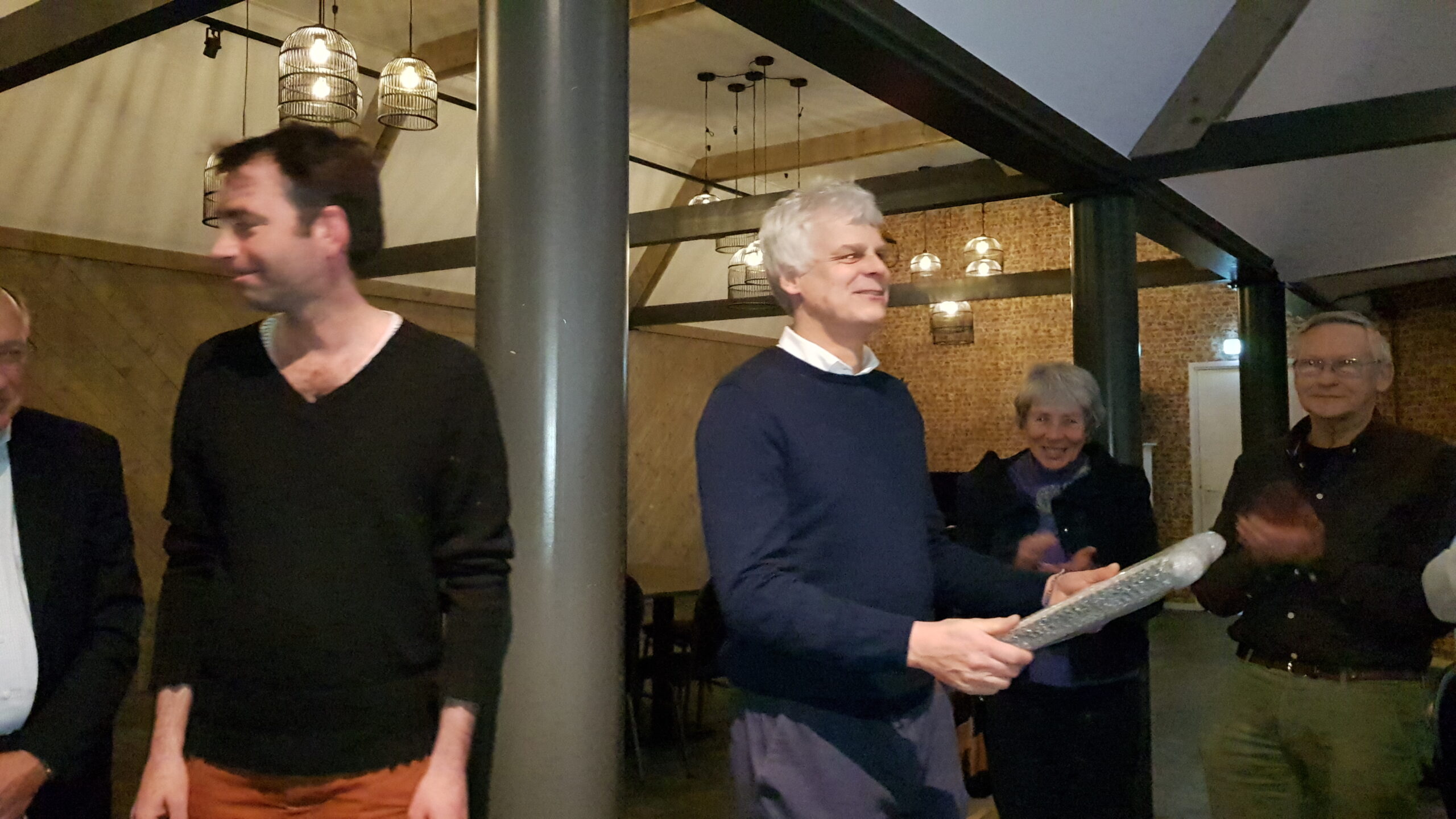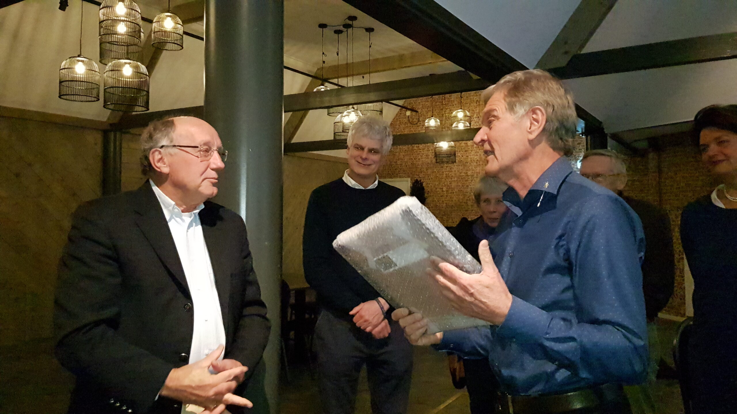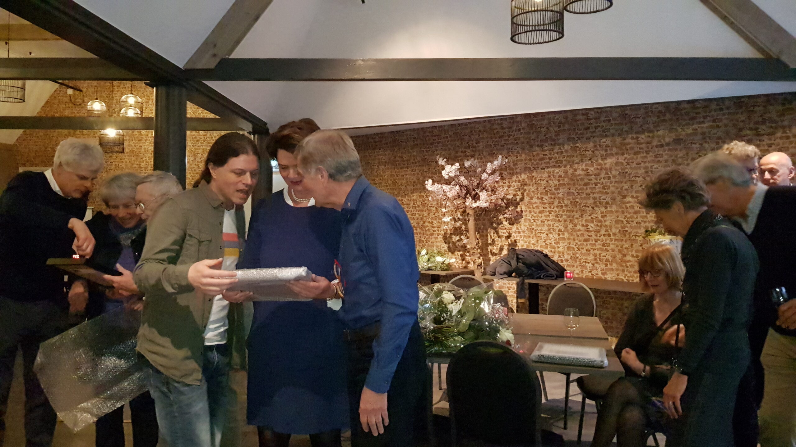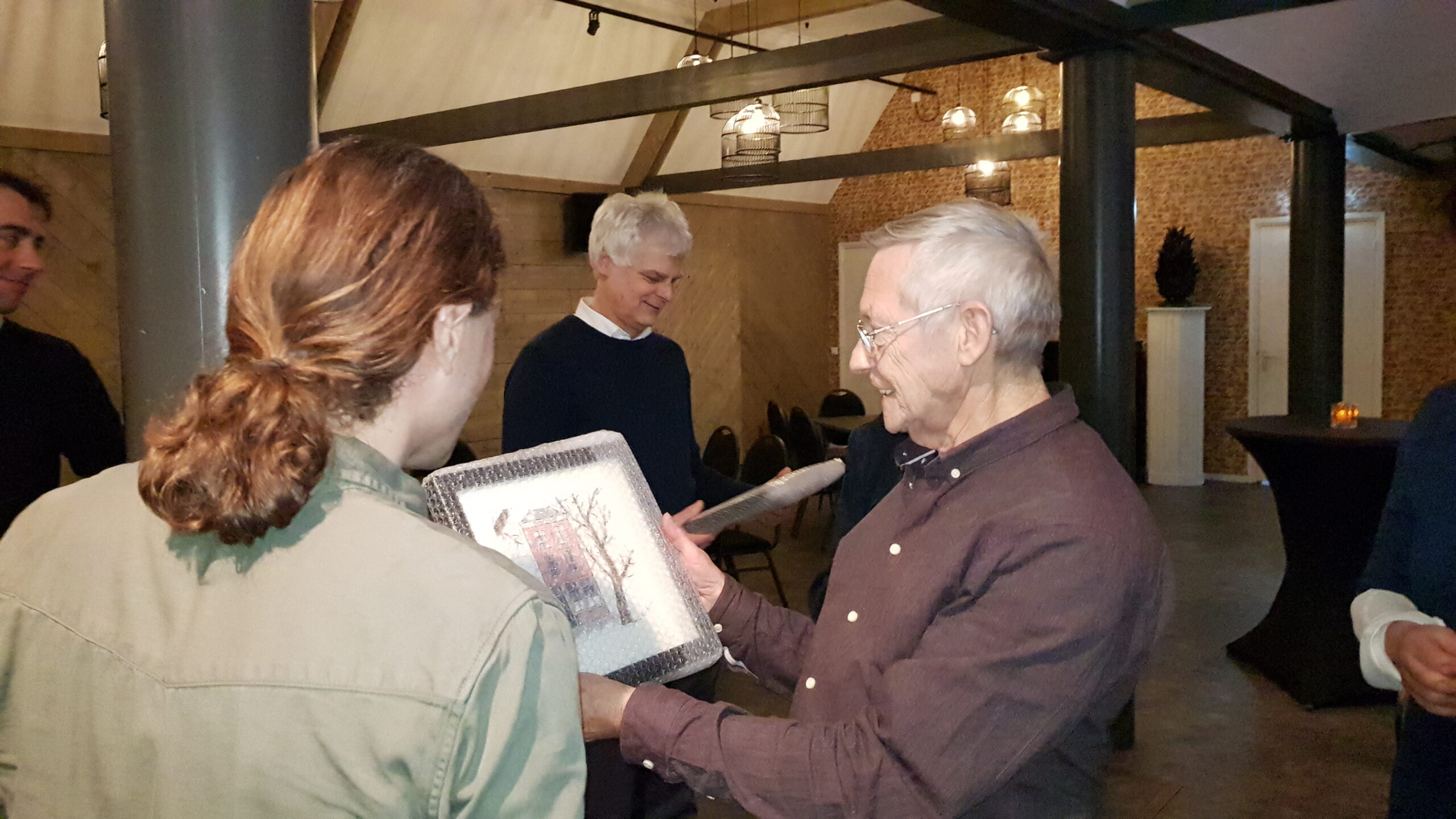 Sleutelstad was aanwezig bij het afscheid van Jaap van Meijgaarden als voorzitter van wijkvereniging Pancras West. Na 30 jaar. Uit handen van locoburgemeester Marleen Damen ontving hij daarbij de Gouden Speld van de gemneente Leiden. Ook drie andere bestuursleden traden met hem af. Zij kregen een Leids boeket van de wijkwethouder en een origineel cadeau van hun opvolgers. Een afbeelding van hun woning.